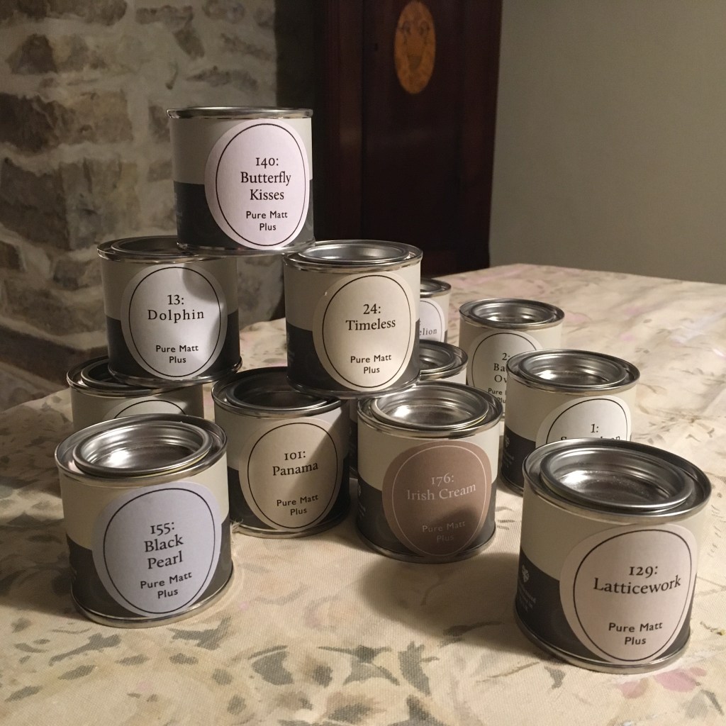 The poor weather has resulted in one good thing – we’ve finally started looking at the paint colours for the farmhouse. After the first few pots, we did wonder what the difference between the various samples were, but I’m glad to say they’ve dried with differences – albeit subtle! It’s hard to judge what the final colour will look like on the walls, as the current lighting is pretty dim, so we’re having to use our imagination. We’re aiming for an airy, rustic look, so have started with pale, warm colours. The solid walls add an extra complexity – and ££ on the paint price!! Hoping to get started on the white stairwells this weekend, at least that’s an easy colour to choose!