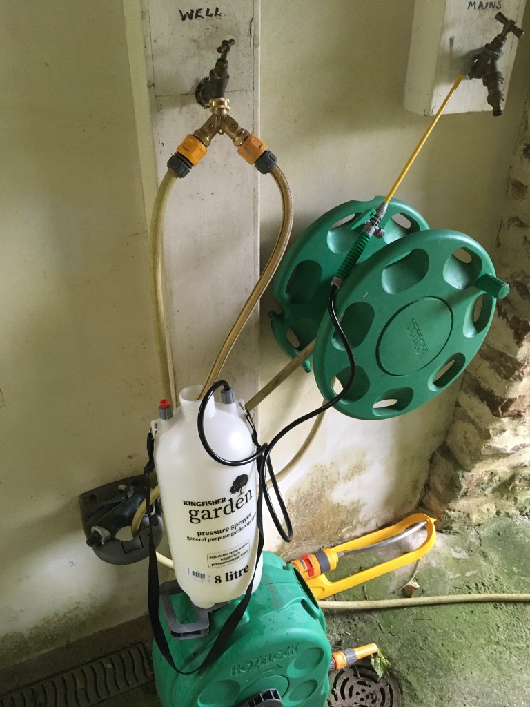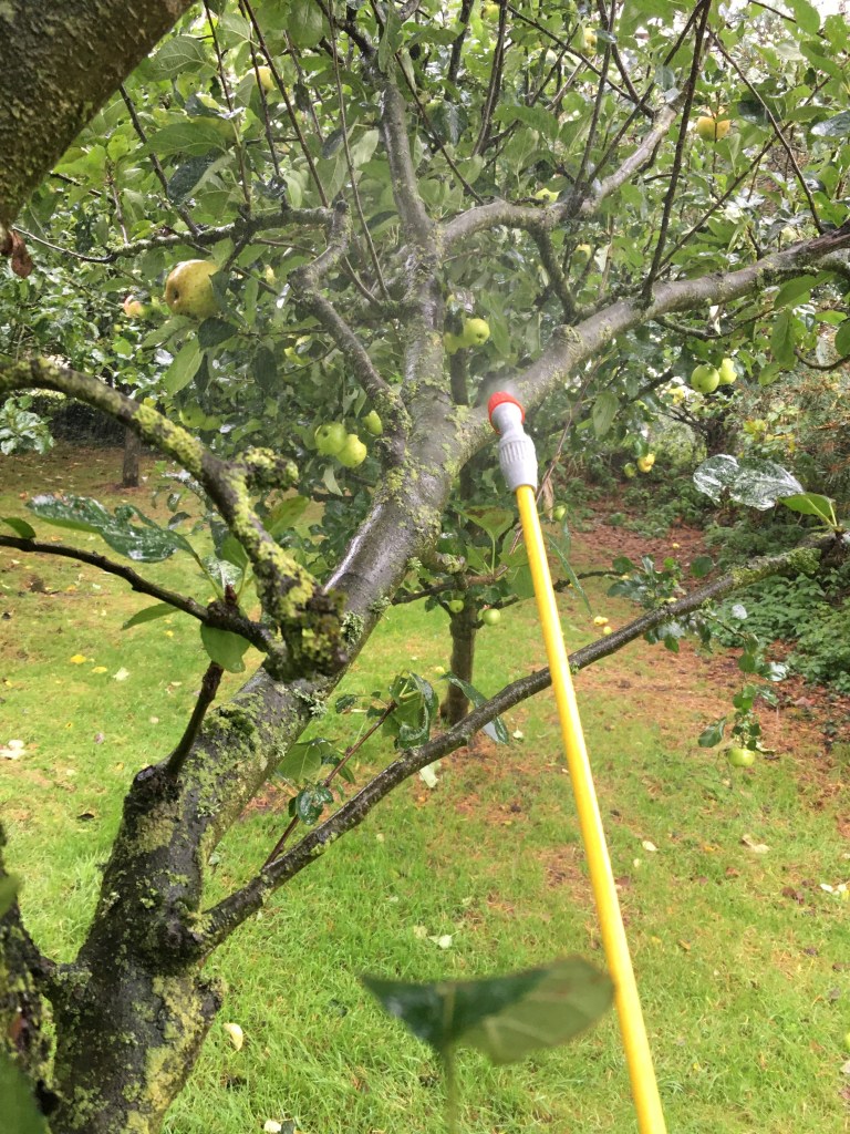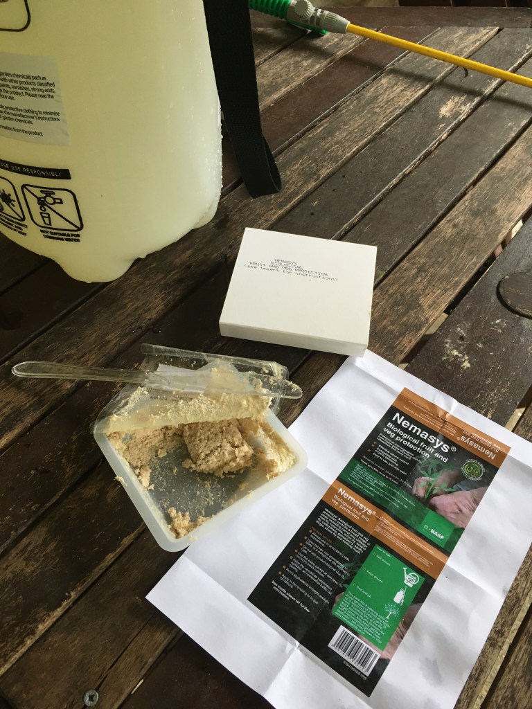 We had to brave the rain on Sunday however, to give some much-needed TLC to the orchard trees. Early on, we discovered an infestation of codling moth in our apple and pear trees – the larva buries into the fruit and starts to eat it from the inside. Much of the fruit is still salvageable, but it’s still pretty disappointing to peel an apple, only to find out that half of it’s wasted. We’ve invested in a biological control – nematodes (parasites that feed on the codling moth larva) – in an attempt to avoid pesticides. It took at least two hours to spray the first pack (of three) all over the main trunks, branches and underlying ground. It wasn’t particularly pleasant in the rain – so hoping for better weather over the next two weekends!!