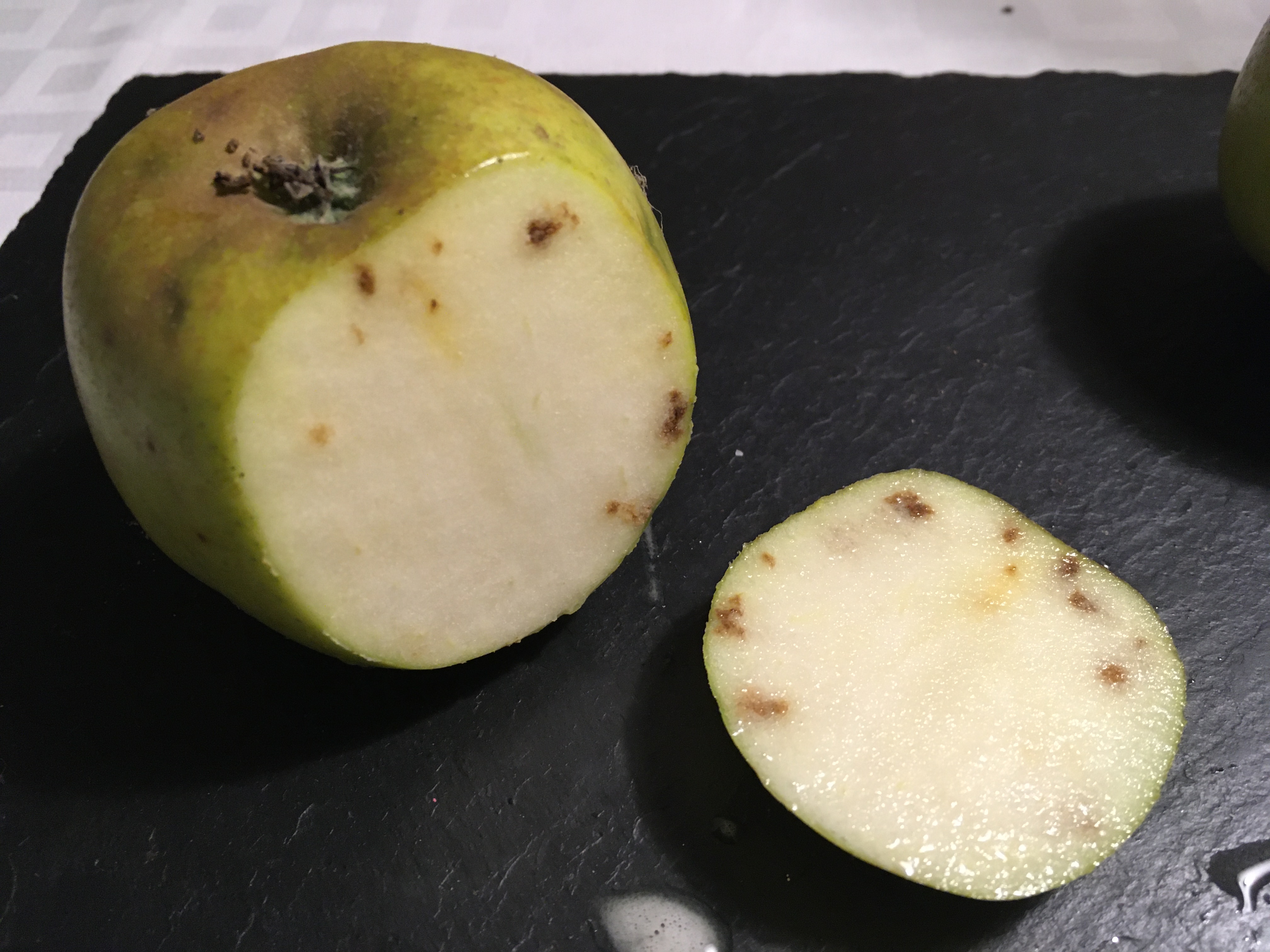 Today has been a further learning curve – with more problems and TLC required. We’ve identified three extra issues to sort – from brown spots caused by a lack of calcium (bitter pit); signs of a bug that seems to just cause superficial damage to the apple skin (capsid bug); and a more serious fungal infection in some of the tree branches.