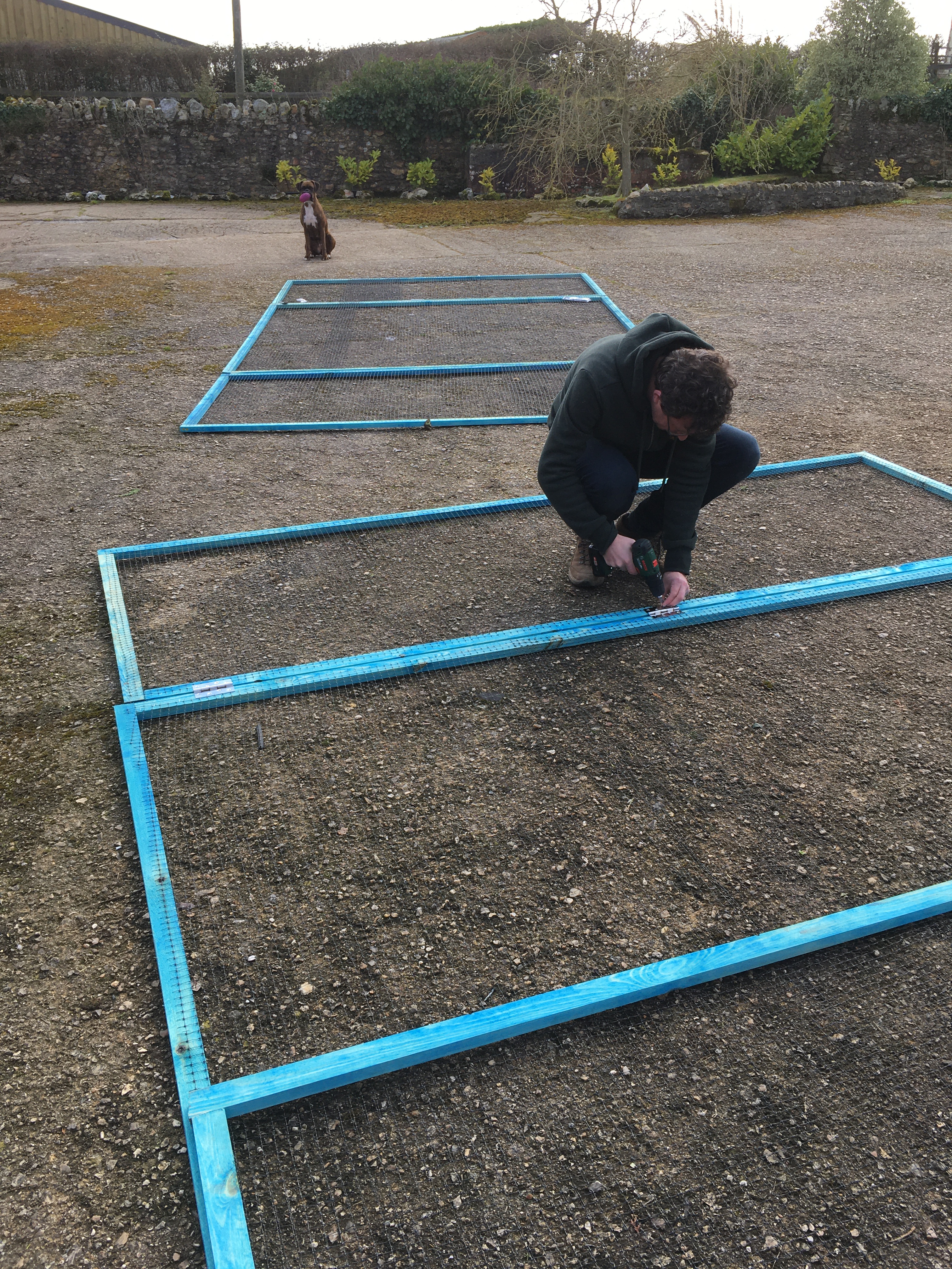 And we made some progress rabbit-proofing our kitchen garden! We started noticing holes in the orchard grass in the autumn, and knew something was up when the chard plants we brought from London started to disappear. And then in December, we spotted a visitor in our back garden! Thinking it was only interested in grass (and that it might save a bit of strimming!), we didn’t worry too much. But then a week ago, I spotted a smaller rabbit hopping around our terrace, right next to the house, and realised how brave they were getting!