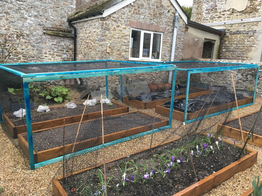 There’s no way we’ll ever be able to keep wildlife out of the garden, and having lived in London for so long, it’s actually nice to see the birds and animals hopping about. We decided it was up to us to keep them off the plants we wanted to protect, and so built our first two vegetable bed covers this weekend, designed to enable easy access to the beds for us, while keeping the rabbits and birds out.