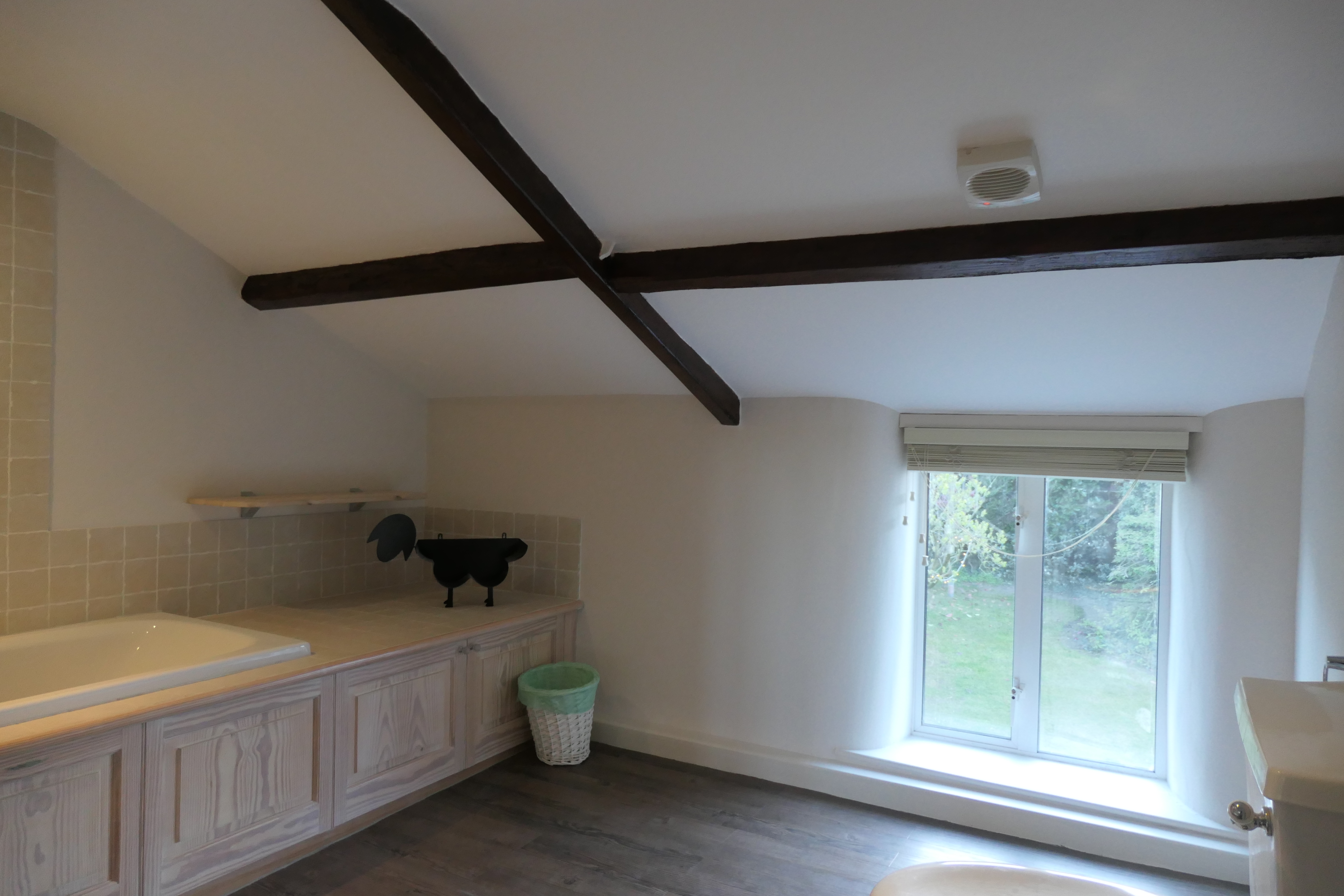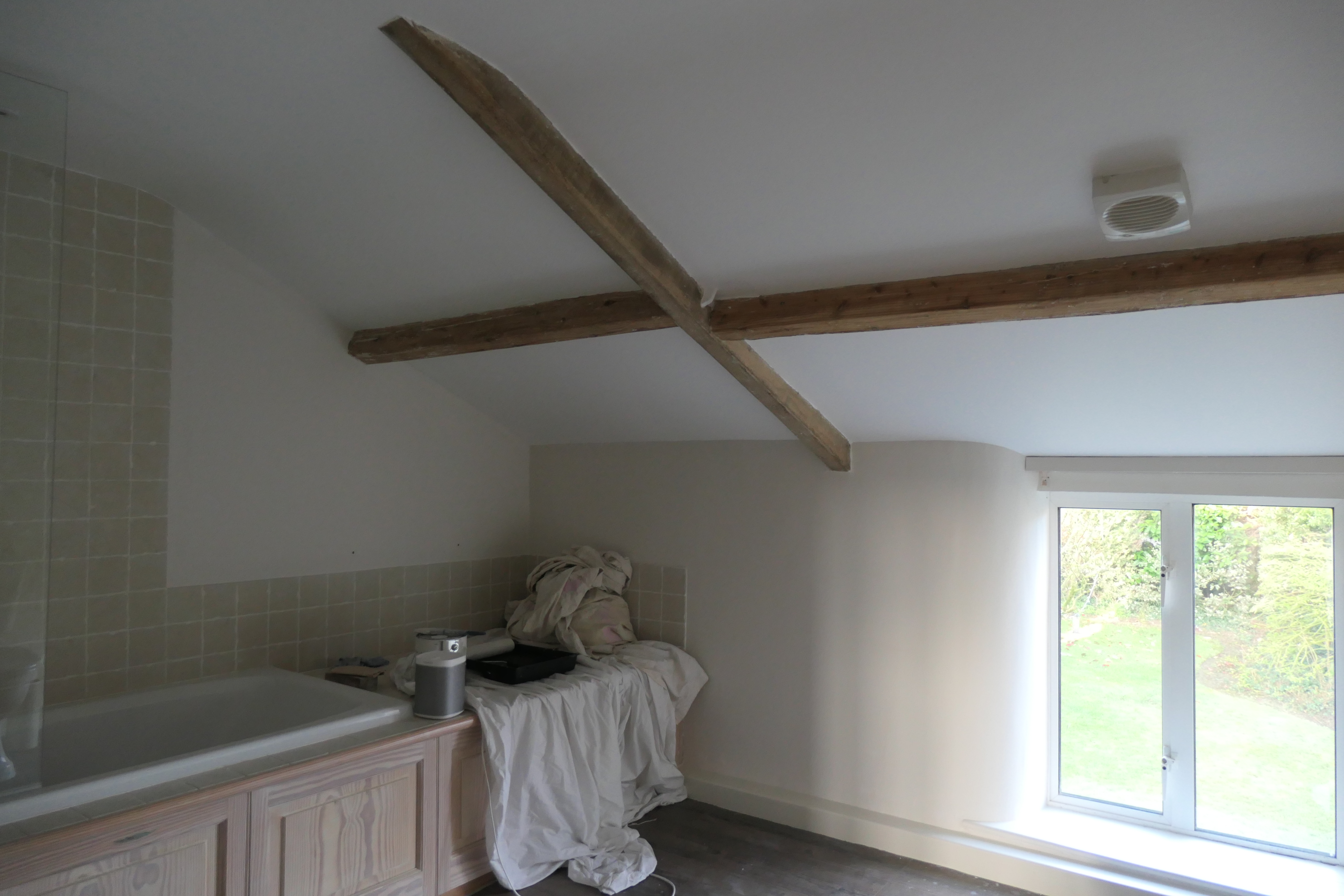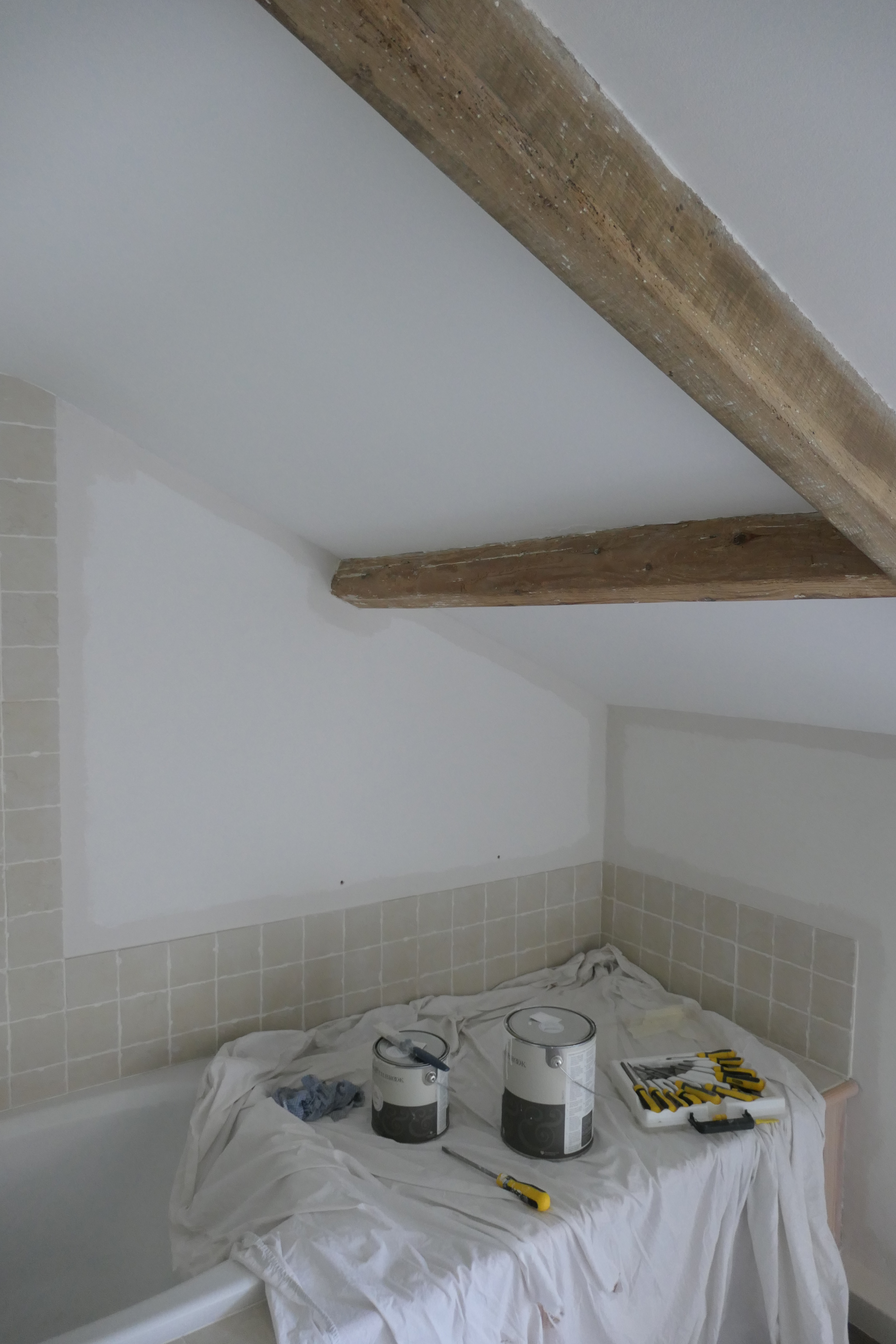 And we’ve finally made progress in the bathroom! It took four weekends to sand the paint off the beams (you may remember we started at the end of February), but two more weeks and we’ve given it almost a complete refresh of paint, changing the walls from white to Timeless, which is more in-keeping with the tiles. A few more weeks, and we should have woodwork completed and a new towel rail installed, to finish it off.