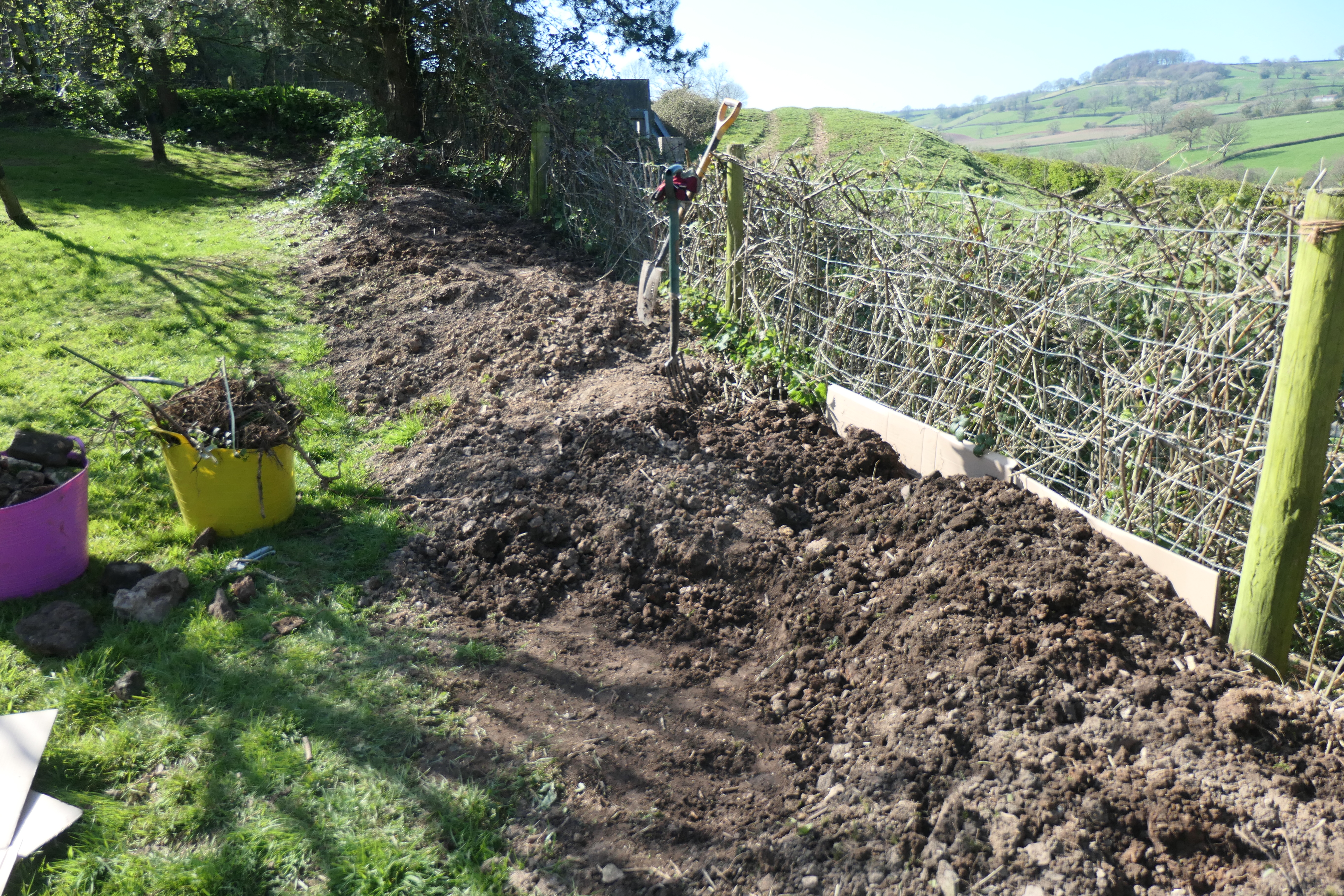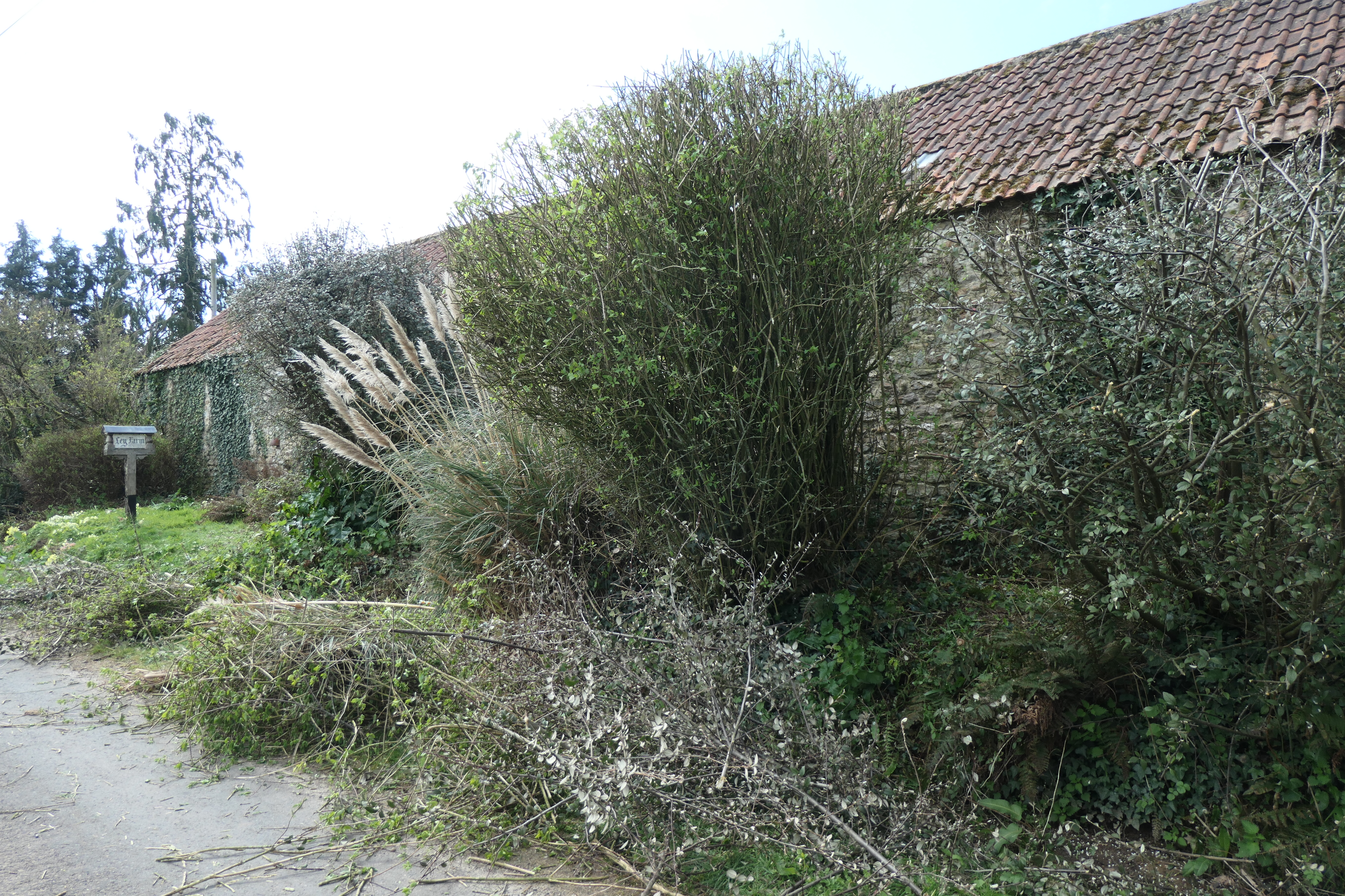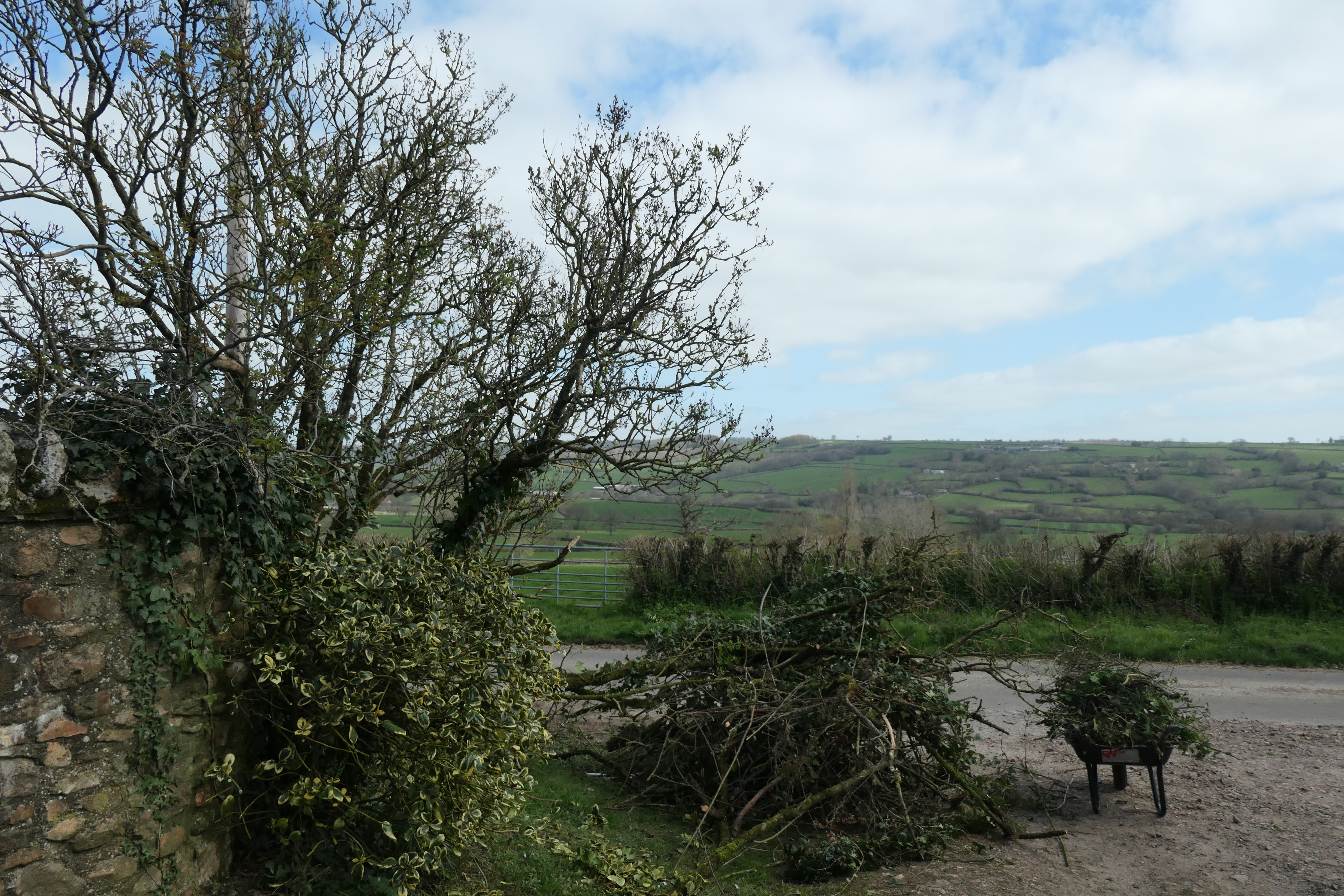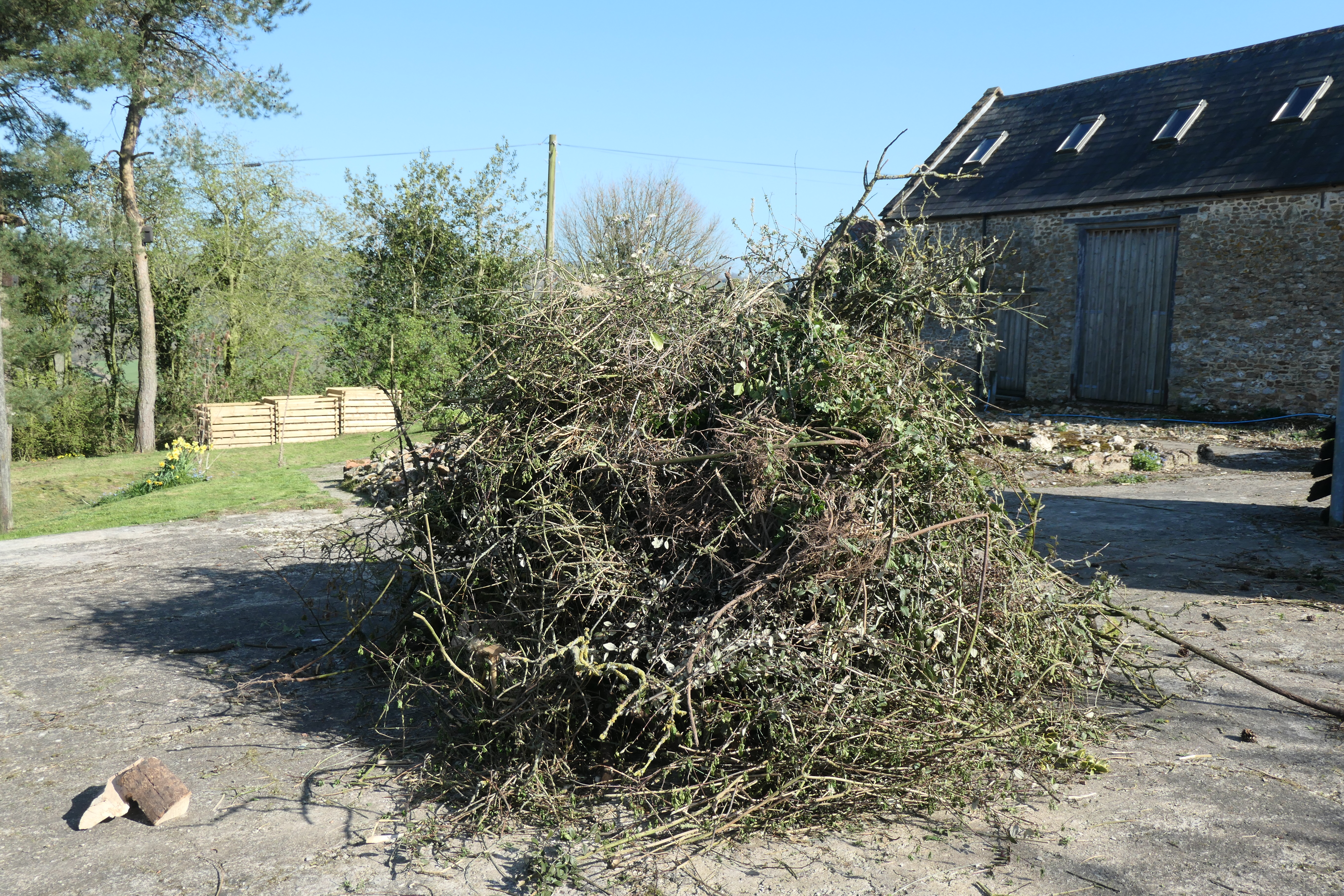 The nice weather on Saturday and Sunday gave us a chance to catch up on garden jobs too. The front of the property was overgrown with brambles and nettles, and the shrubs were practically taking over. So, spurred on by words of encouragement from our lovely neighbours, as well as the two cyclists who passed us at the start of their ride, and then four hours later as they returned, we turned the jungle into a more manageable state – digging up brambles (in the hope they never return!!), strimming the shrubs back, and removing most of a dead tree that was covered in thick ivy and clogging up the drainage channel that goes from our courtyard beneath the shippon and out down the hill. Our boundary is actually the wall of the shippon – the area outside the front is Highways property, but they’re never going to maintain it, and we want to show more of the old farm buildings and make the place look welcoming as people drive in. Although we did also find a large crack in the shippon wall behind the dead tree, so hopefully that can be repaired with minimal additional cost!