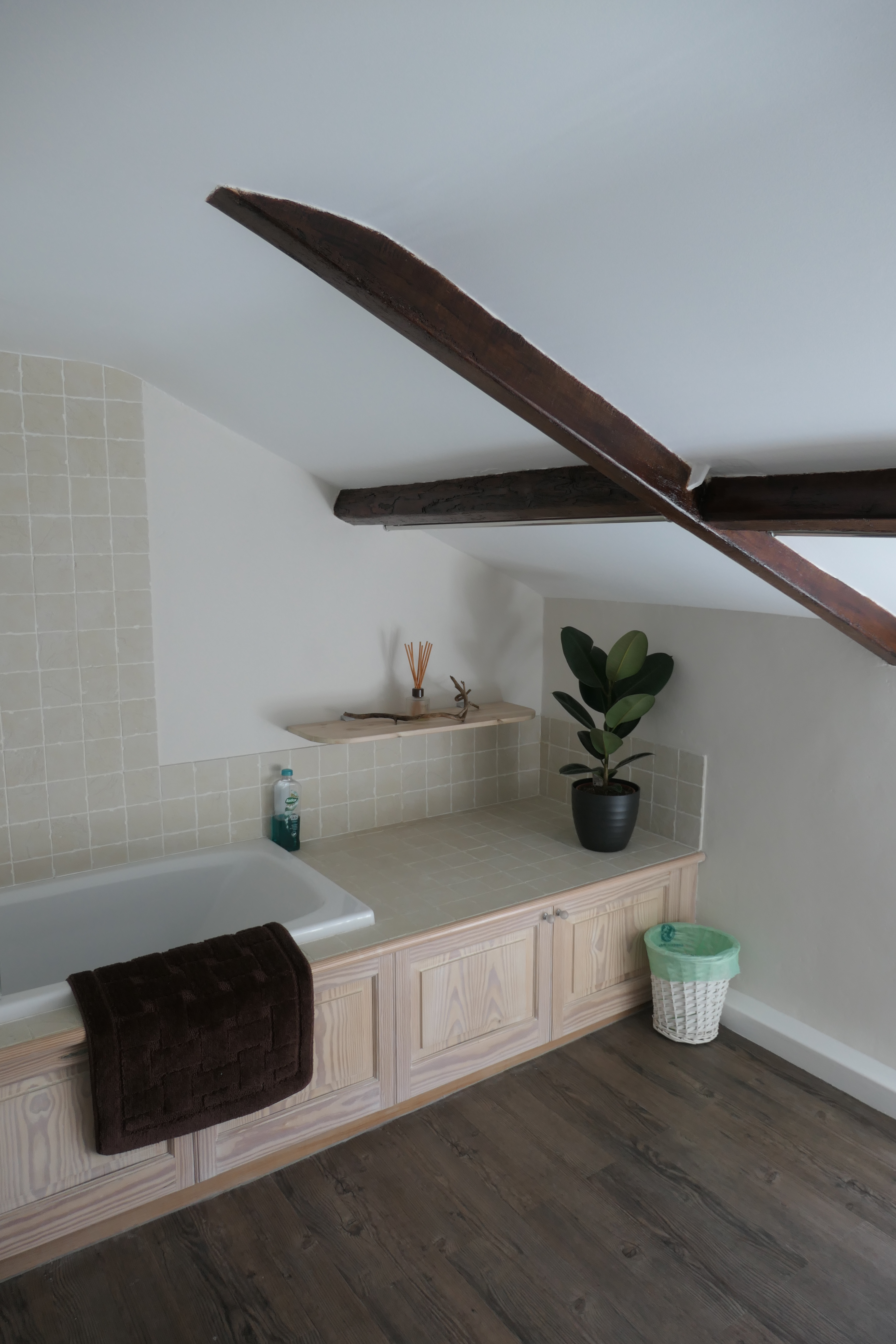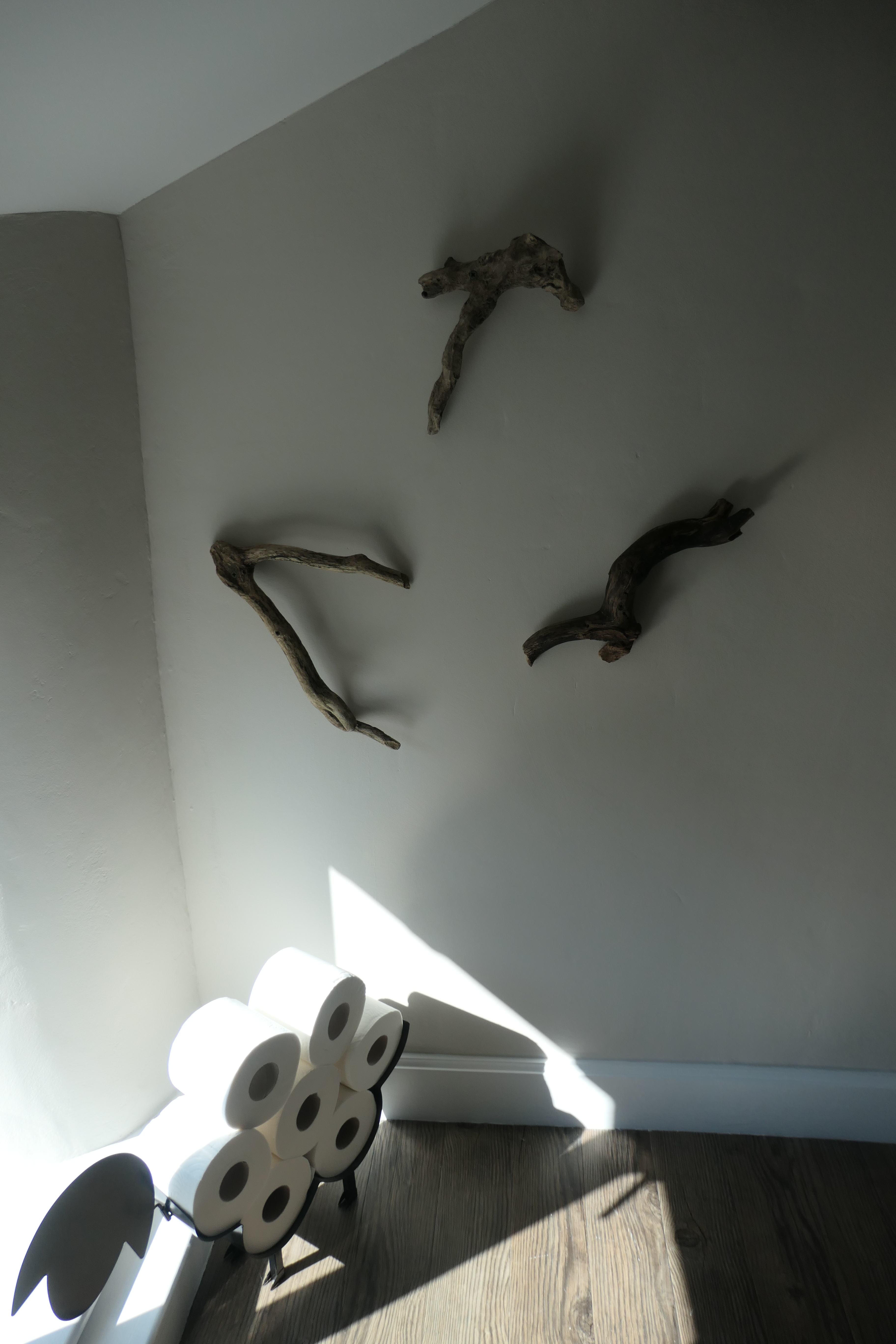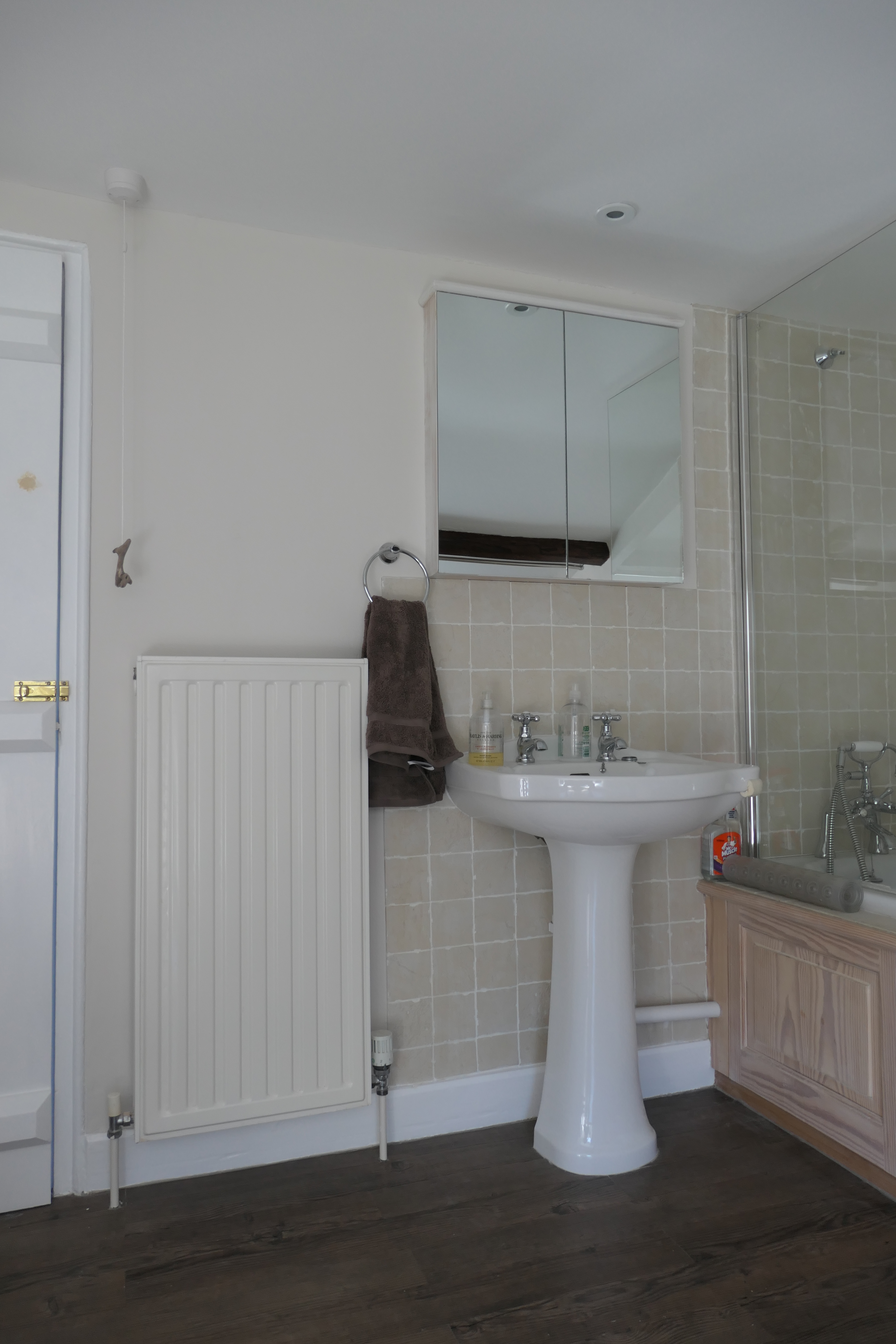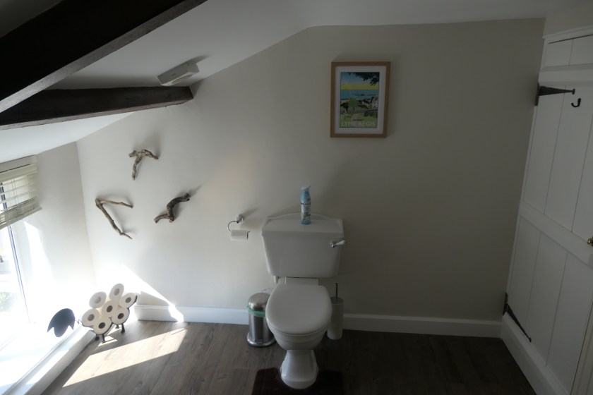 Thanks to some extra painting time put in by John during the week, we’ve managed to make some real progress again this weekend (at last!). Despite more drips on the bathroom woodwork, we managed to get it pretty much finished, with just a couple of small touches to finish. We wanted it to have a coastal feeling as we’re only half an hour from the sea, so we’ve decorated with driftwood and a lovely Tabitha May picture of Lyme Regis. We’ve also stripped back the beam and matched the paint to the tiles – the original white just felt a bit too clinical to be relaxing.