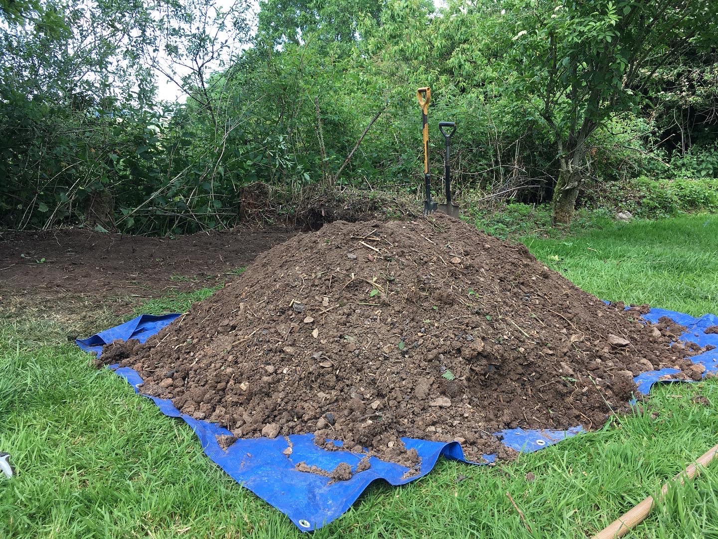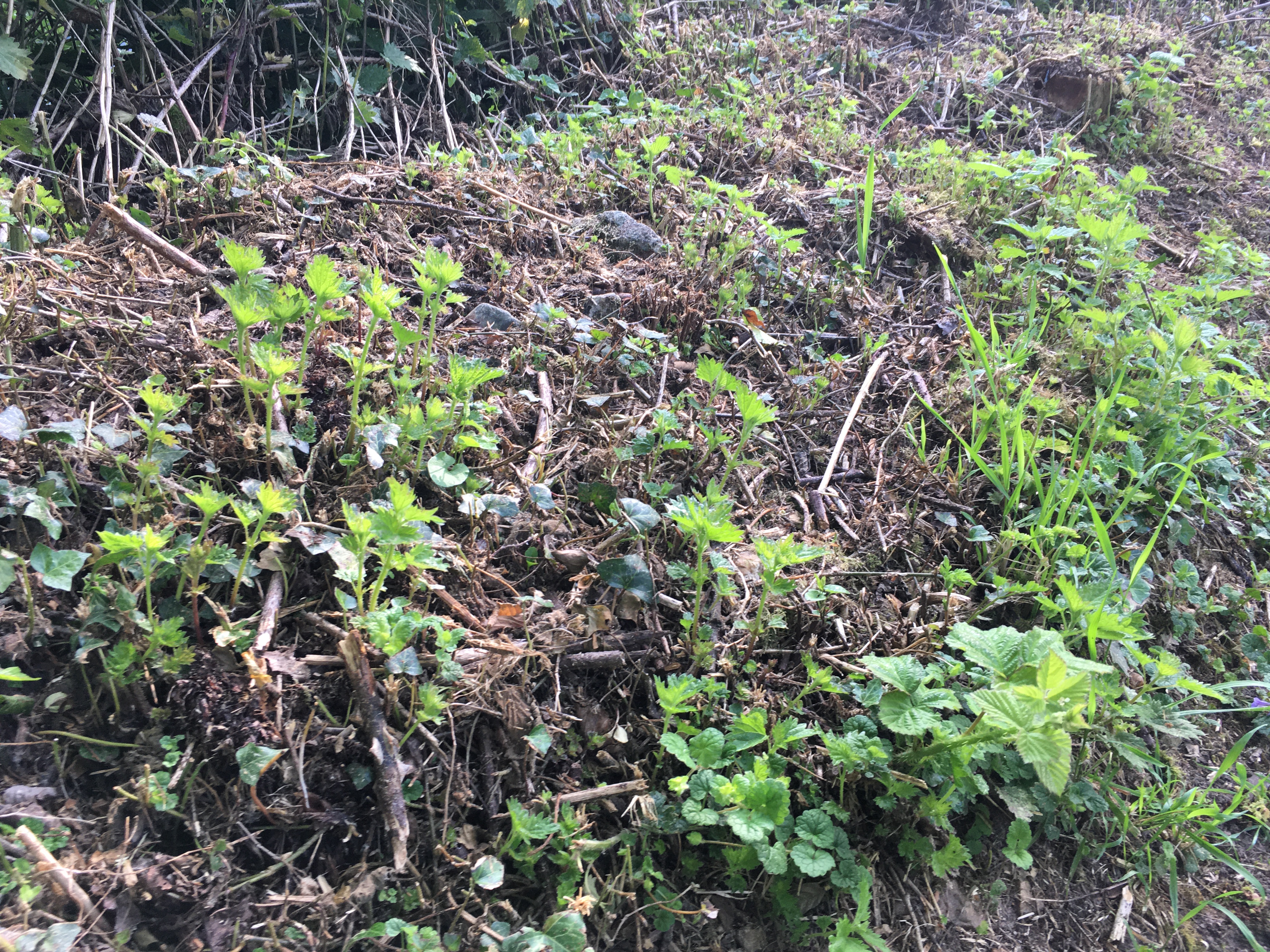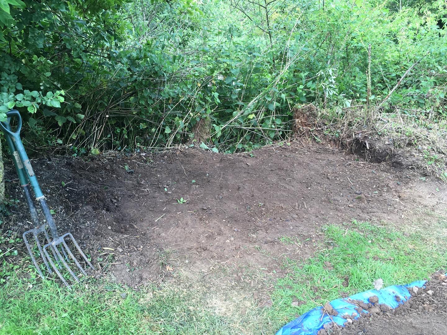 We’ve already spent several weekends on and off digging out a particularly-bad strip of brambles, nettles and stones to turn it into an experimental squash and potato bank – which, if it works, we’ll dig it out properly in the coming years and put a proper wall behind it (it’s precariously balanced with concrete blocks right now to stop it falling back into a stream). Beyond that, with an elderflower tree separating the squash bank, is another long strip of brambles and nettles, edging the entire orchard. We had visitors coming who’d offered to bring asparagus plants, so the next job was to reclaim more of the bramble bank and turn it into an asparagus bed.