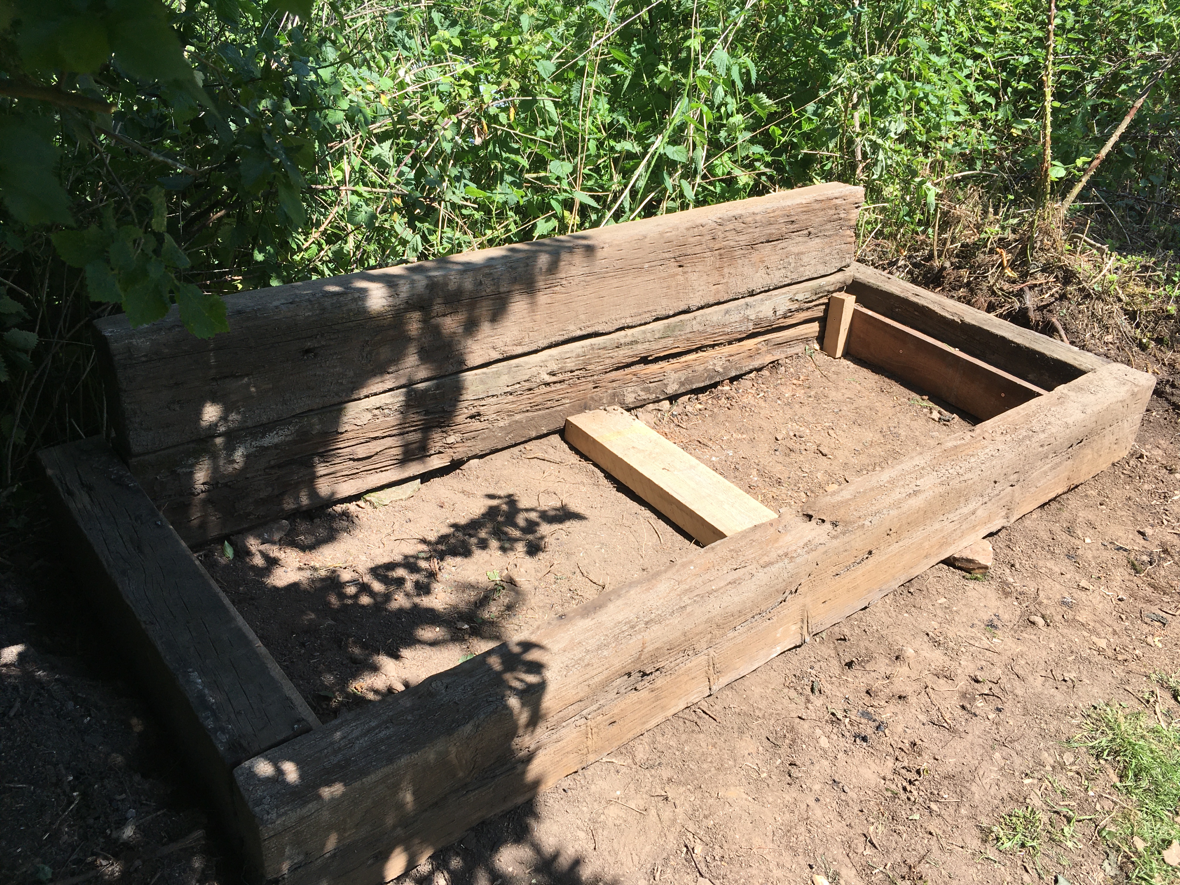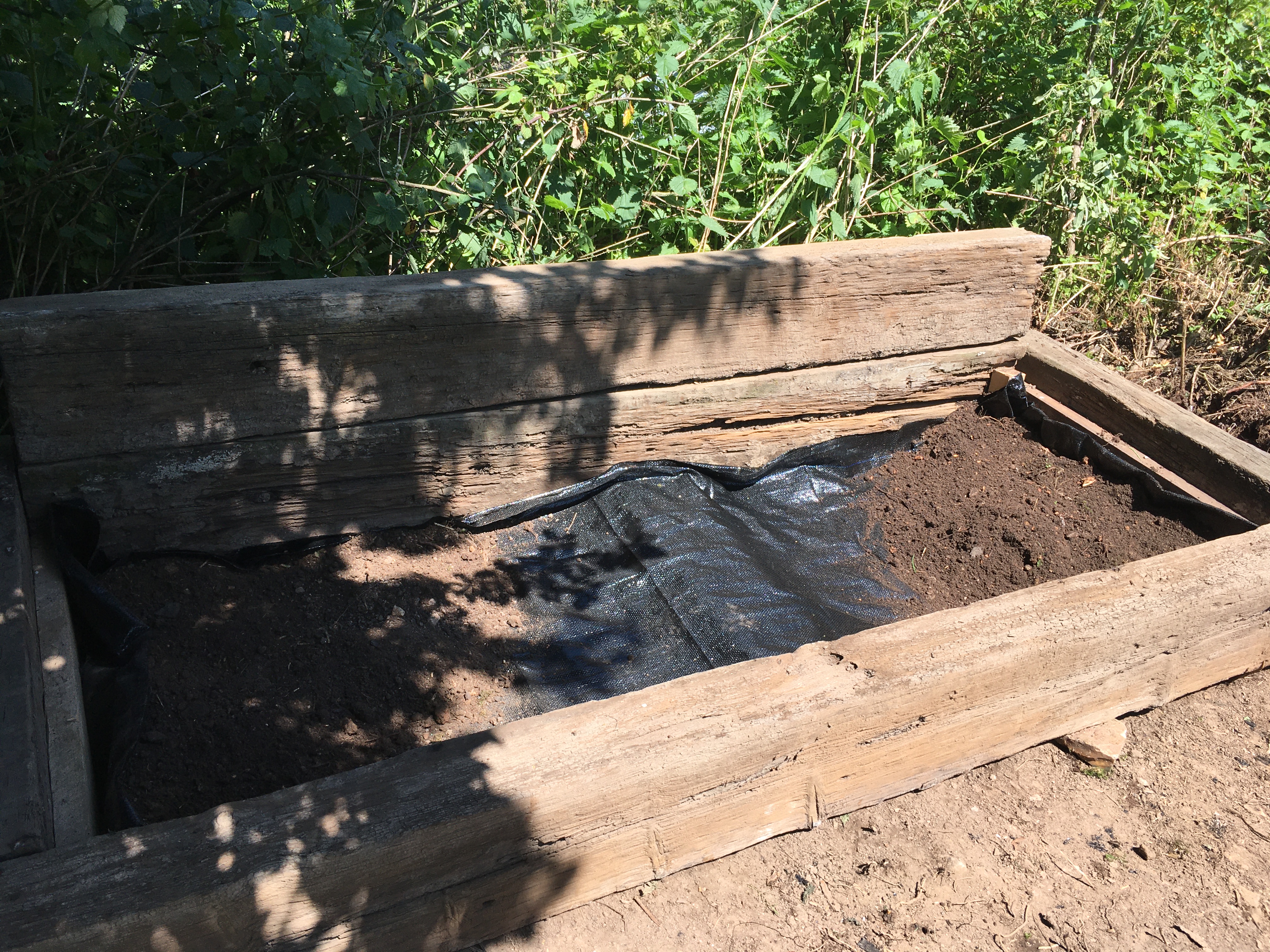 Conveniently we’d not got round to getting rid of the sleepers we dug up from the greenhouse base, and one of our visitors pointed out that these would be perfect for a vegetable bed. So we duly spent a weekend digging out more brambles, and making a frame from the sleepers, using random bits of leftover wood to hold it all together. The double-height back edge is to try and stop the nettles growing through from next door (as it is with the squash bank already) – the patch of land next door is kept for grazing cattle and is completely taken over with cow-height nettles!