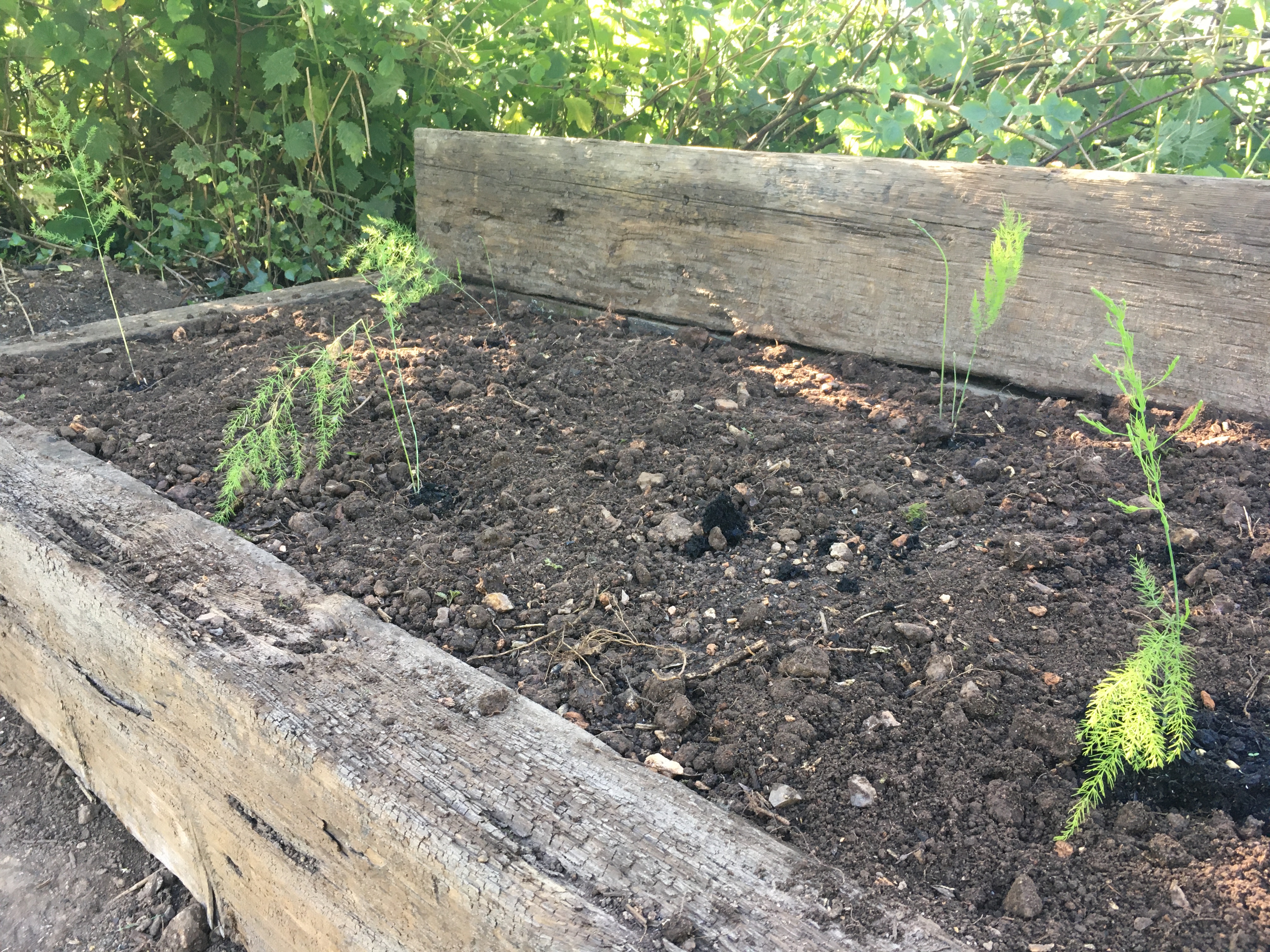 Surprisingly it didn’t take as long as we expected to dig out the bed, and it actually looks reasonably good, given we were about to throw out the old sleepers. We’re just hoping the thick weed membrane keeps out the roots of the brambles and nettles – even though we dug out all the soil before replacing it, we’re fast learning that both weeds have amazing staying power! Now we just need to avoid temptation for the next few years while the asparagus plants get established… a tough job!