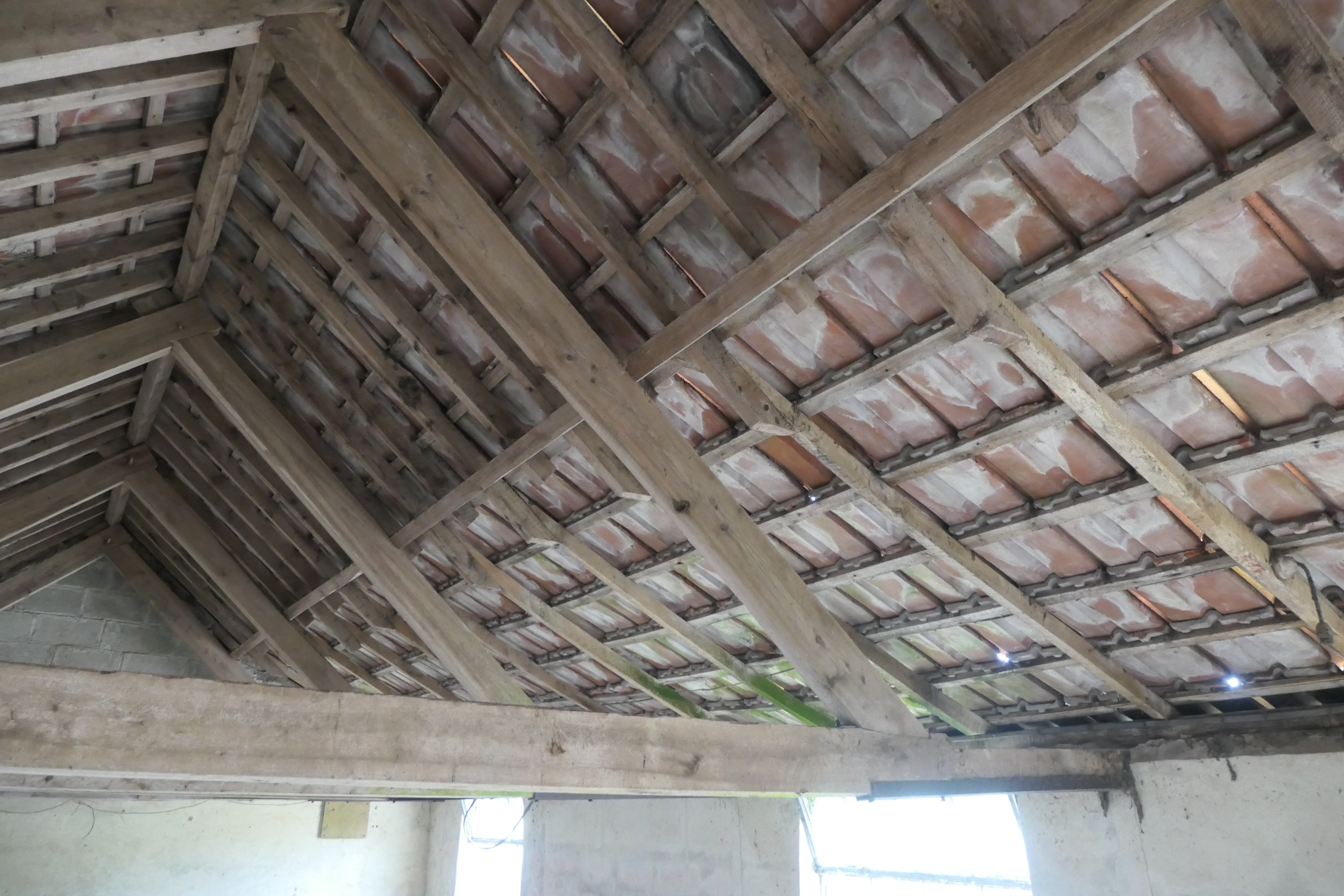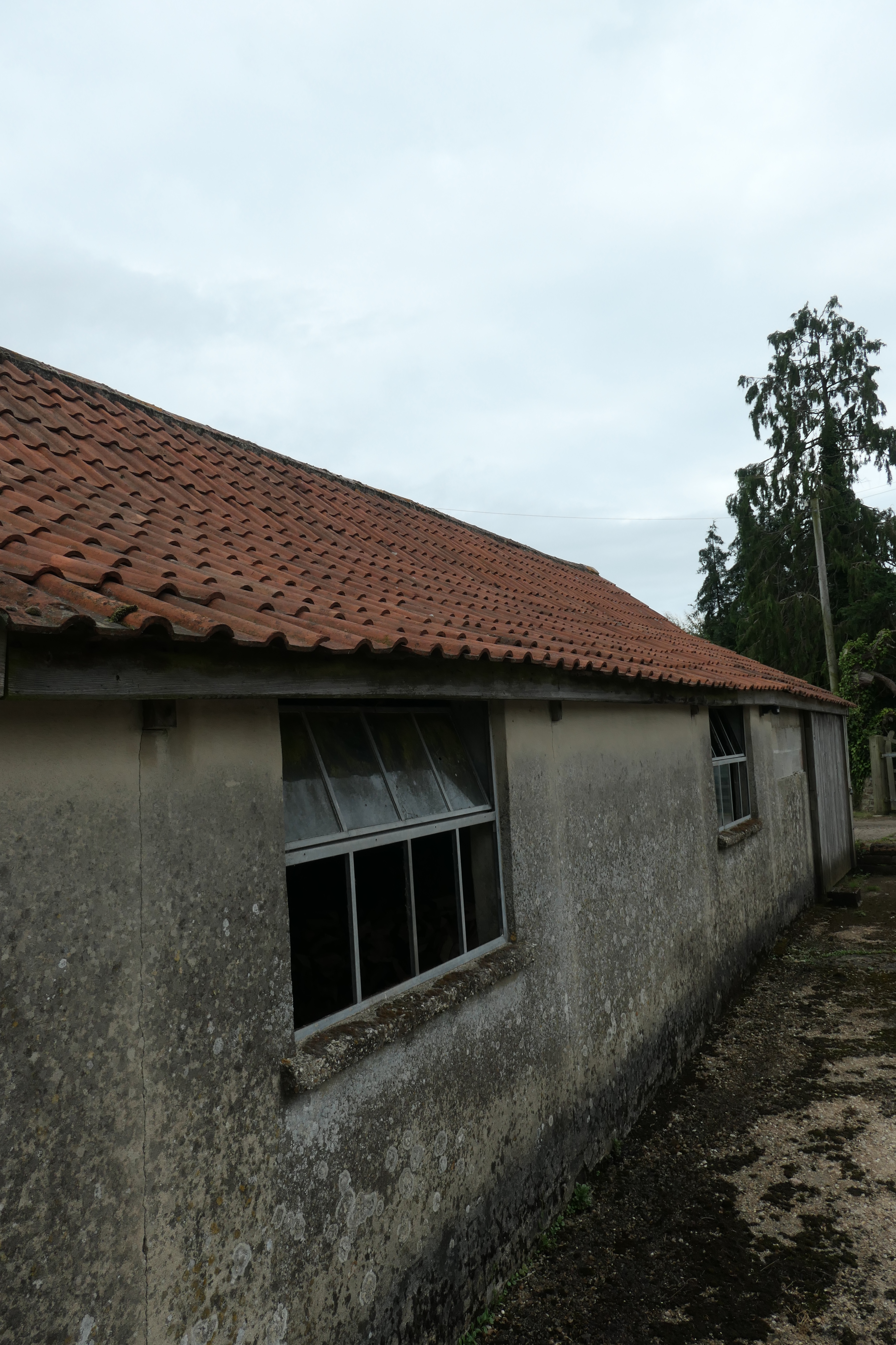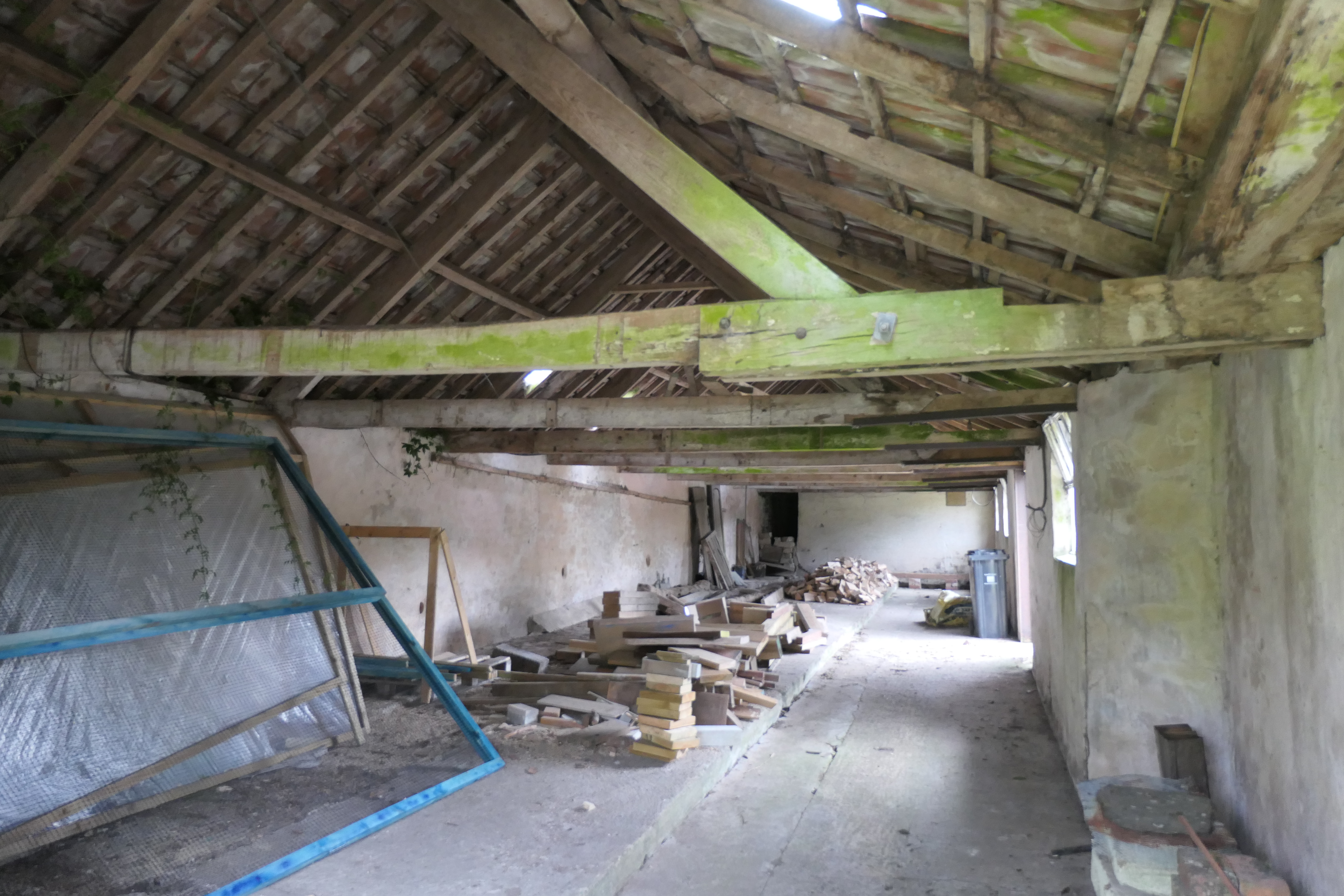 The first building you come to within our site is our shippon, with a lovely red clay-tiled roof. Formerly an open-fronted cow milking shed and dating back almost 200 years (a similar time to the farmhouse), it was extended and enclosed along the courtyard side at some point before the second World War, resulting in an unusual change in roof pitch. Our neighbours suggested this may have happened at the same time as milking machines were introduced, to keep them safe and dry. The large sliding door at the north end has long since gone (we suspect it was reused for the now-collapsed compost bins) and both this and the various missing window panes mean the wind and rain now come in unchallenged.