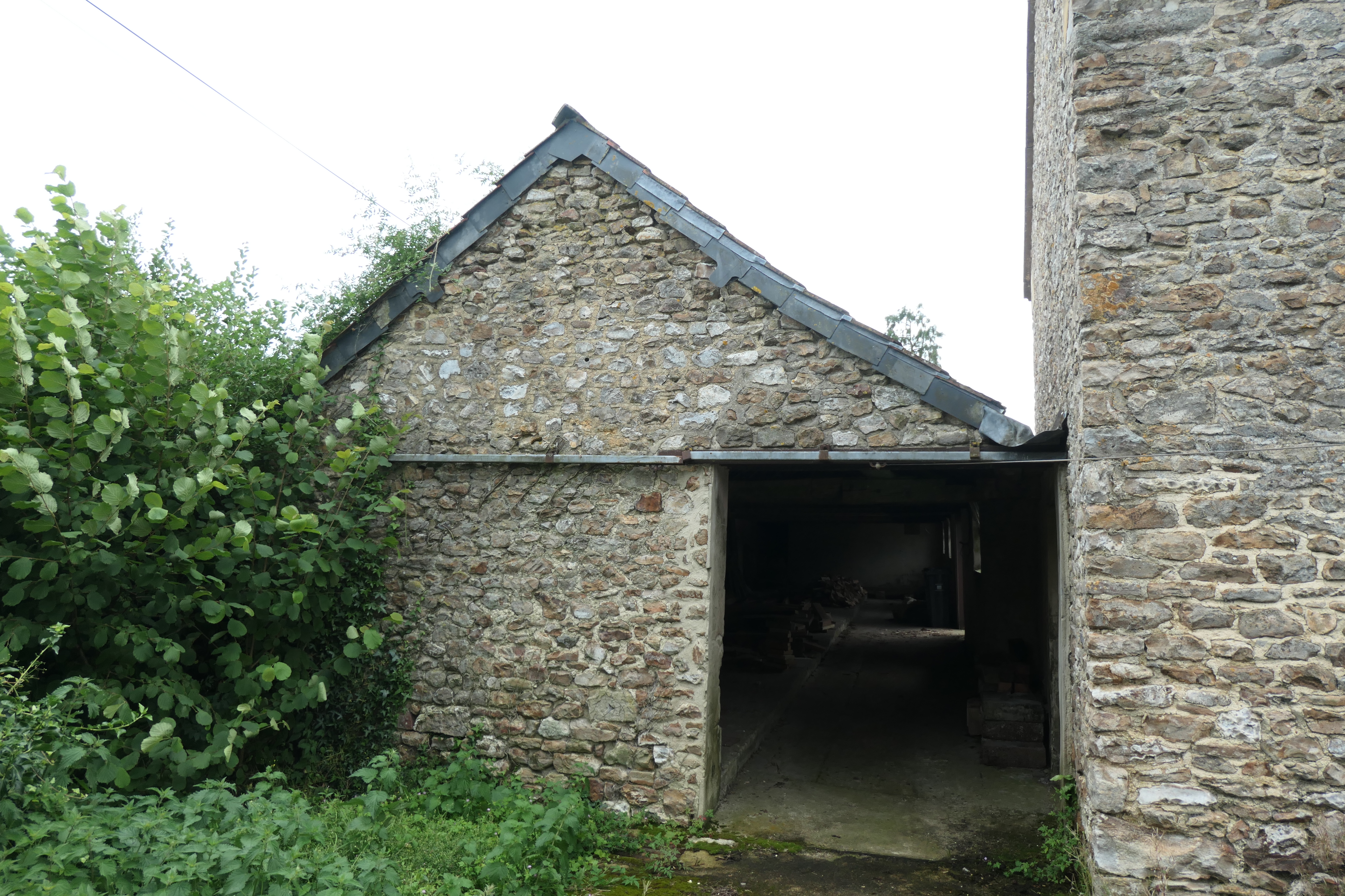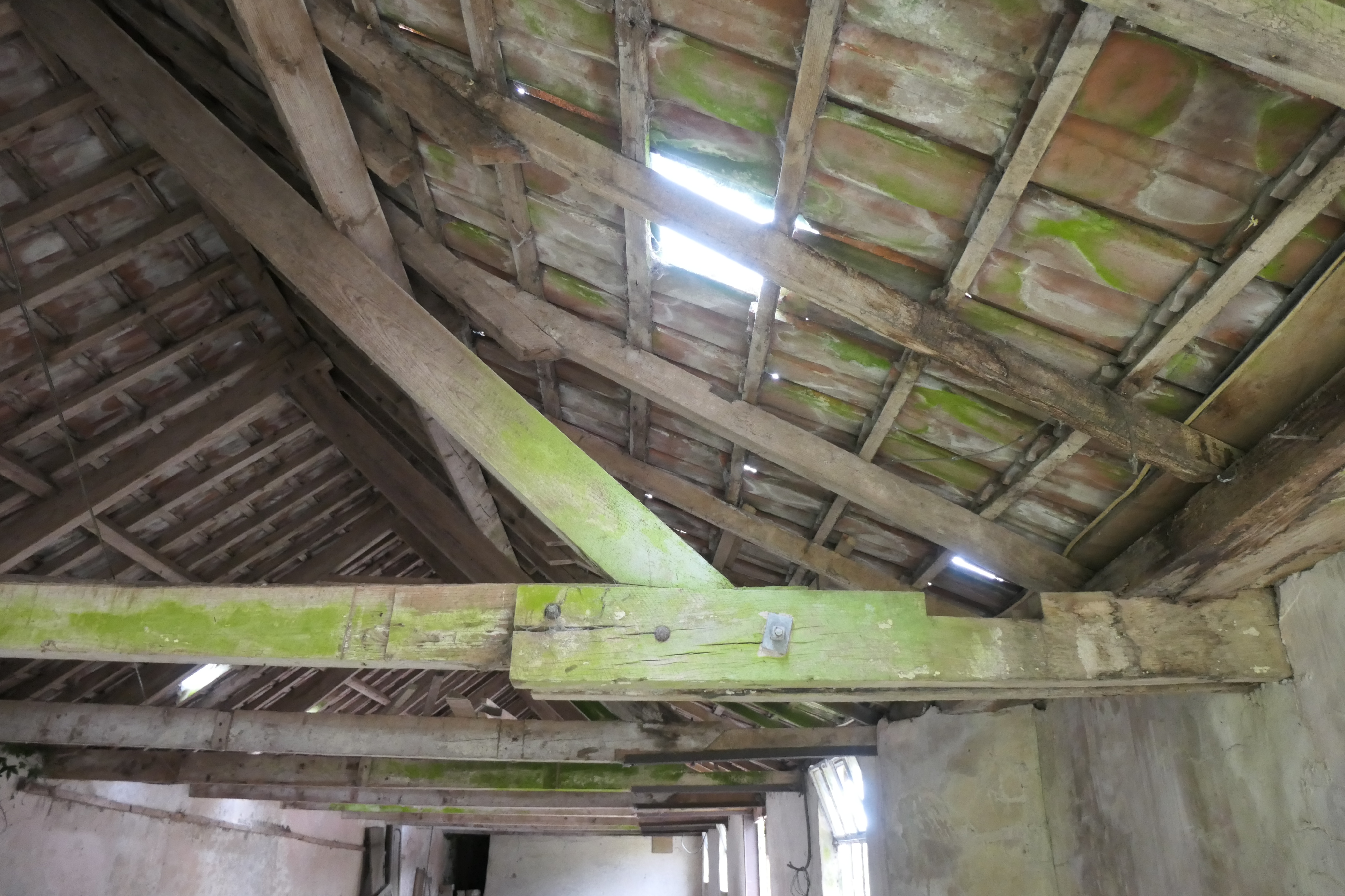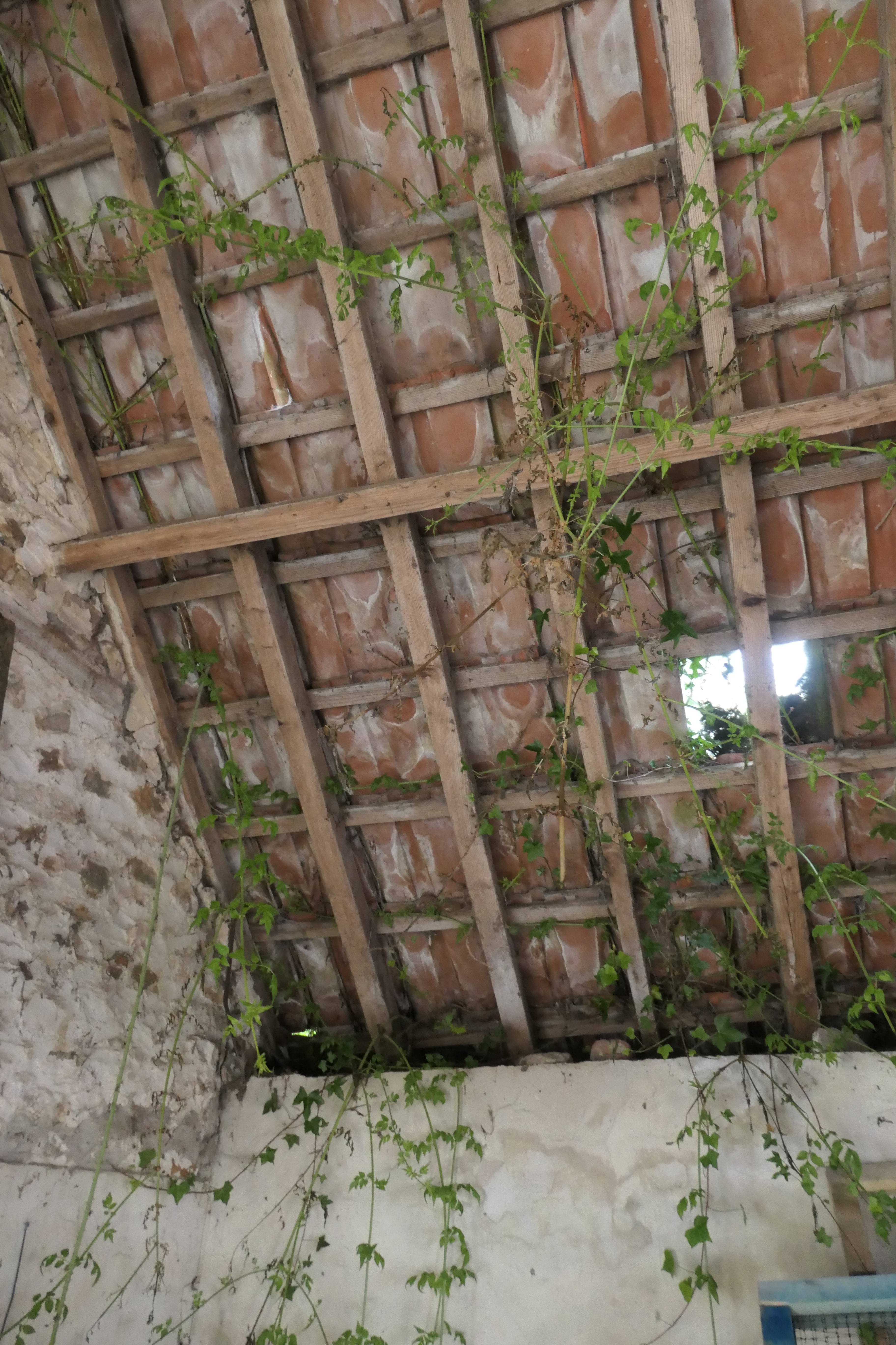 The first building you come to within our site is our shippon, with a lovely red clay-tiled roof. Formerly an open-fronted cow milking shed and dating back almost 200 years (a similar time to the farmhouse), it was extended and enclosed along the courtyard side at some point before the second World War, resulting in an unusual change in roof pitch. Our neighbours suggested this may have happened at the same time as milking machines were introduced, to keep them safe and dry. The large sliding door at the north end has long since gone (we suspect it was reused for the now-collapsed compost bins) and both this and the various missing window panes mean the wind and rain now come in unchallenged.