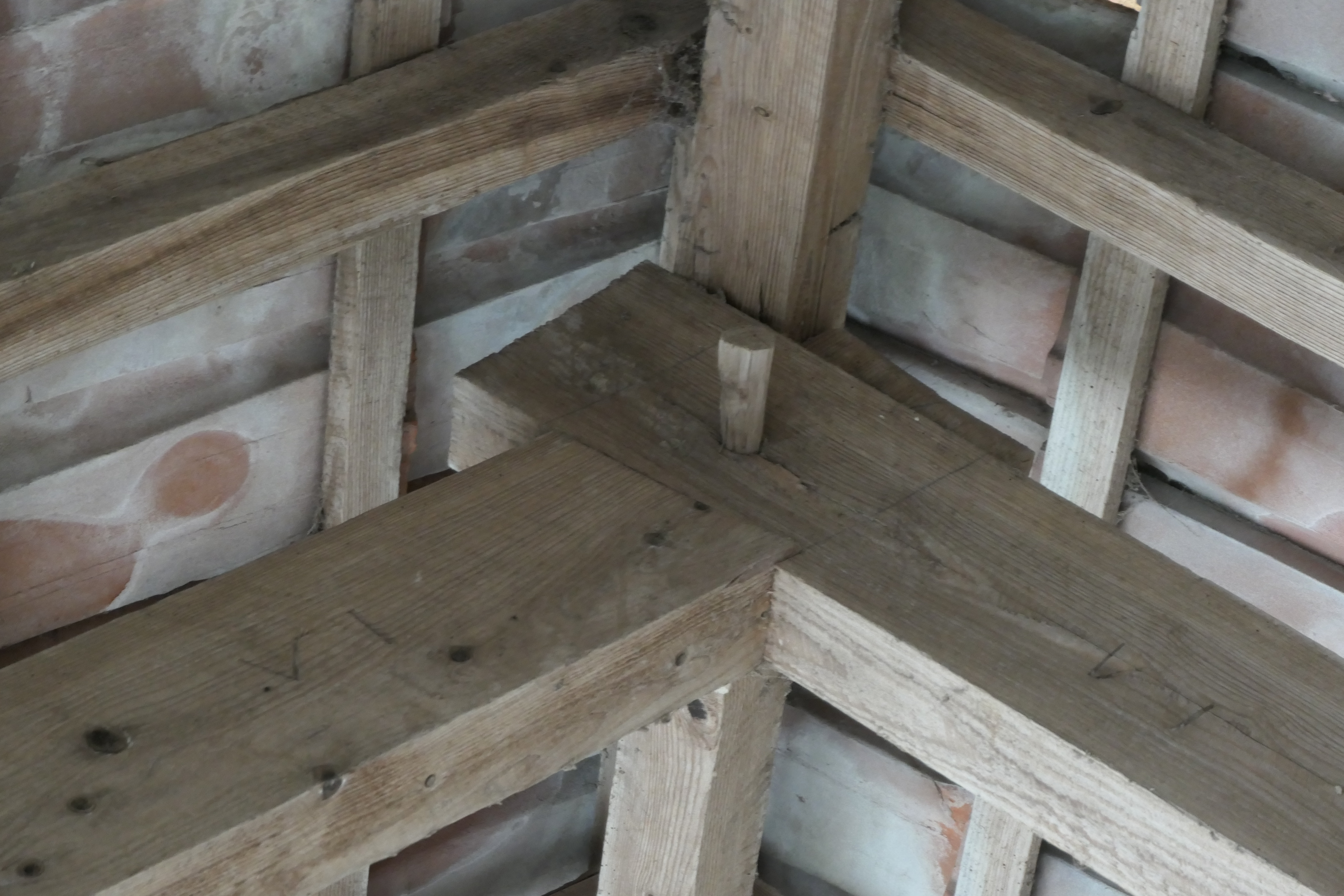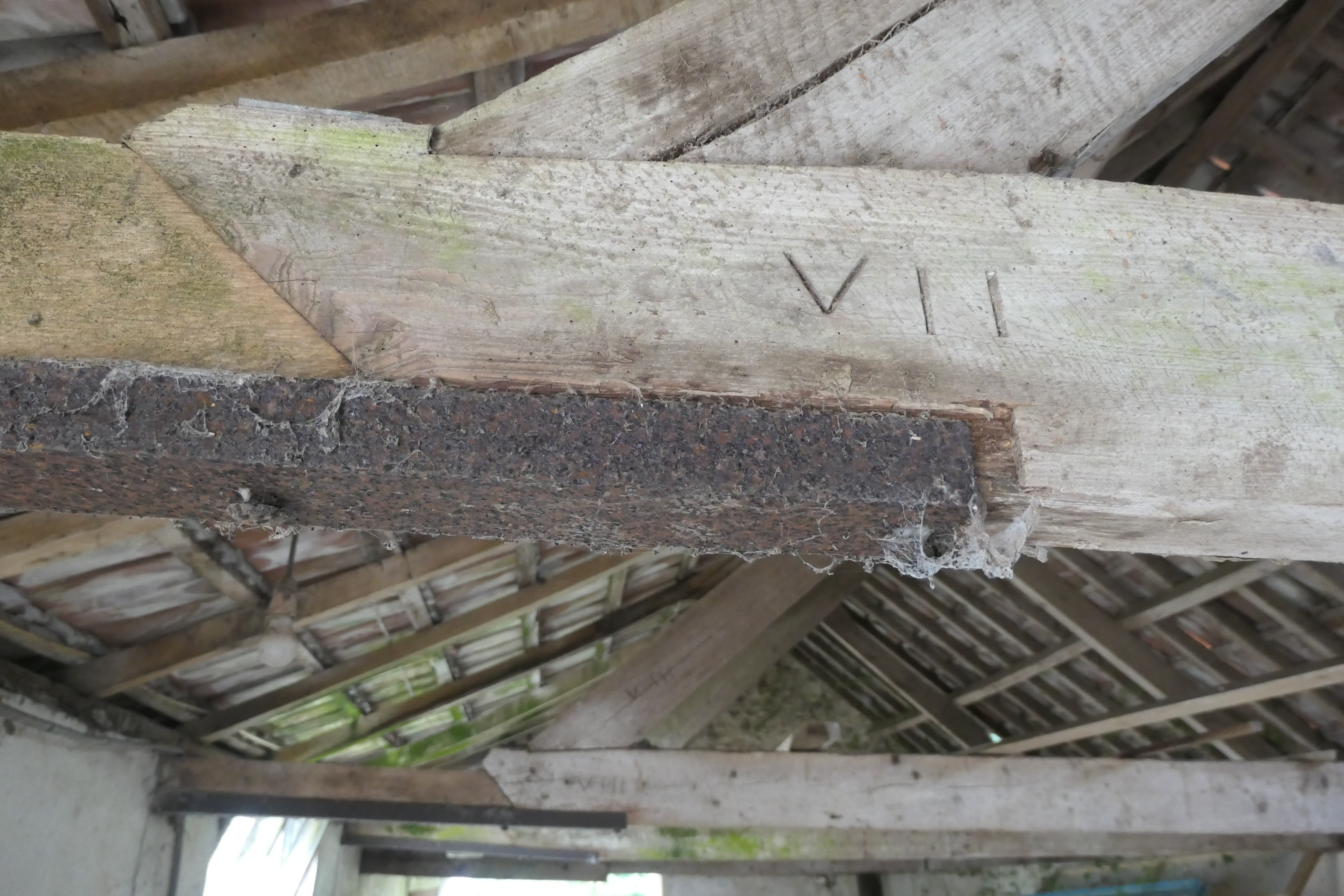 The shippon is a single storey building with a floor that slopes from one end to the other – one feature we’ve yet to consider how we manage without removing crazy amounts of concrete! The triangle-of-roof beams still have incredible wooden pegs securing them, and roman numerals inscribed to help the builders match the three beams correctly – we’re hoping to keep at least some of these visible (although we’re not sure if these are original or more recent). It’s been somewhat taken over by vegetation – a common theme with all our derelict buildings – one of our long-standing jobs is to try and clear it all back to avoid further damage to the building.