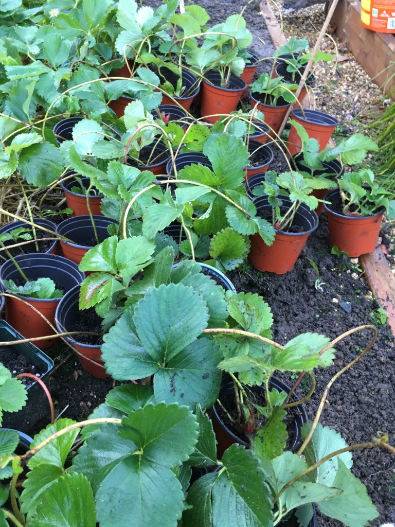 We bought our first drainpipes back in the Spring, and cut nine holes in each. We had some plants kindly donated by my parents and by some friends – the latter who also helped us plant them up on one of their visits. And then we propped them up against the shed wall and left them! We had a few strawberries grow over summer, but hadn’t thought to cover them with a net, and so our garden birds enjoyed most of them. But the plants are looking pretty strong and happy in their drainpipe homes, and we had a crazy amount of runners from the strawberry plants in the kitchen garden, so we decided to make some more!