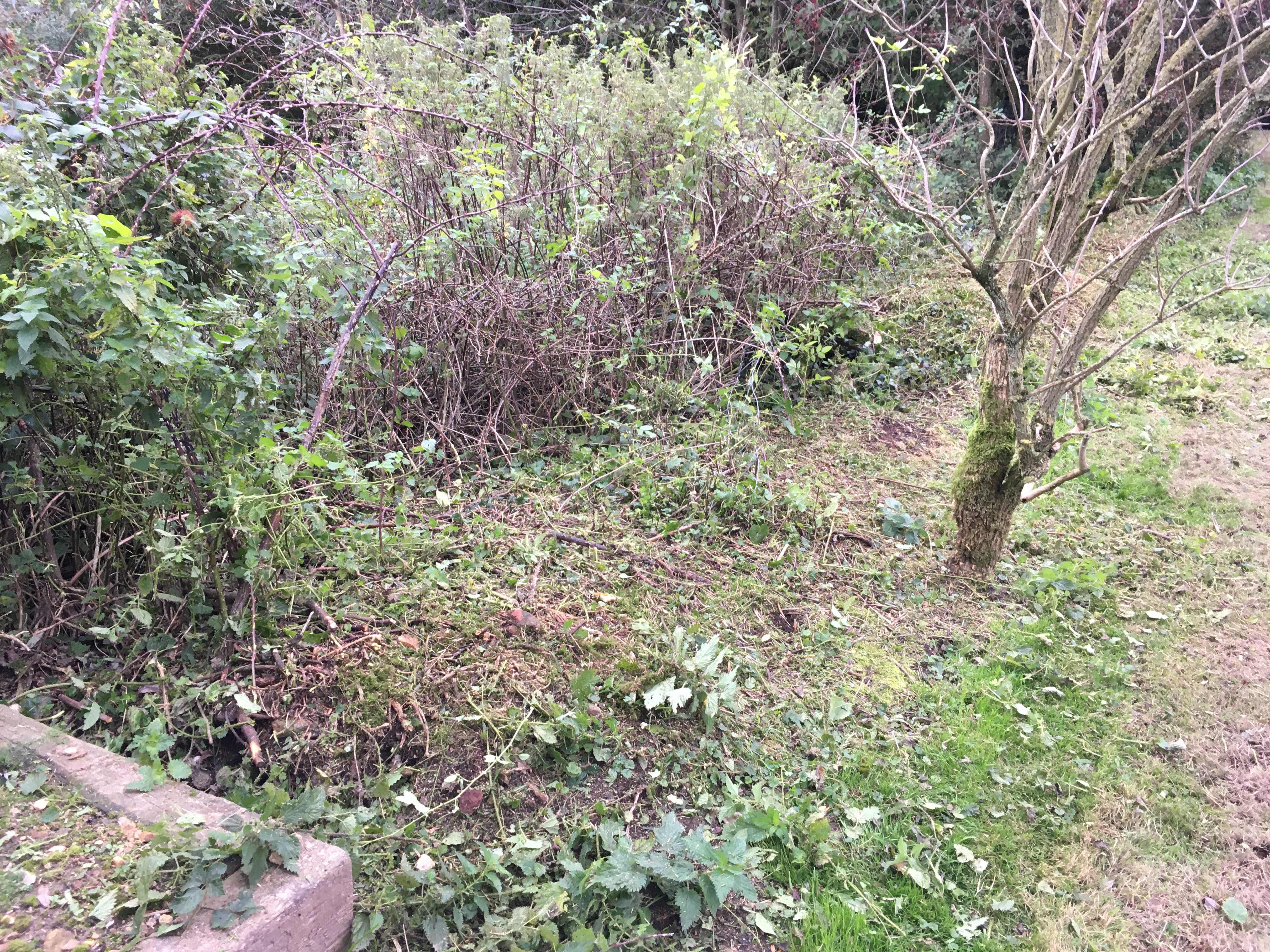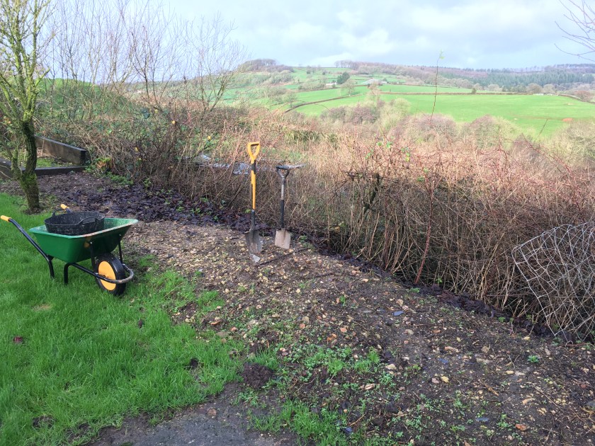 While we’re waiting to be able to start the building work on our barns, and for the planning permission on our farmhouse, we’re occupying ourselves by making improvements in the garden. Most of the main garden areas were beautifully planted with seasonal shrubs and flowers by the previous owners, so we’ve focused on turning the various stretches of brambles into something more attractive/productive. We spent three months last year replanting the edge of our wooded area with spring bulbs (which excitingly are already starting to appear), and so this year we started a new project (well, sort of)…