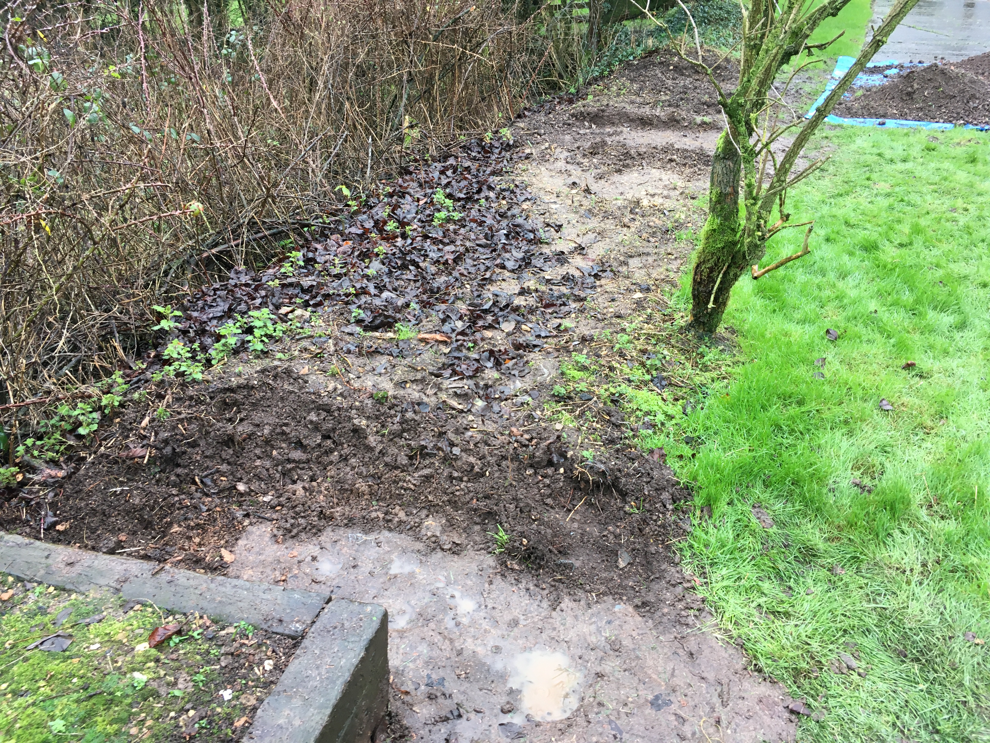 So on Friday, we started our three-day weekend by braving the cold and started to dig out the first length. We actually cleared the brambles last year while we’d rented a rotovator, but we still need to flatten the area, and remove the stones, weeds and general rubbish buried over time. We also have a plan to lay the sleeper edges on leftover ballast instead of soil, as we have clay soil and want to reduce the risk of standing water as much as possible.