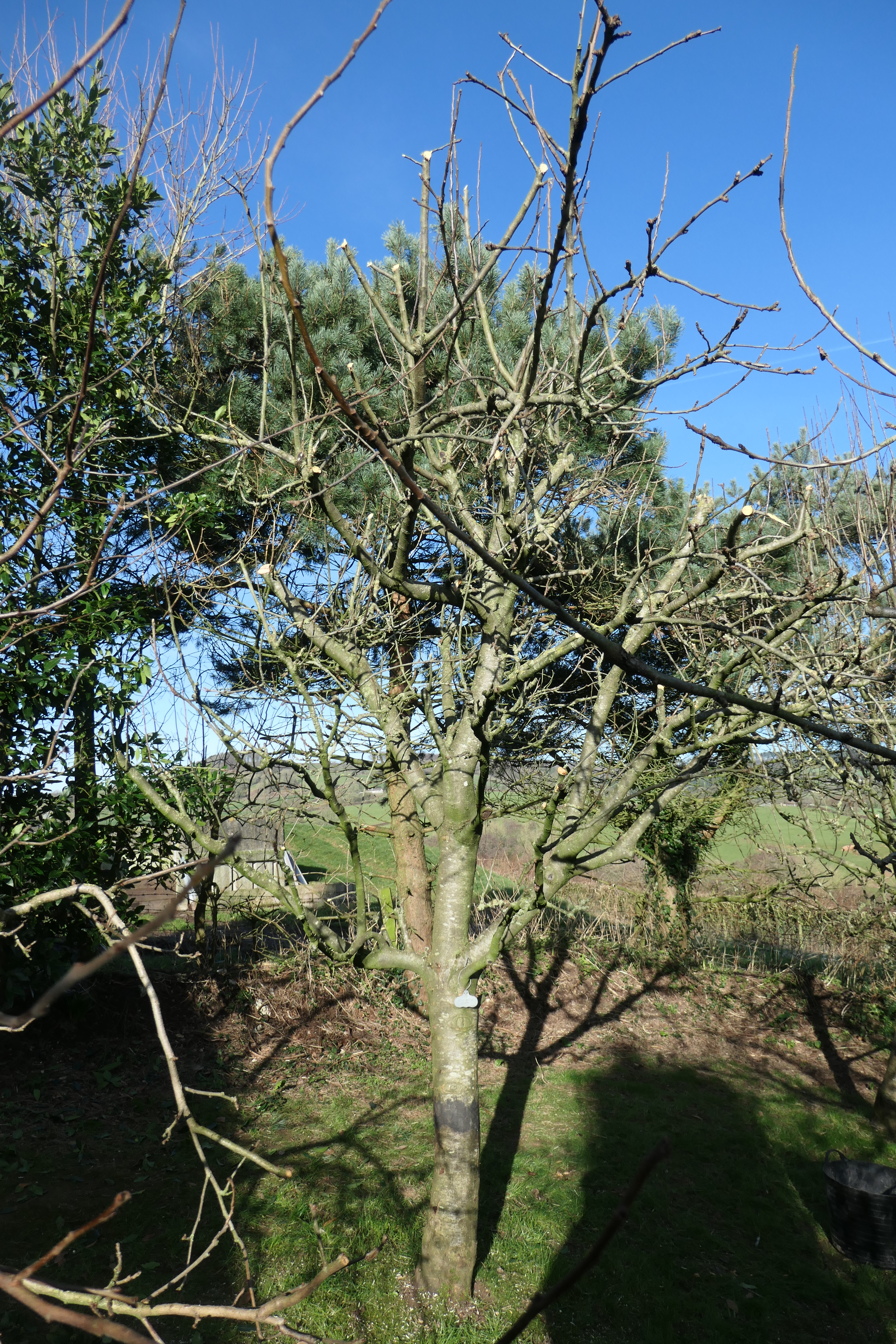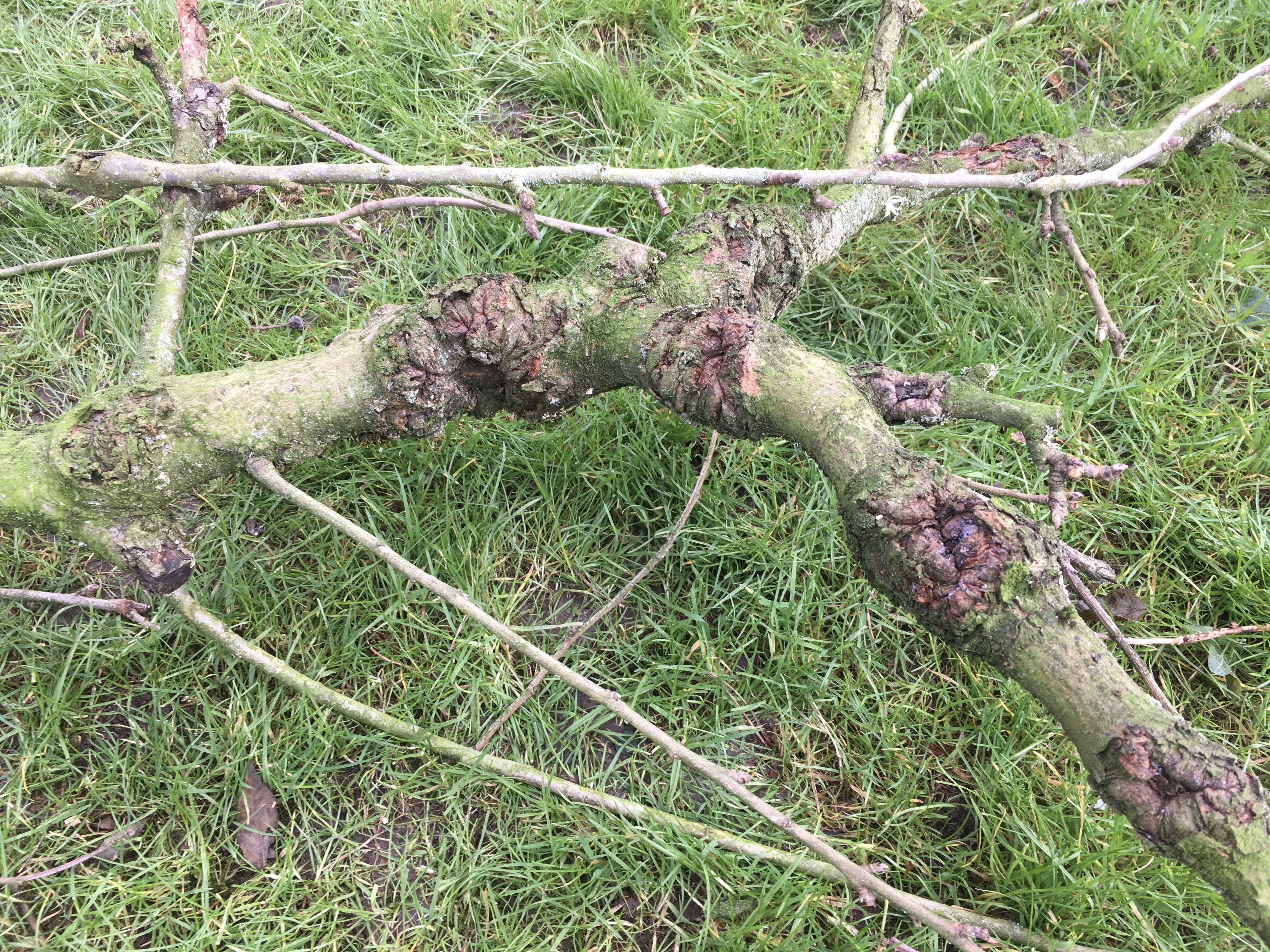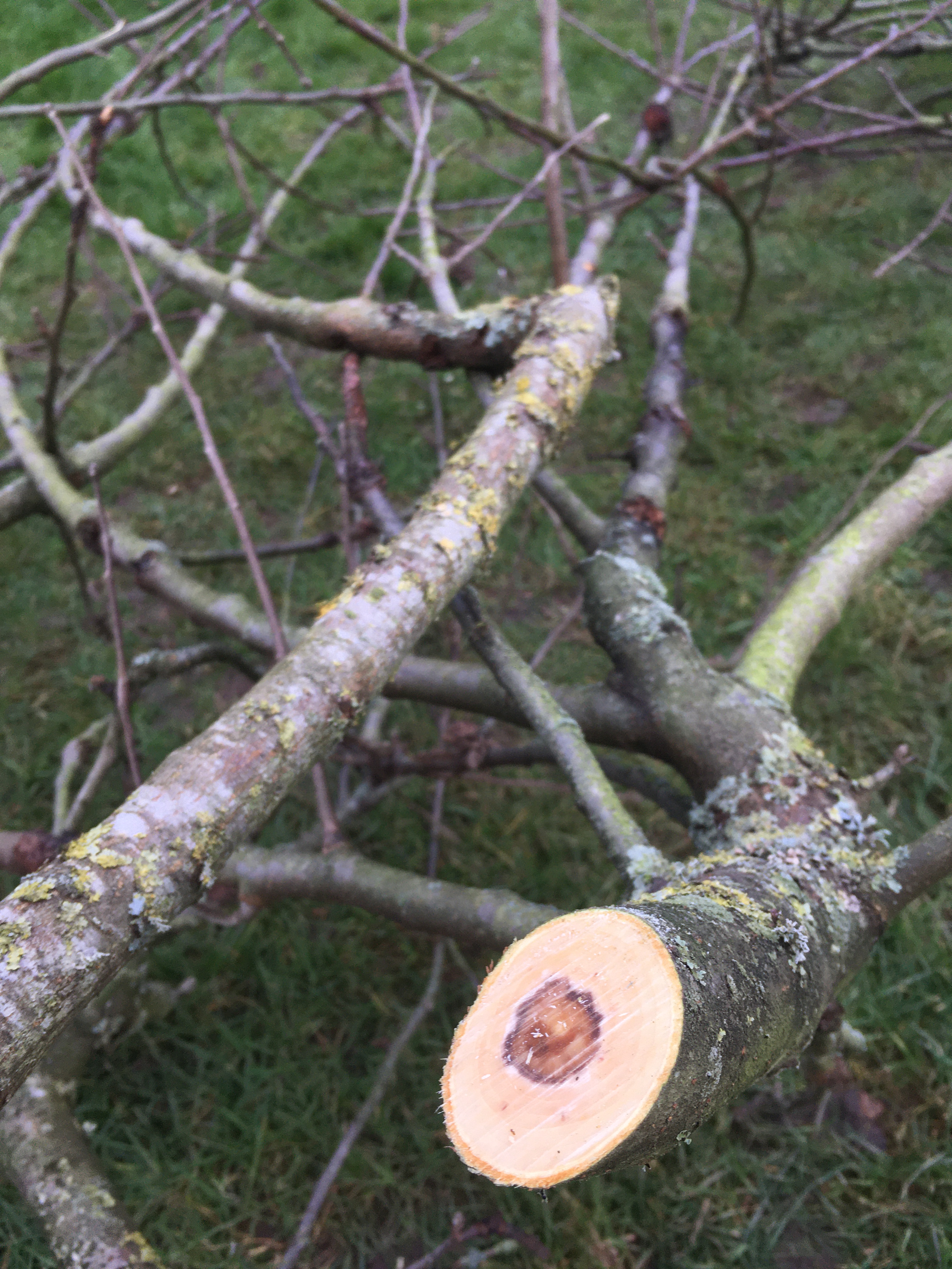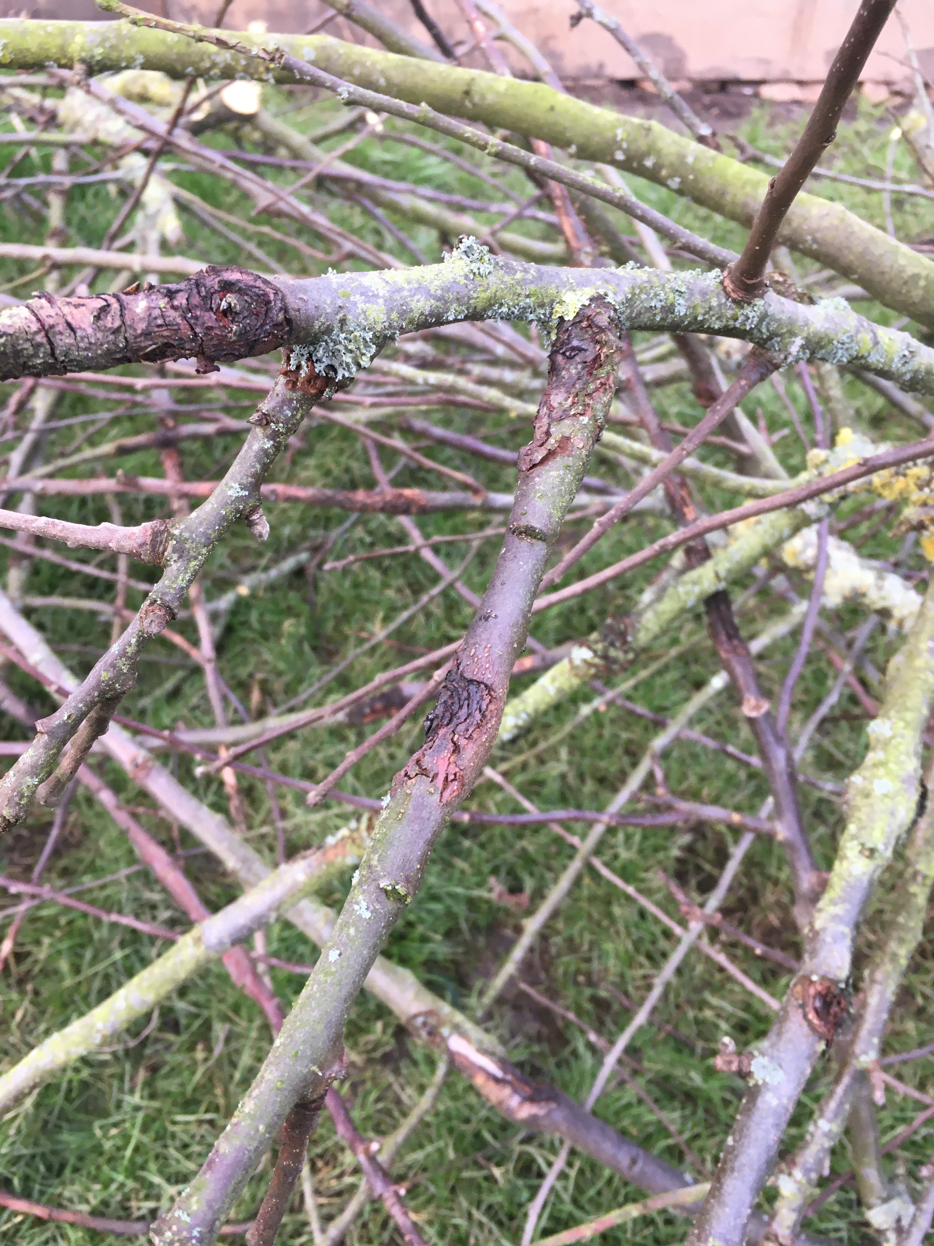We’d planned to prune all our apple and pear trees this weekend – but bad weather on Sunday meant we only got 2/3 of the way through. As last year was our first ever attempt at pruning, we probably weren’t as severe as we needed to be – the trees don’t seem to have been pruned for a while, and the branches are all far too crowded. Almost all of the apple trees have canker (some worse than others) and so we’ve tried to take out as much as we can to try and stop it spreading further. There’s a strong likelihood that we’ll need to replace some of the trees at some stage, but we’ll do our best to restore them to full health.