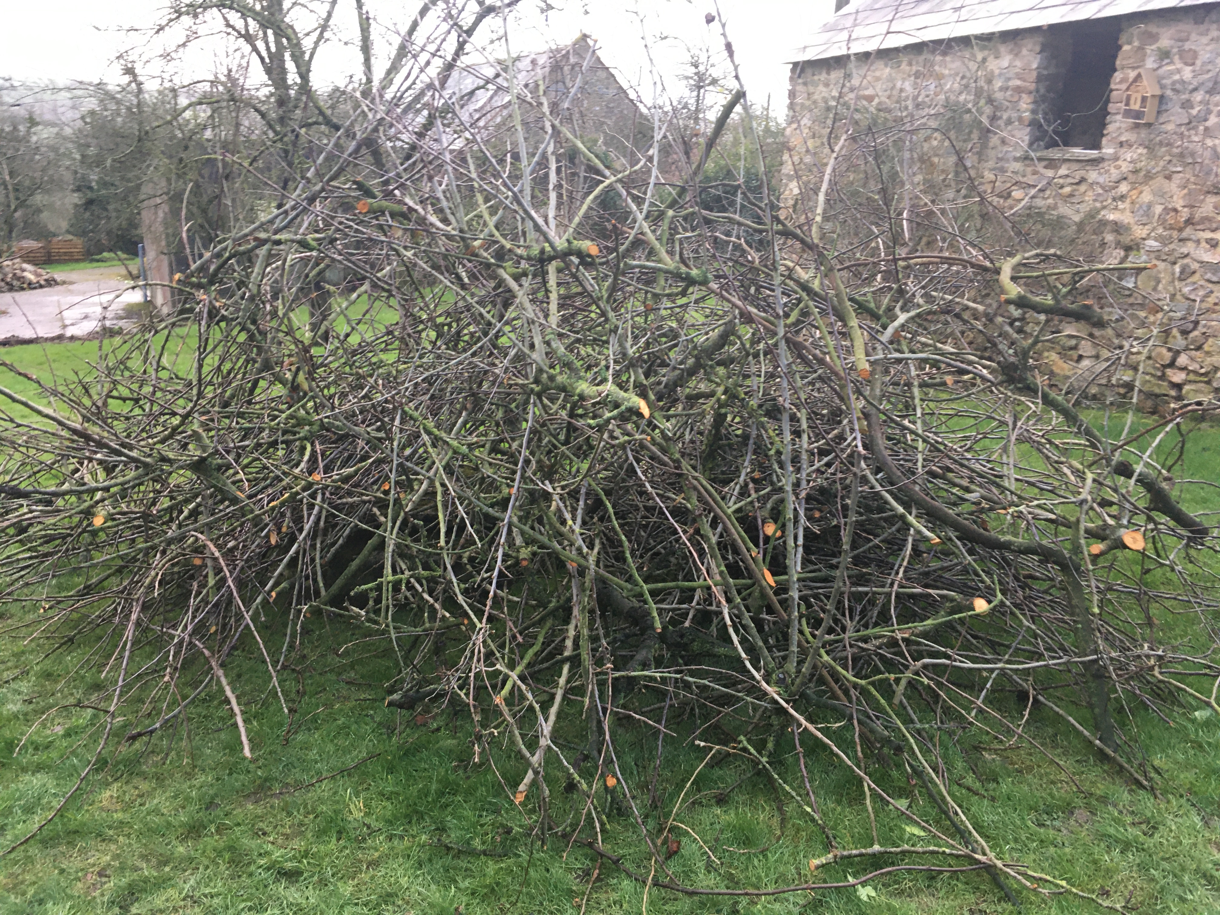The space around the back of the orchard and cottage has really opened up now – and we’re hoping that the extra light will improve our fruit trees. It gets so dark in that back corner that our harvests have been pretty dismal. And it’s lovely to be able to see more of the cottage – and see what we’re facing!