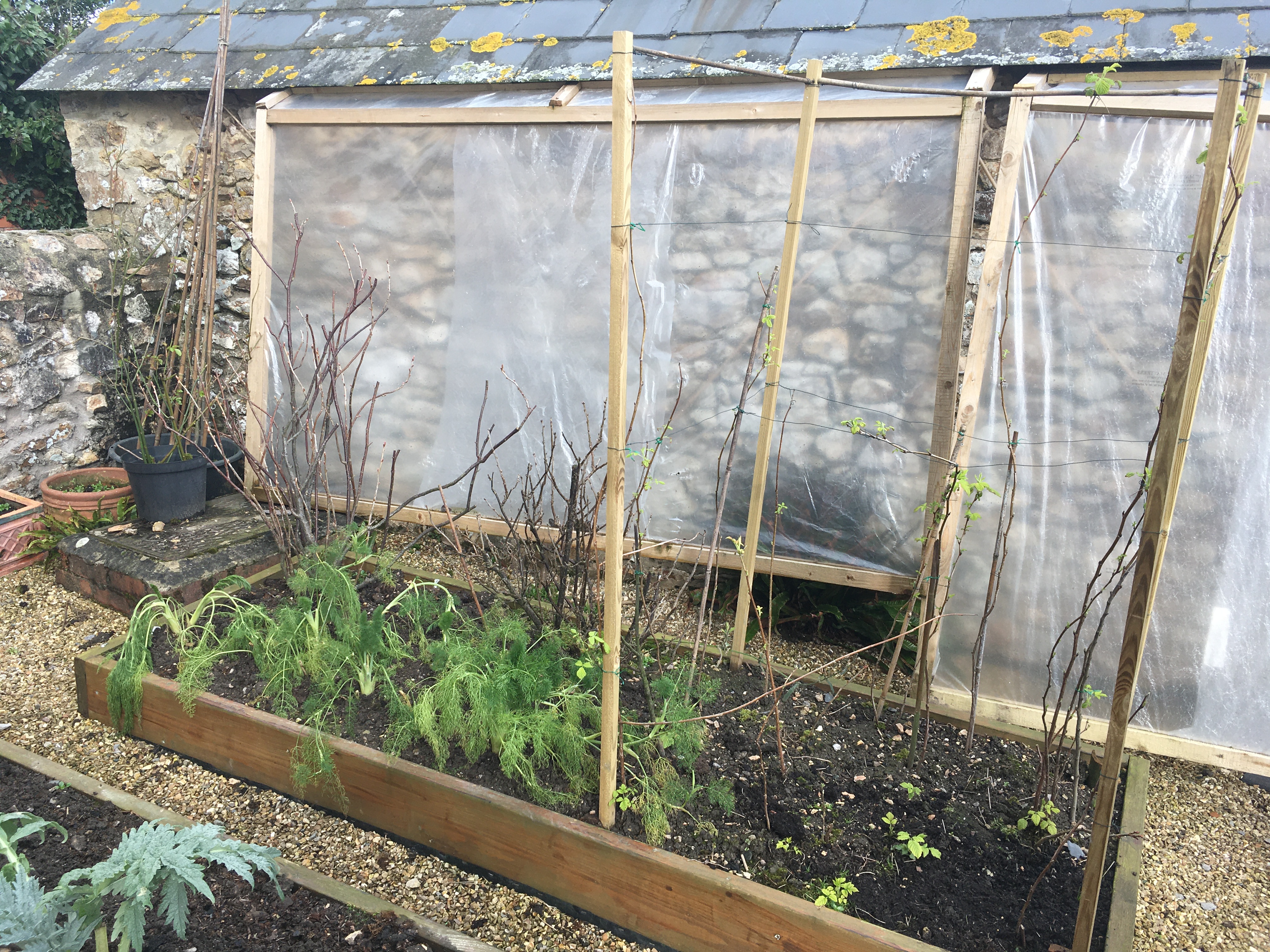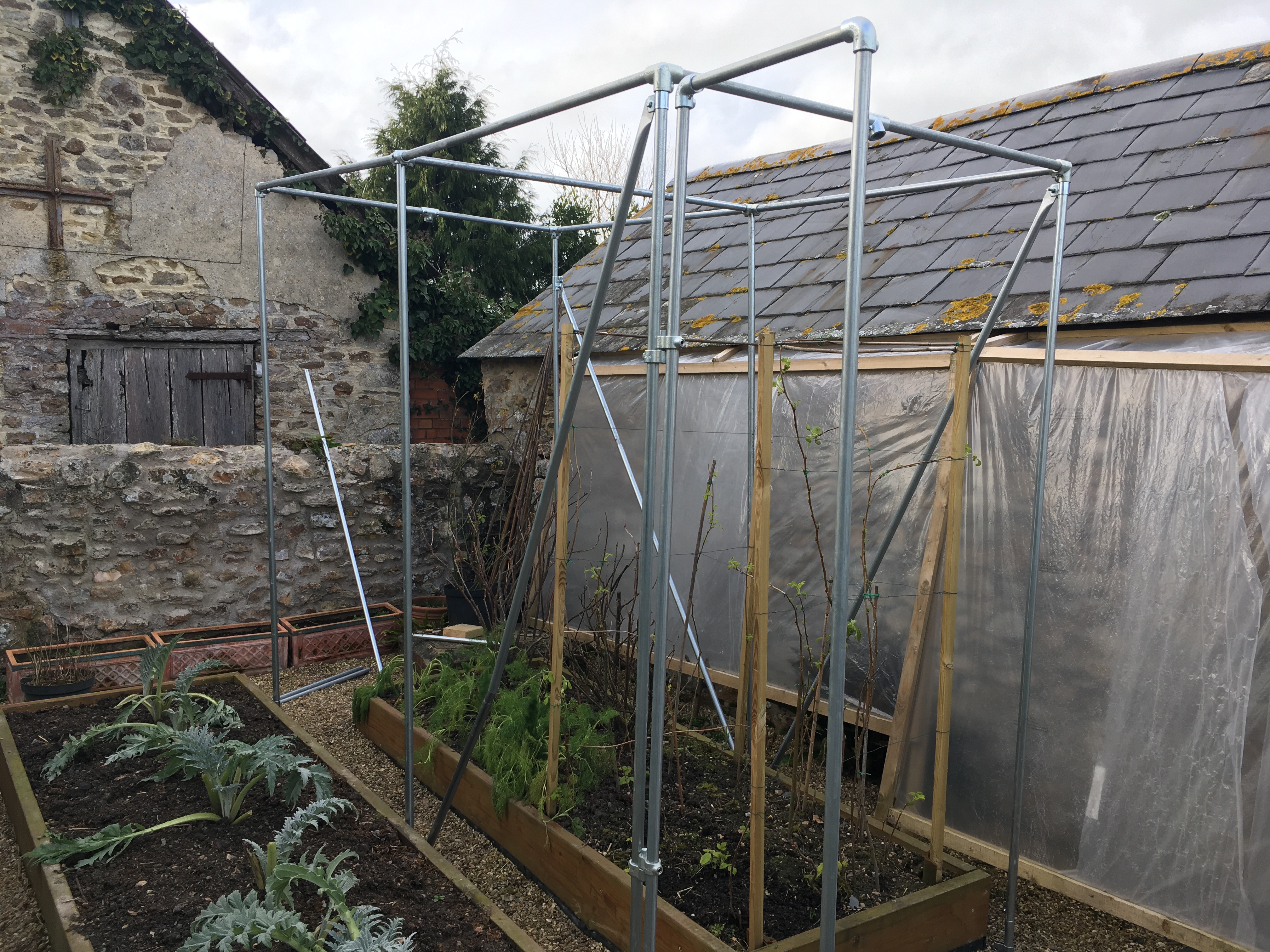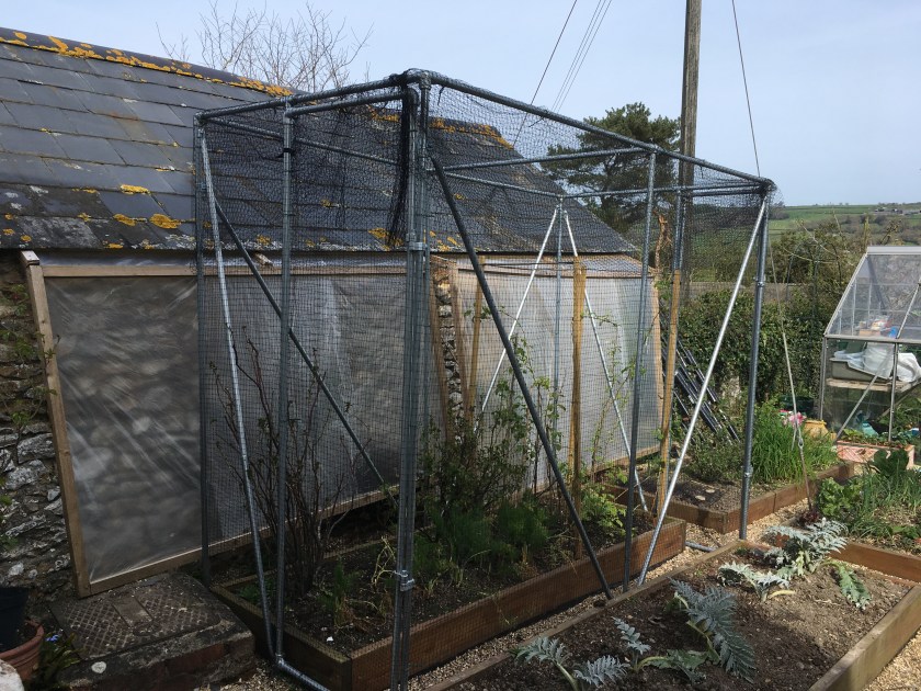 We did manage to complete one of our major projects during the week that’s been in progress for a while now – our new fruit cage around our soft fruit bushes. Last year we were so excited to see our currant and raspberry bushes finally fruiting after they moved from pots to a proper bed – and it was only when we went to pick the redcurrants when we realised that (most likely) birds had stripped the bushes bare – so annoying!