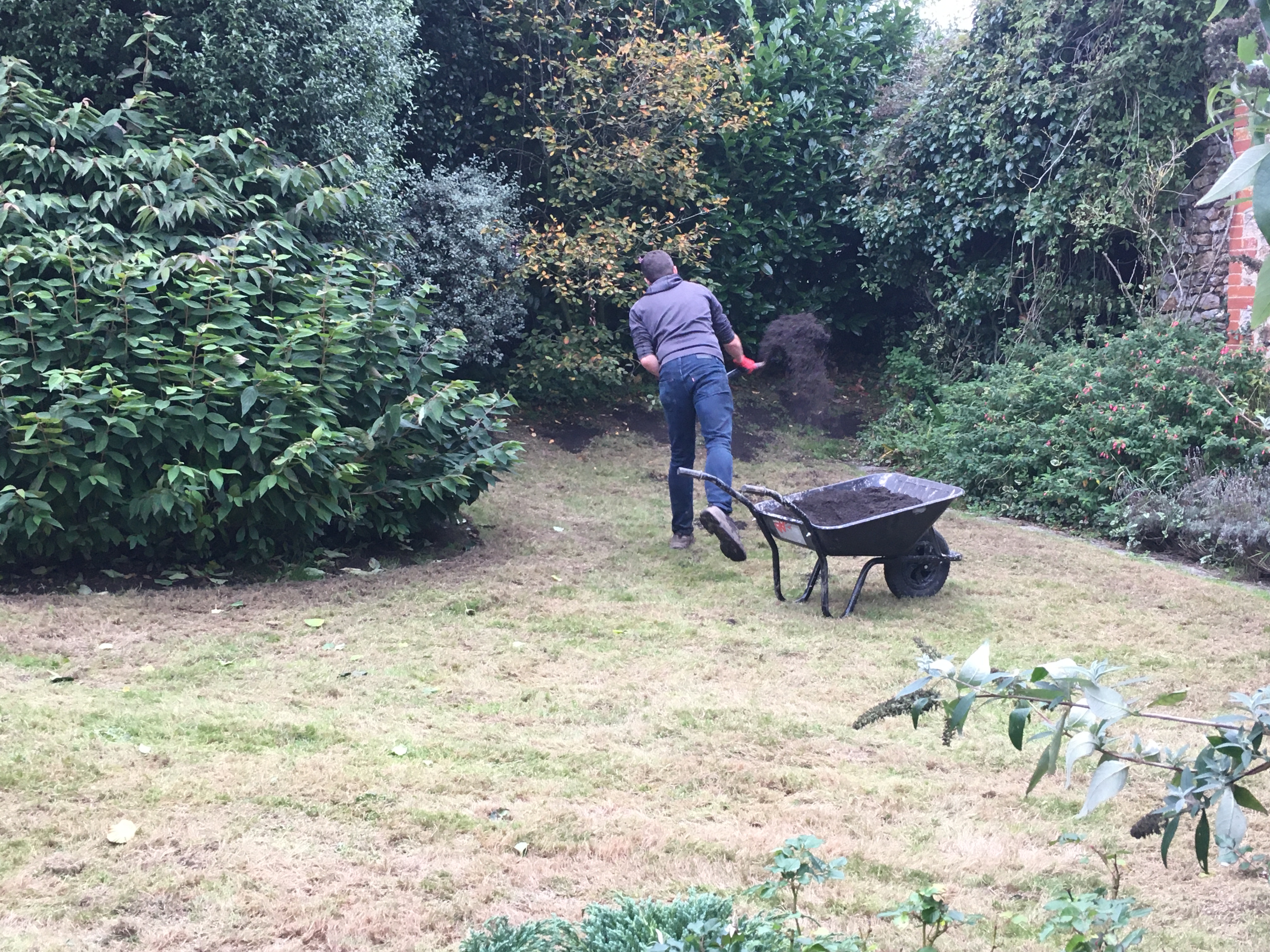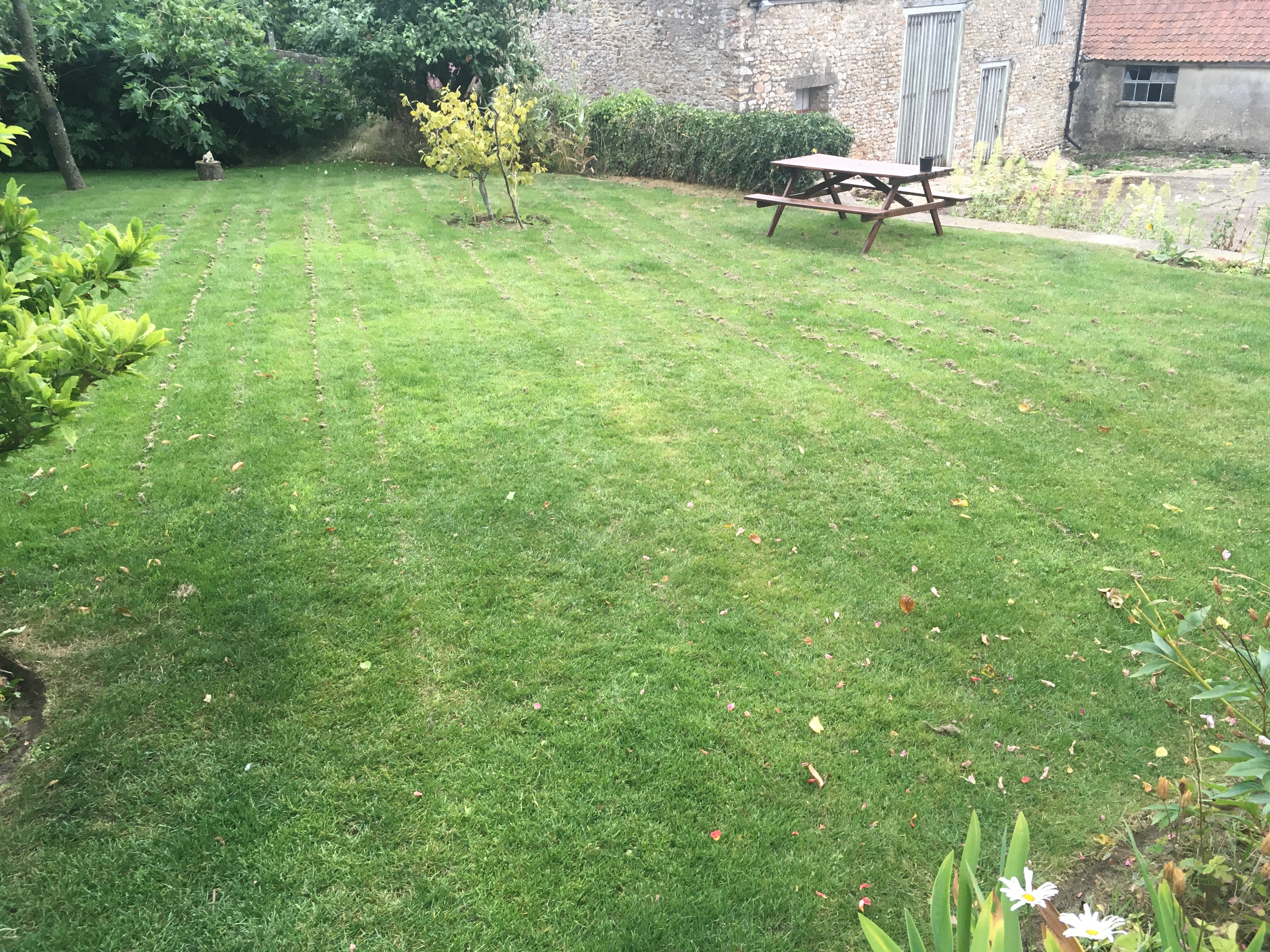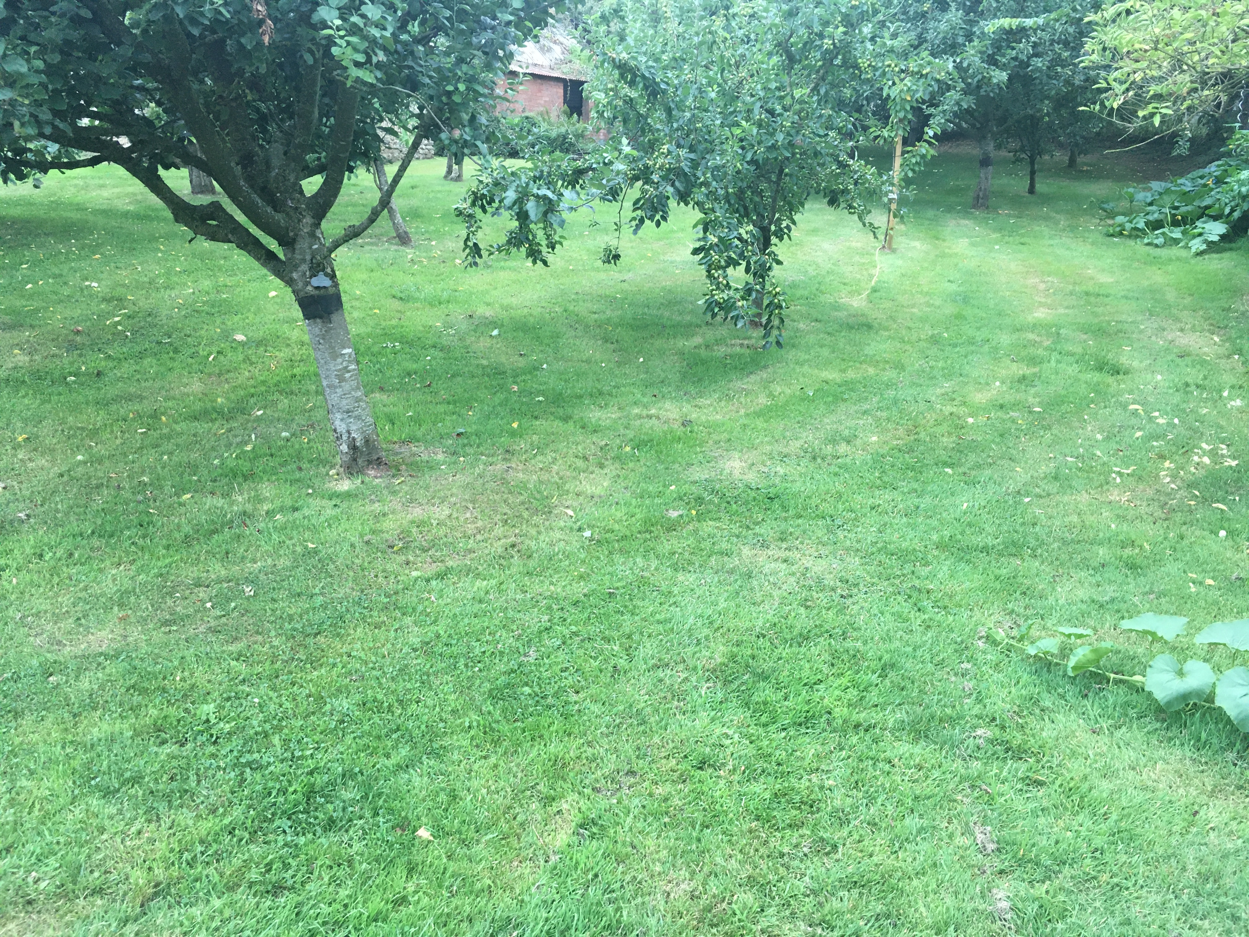 After our first year’s success with the lawns around the house, John spent a lot of time repeating the scarifying > aerating > seeding process with the rest of the grass in the orchard, around the compost area and in the wood – as well as repeating the front and back lawns. They look so much better than they did last year – although the combination of overhanging trees and hot weather means the grass in the wood hasn’t survived very well.