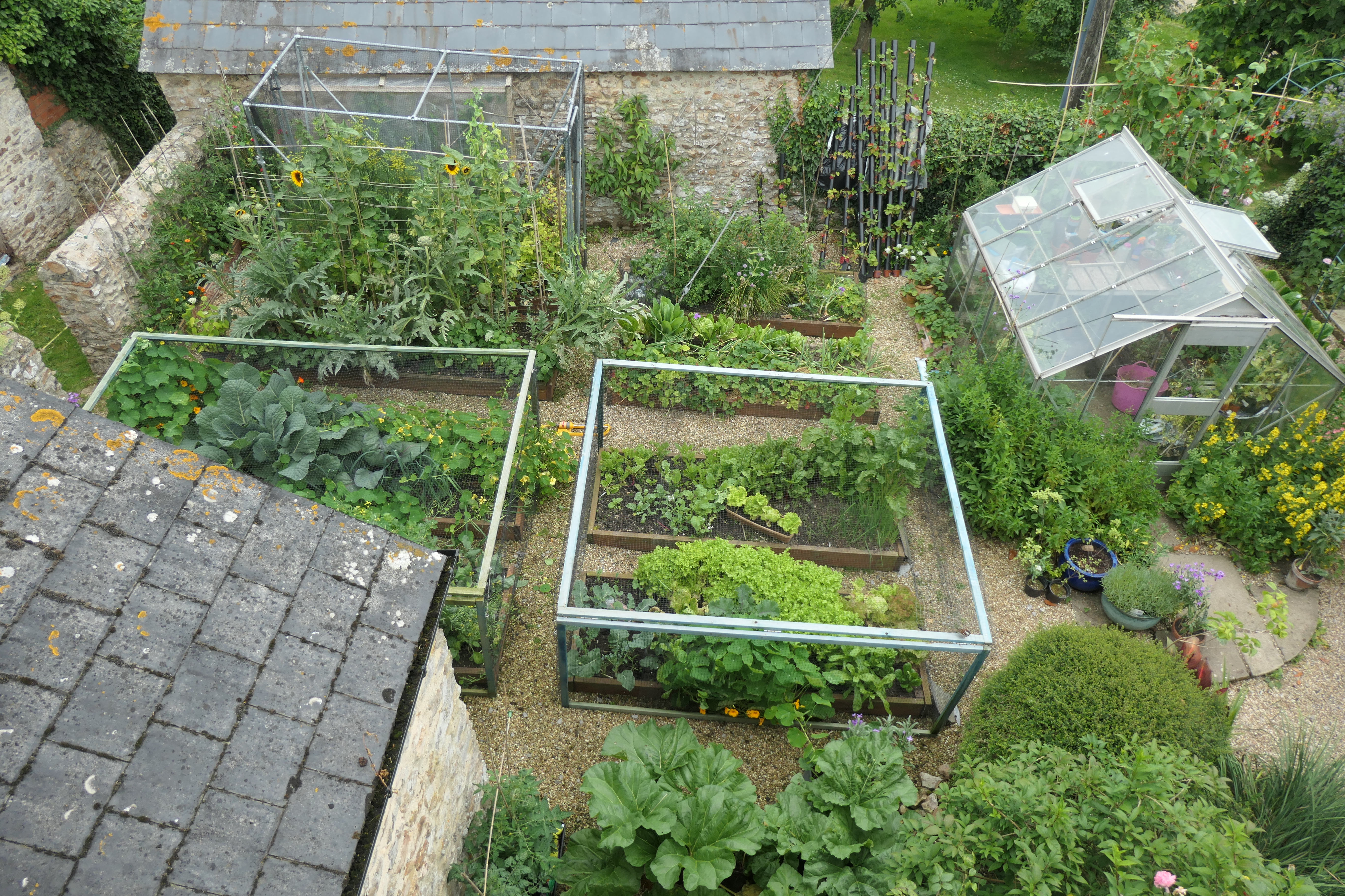 We finished our first full growing season in the kitchen garden, with some successes and many learnings too! I failed on my failsafe labelling approach as we still have courgettes labelled as squashes and a rogue broccoli growing amongst the brussels sprouts! We learnt to space out our tomatoes more, and moved the artichoke after they grew taller than the cover over the bed – although we need to rethink sharing their bed with the mangetout and french beans as they’re too closely packed this year. And this year we tried a different runner bean structure – more of a tunnel shape that’s more stable than last year’s attempt, which kept collapsing.
