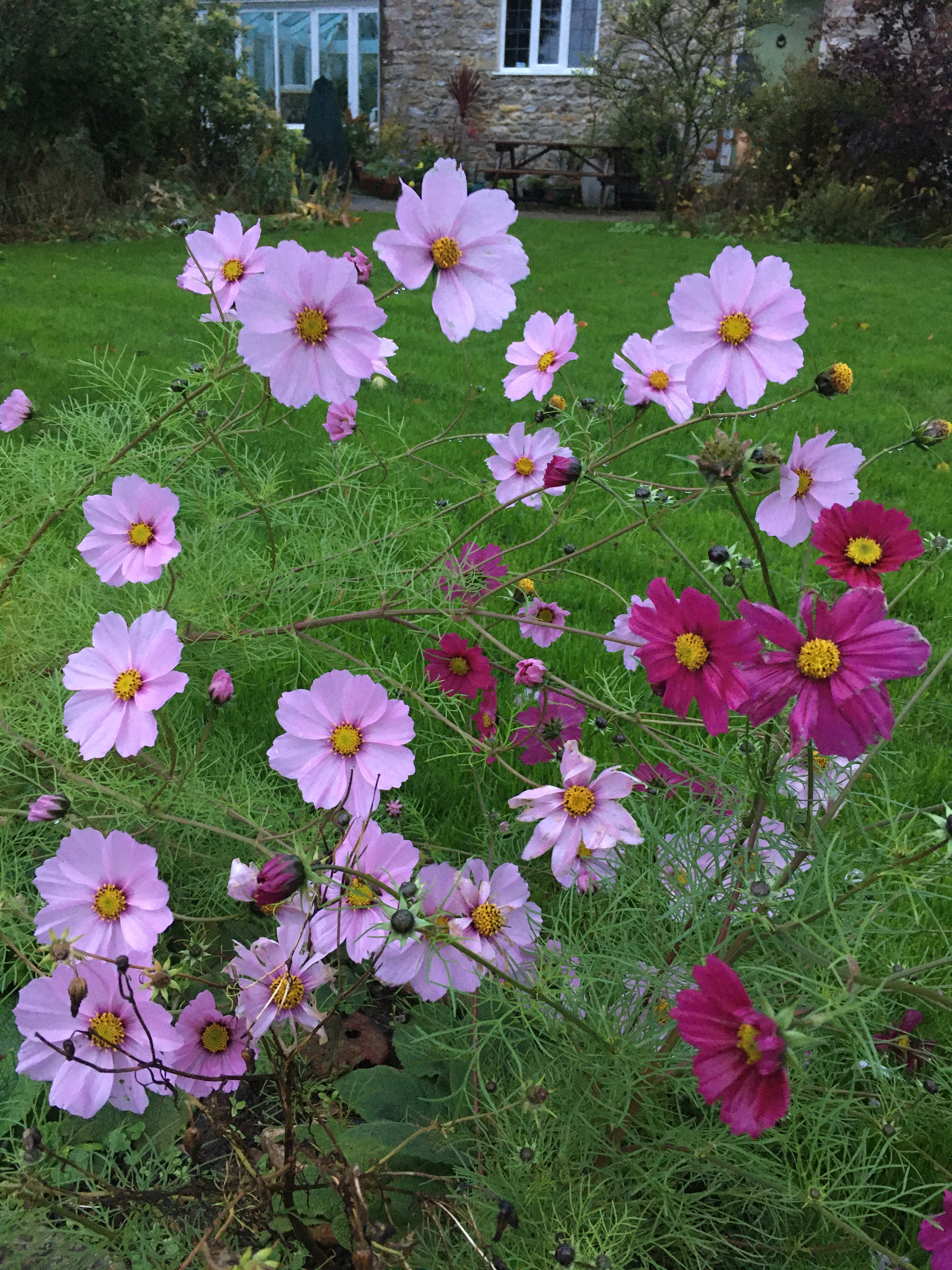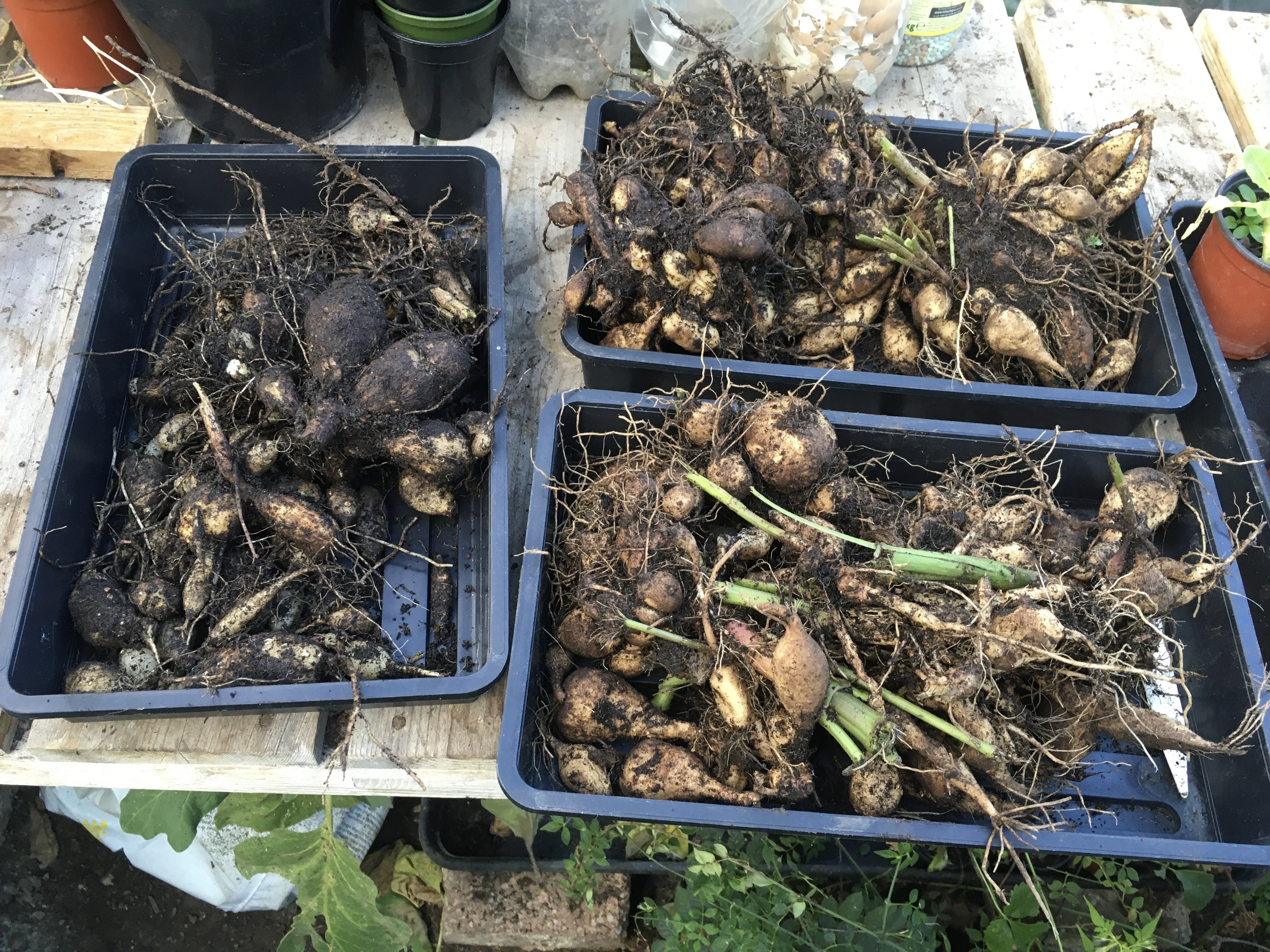 We lifted our first ever dahlia tubers too! It sounds daft but that’s one of those first-time jobs we dreaded a bit because we’ve never done it before – although it was much easier than it sounds. The tubers are now drying out in the greenhouse – hopefully we’ve done it properly so they grow again next year. Quite a few of our flowers are still in bloom because of the warmer weather, so we’ve left them for a bit longer as it seems a shame to pull them up. Plus it staggers the work and the rubbish a bit more – our compost bins are literally overflowing now.
