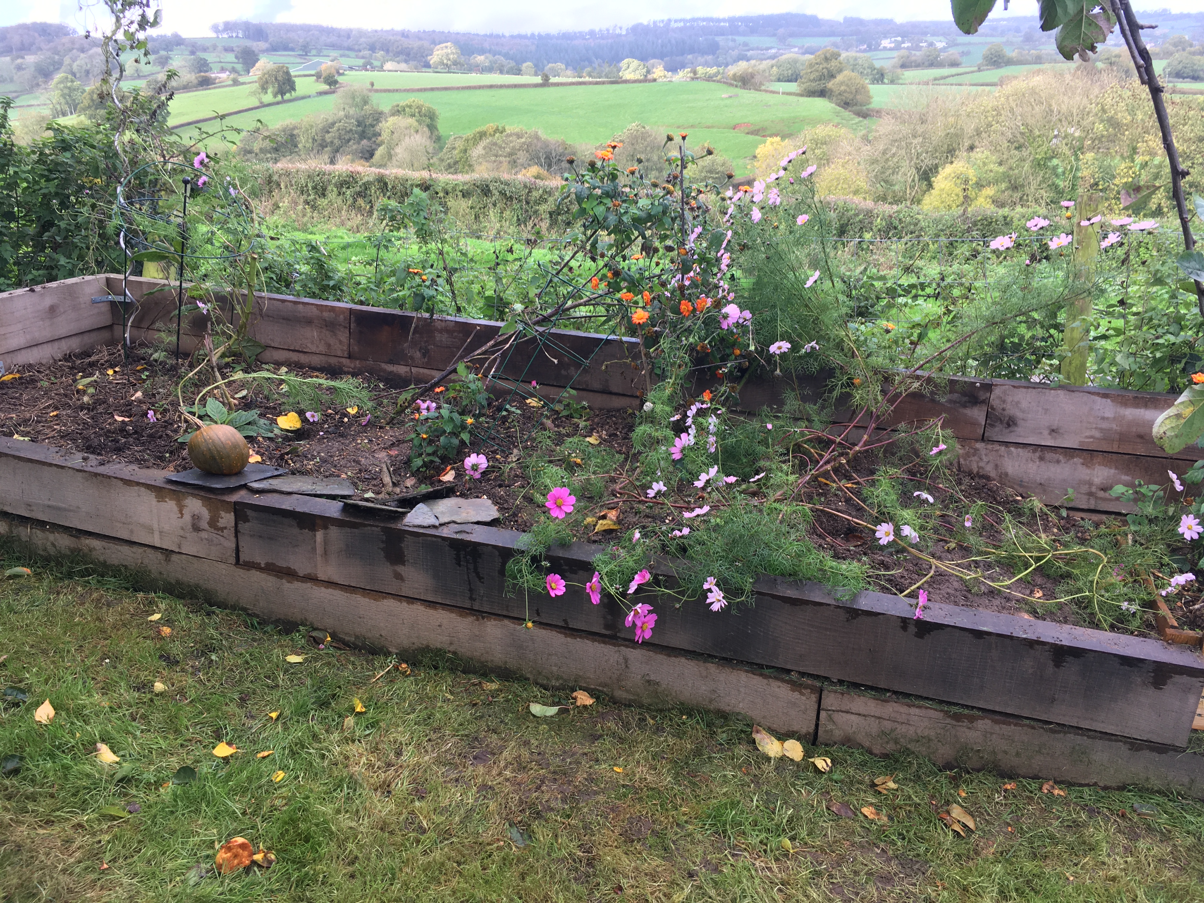 And we’ve actually made pretty good progress. Our job list was aspirational – the top 20 tasks we could think of that needed doing – and we’ve got through most of it, plus a couple of extra tasks along the way. We’ve managed to clear all the vegetable plants that are over, and cut back the raspberry canes. John mowed the orchard and wood to try and keep the grass under control (helpfully picking up most of the leaves too which saved us a job). We cleared most of our pumpkin patch (which feels early given it’s not quite Halloween!), leaving the cosmos and tithonia as they’re still going strong. We also cleared most of the bed next to the blackberry arch as we need to plant our autumn onions next week. We definitely should have planned ahead when planting the garden as many of the beds still have winter vegetables in, so it doesn’t give us many options when rotating the crops each year.