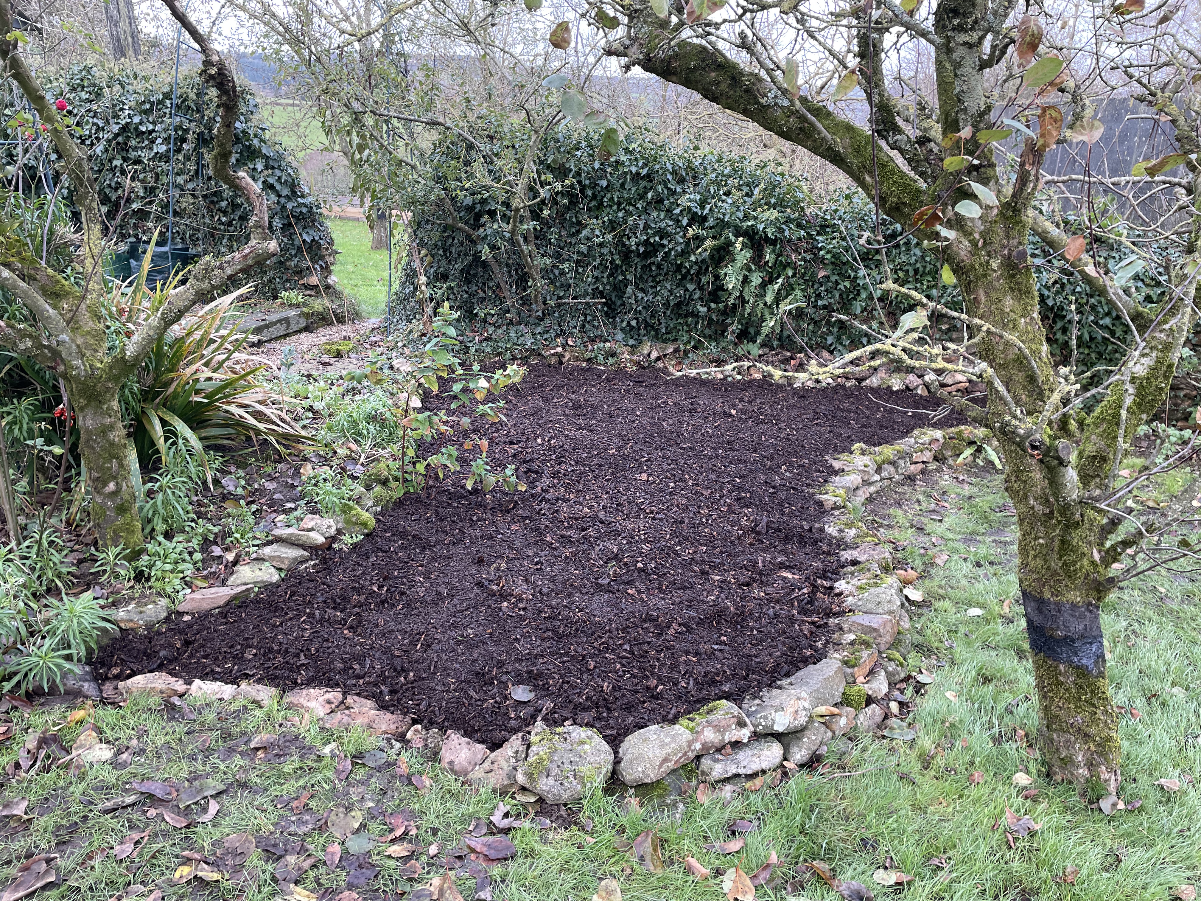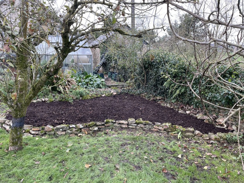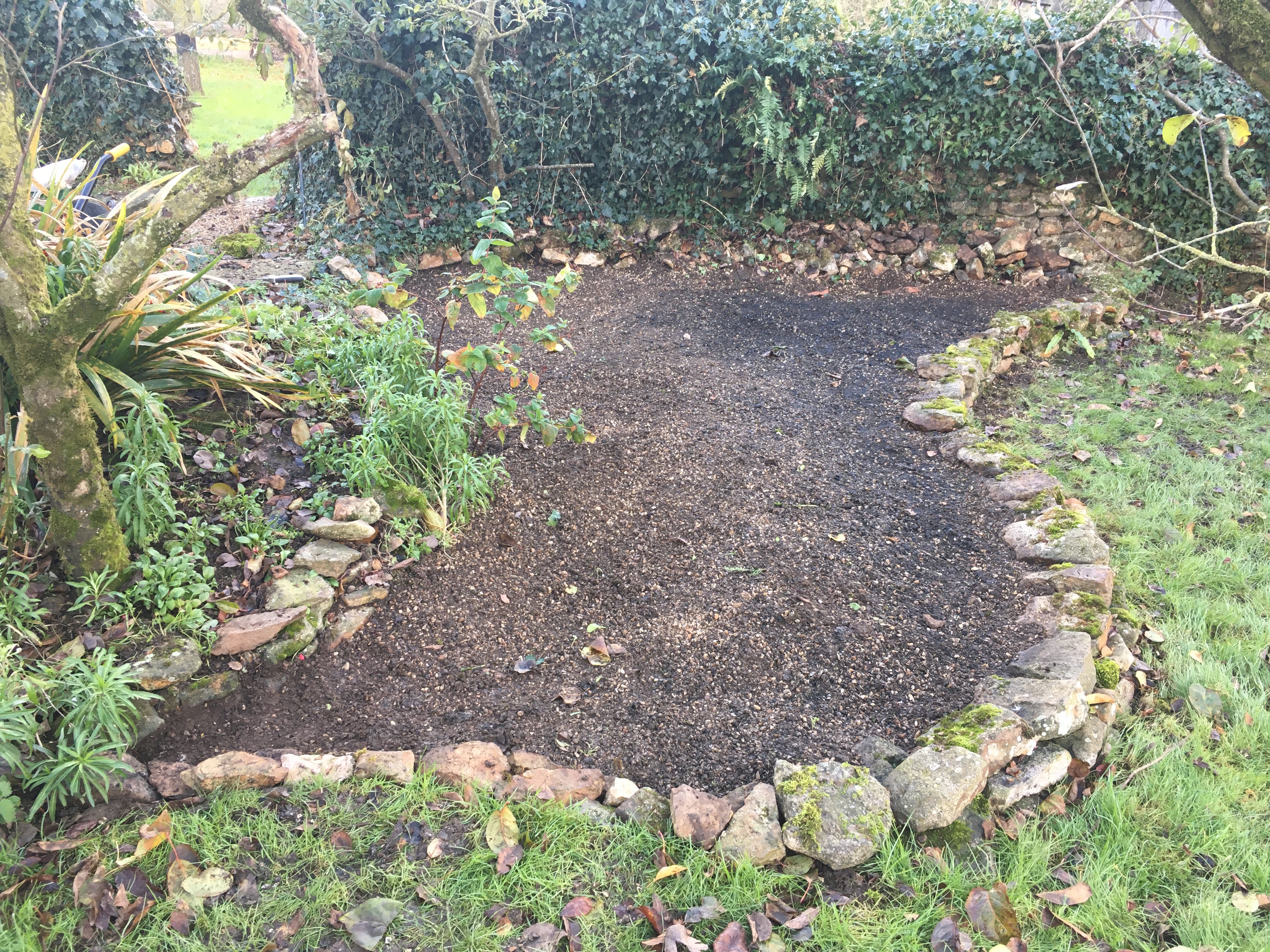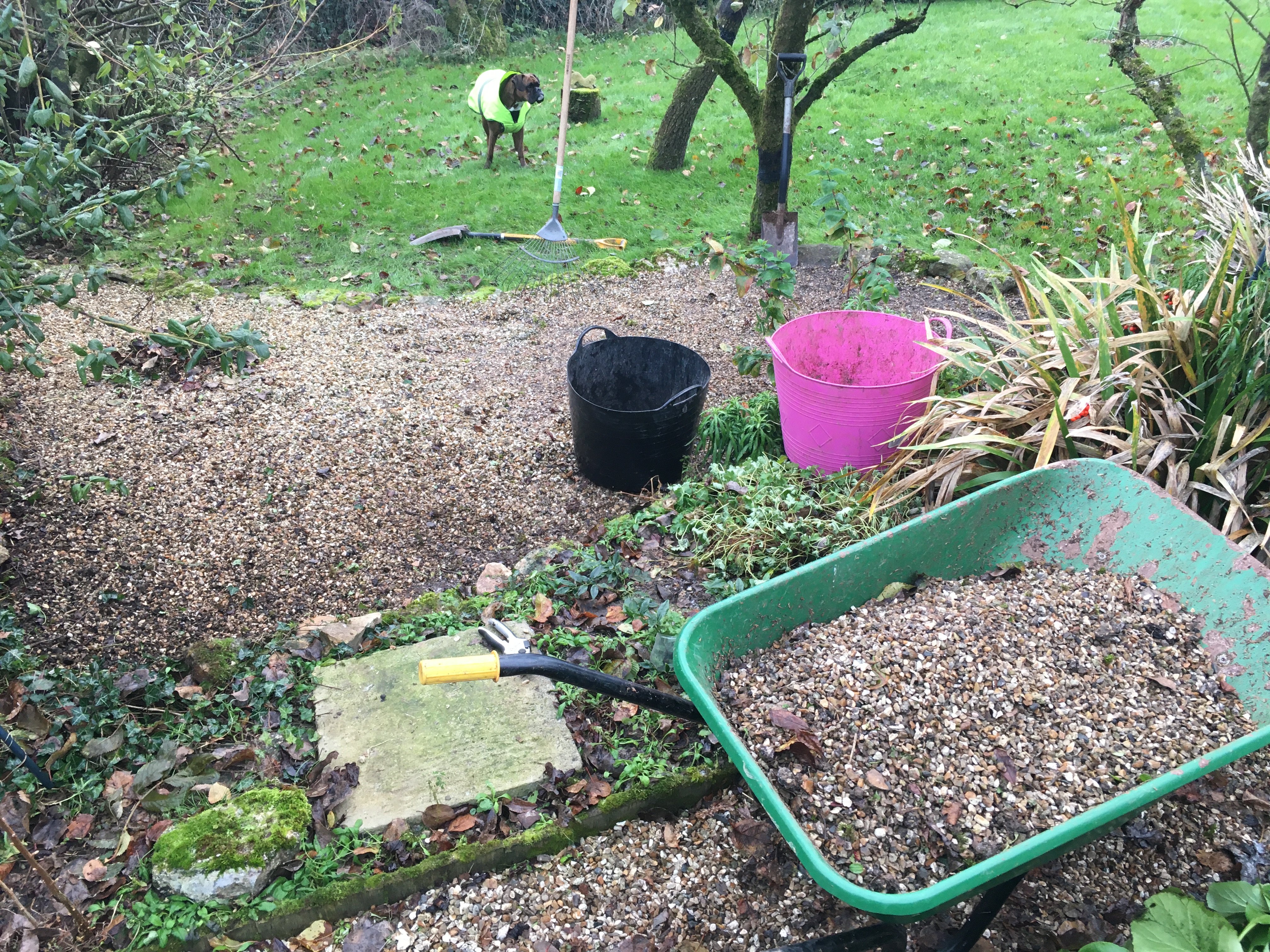 We’d already moved half of the woodchip a couple of weeks ago, putting it under the lilac tree in the back garden where the grass struggles to grow. This second patch we’d identified a while ago – someone had previously put gravel beneath the apple trees in the front garden (presumably for the same reason), but it means that the windfall apples get damaged by the small stones and ruin. We also wanted to top up the gravel paths in the kitchen garden as it’s getting low and the weeds are insane during the summer. It took us a few hours and what seemed like countless wheelbarrow trips to clear all the gravel out – it was hard to know when to stop as there was so much soil amongst the bottom layer of stones. We moved as much as we could, and then realised we’d forgotten to get weed membrane and so had to make do with the strip we had left – hopefully it won’t be too much of a problem. Moving the woodchip was a much quicker job, despite it being frozen solid in the bags and needing to be broken apart with a pickaxe! The area already looks much better and neater though. We also rebuilt the stone edge of the area, some of which had disappeared over time.