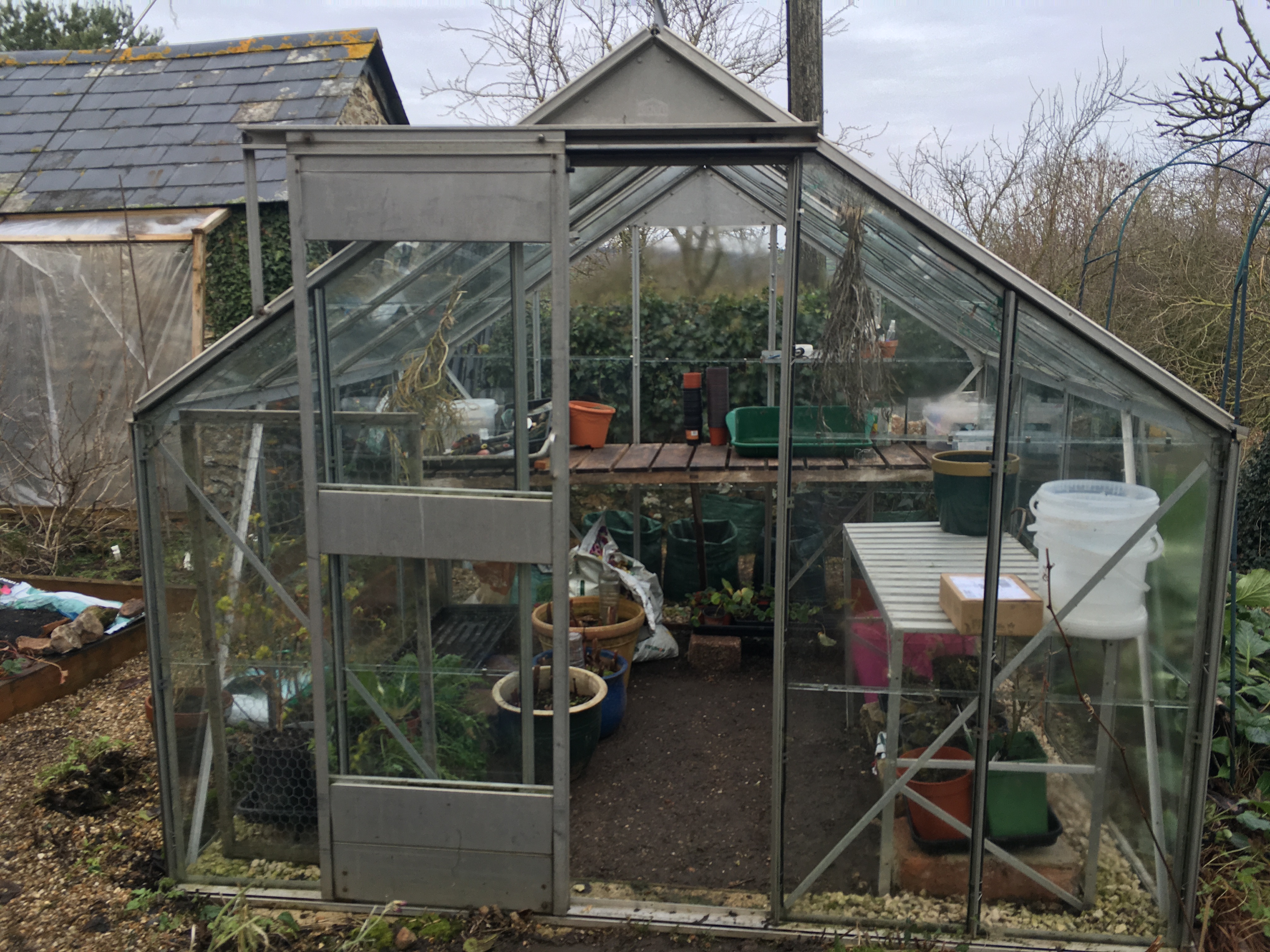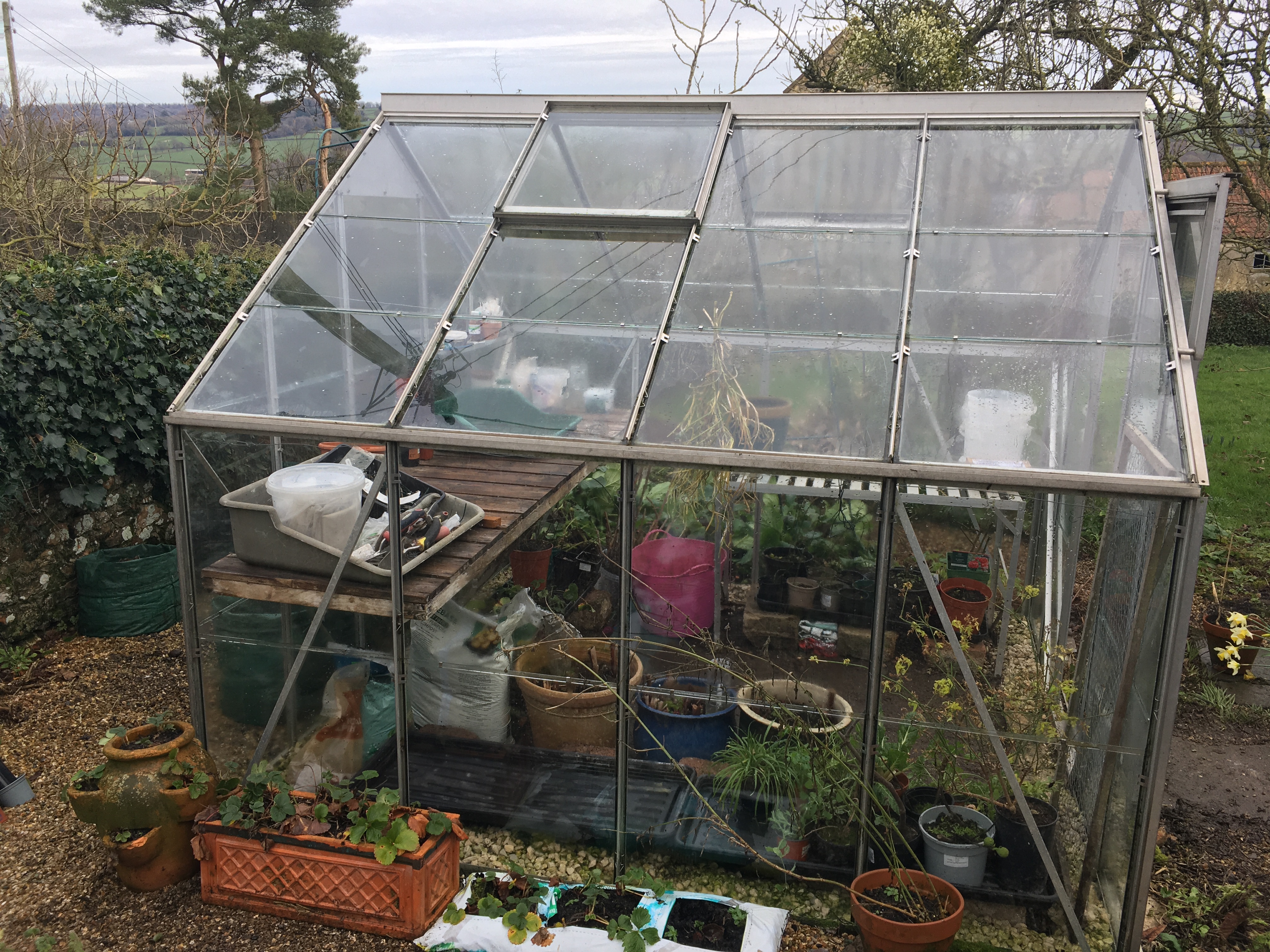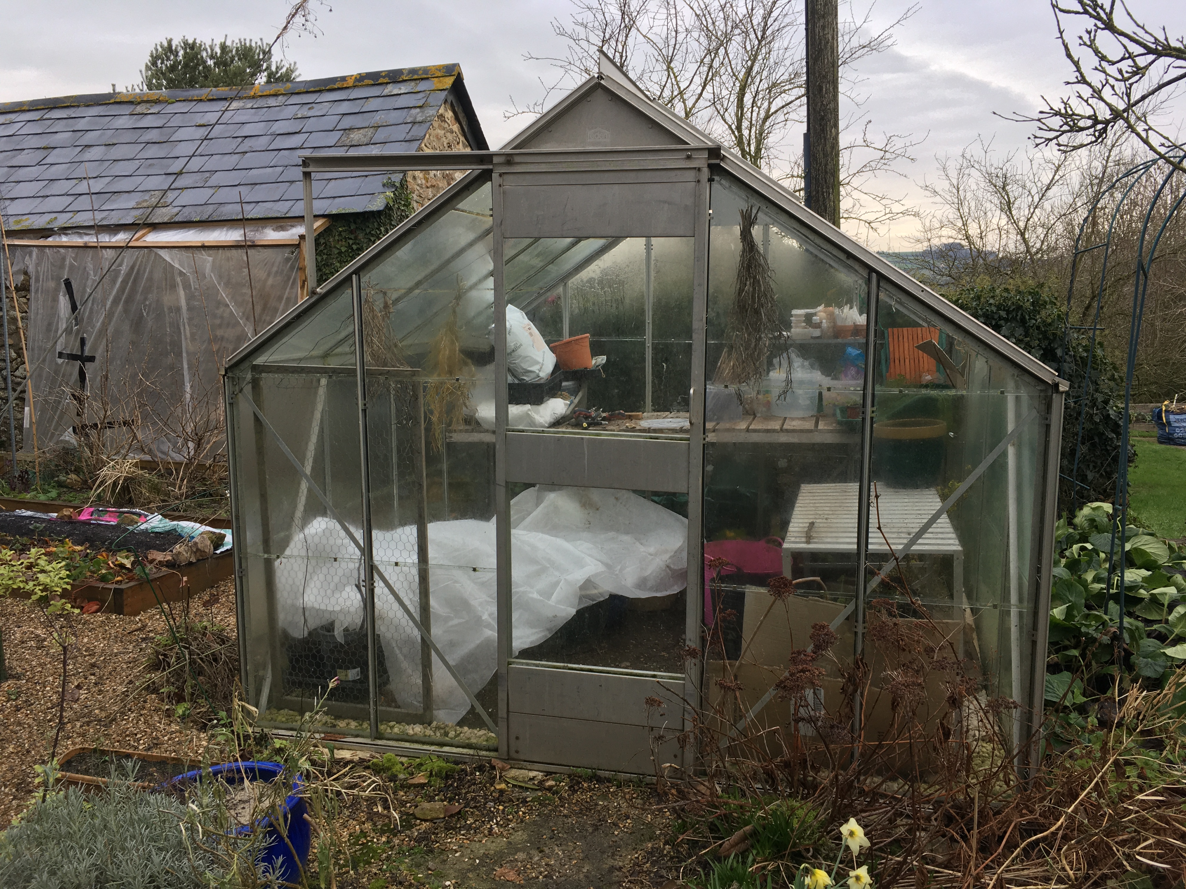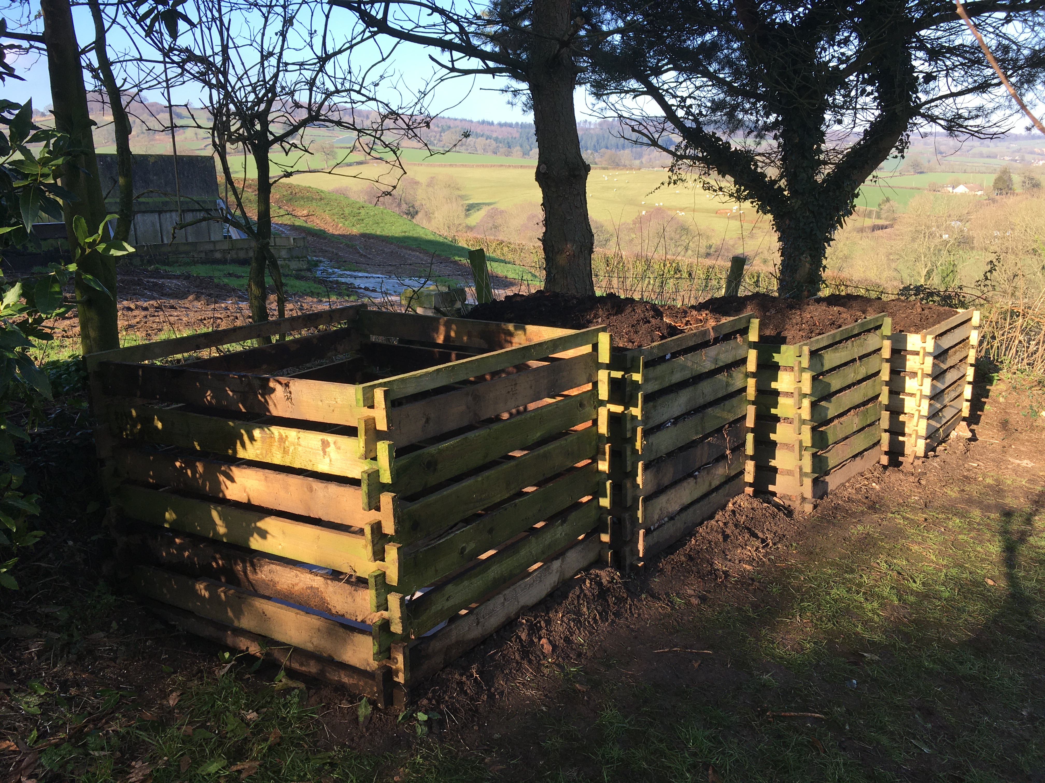 Much better location for your compost bins and the greenhouse looks great and ready for seedlings