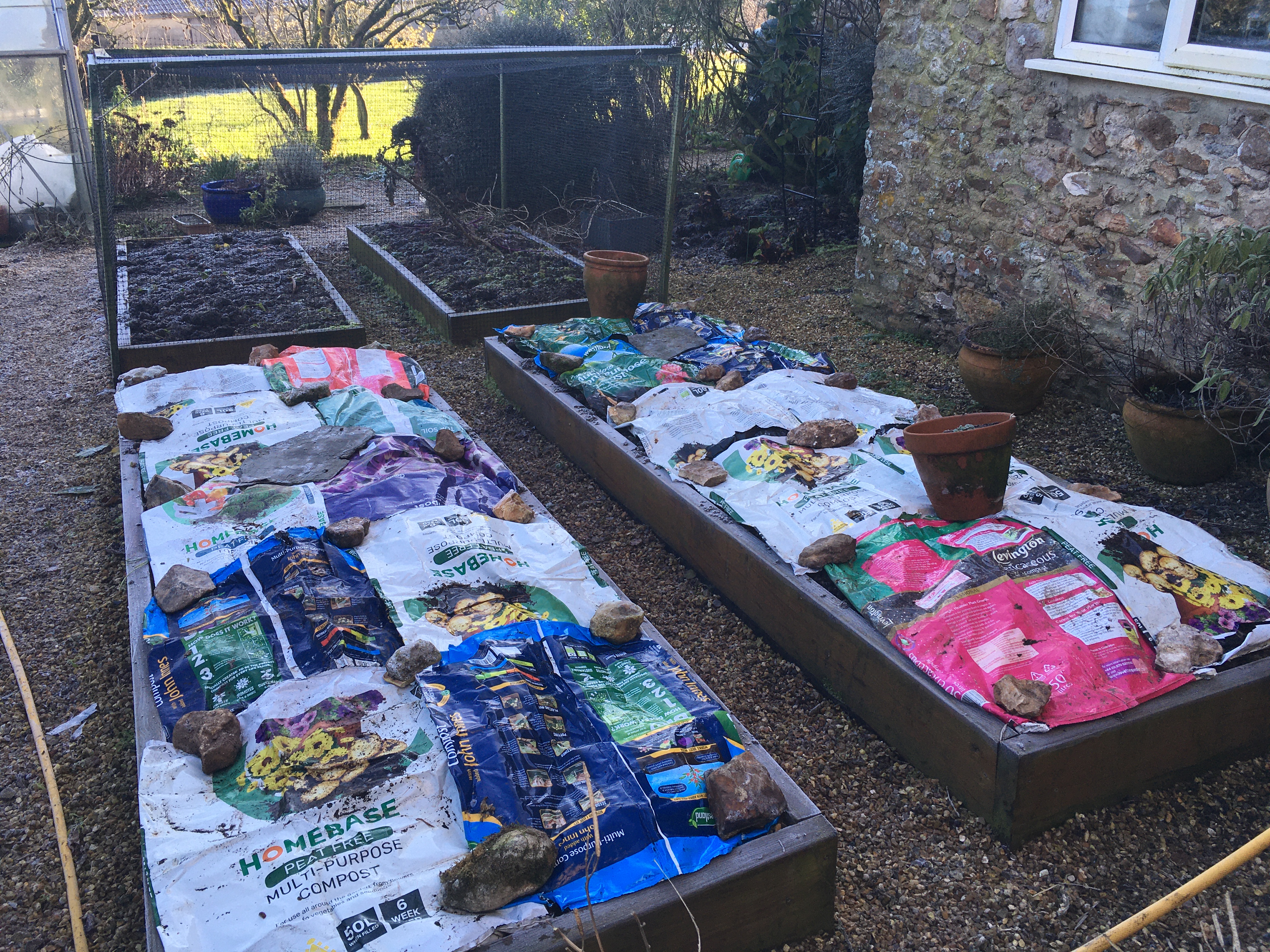 We also managed to work through a few random garden jobs – we’ve used up most of the remaining vegetables batch-cooking soup, and so have started covering up the empty beds in the kitchen garden to warm the soil and hopefully get some early planting in. John has set up his new rain gauges and thermometers that he got for Christmas – although now he keeps pointing out how cold it is indoors (personally I think the temperature gauge is still settling down!).