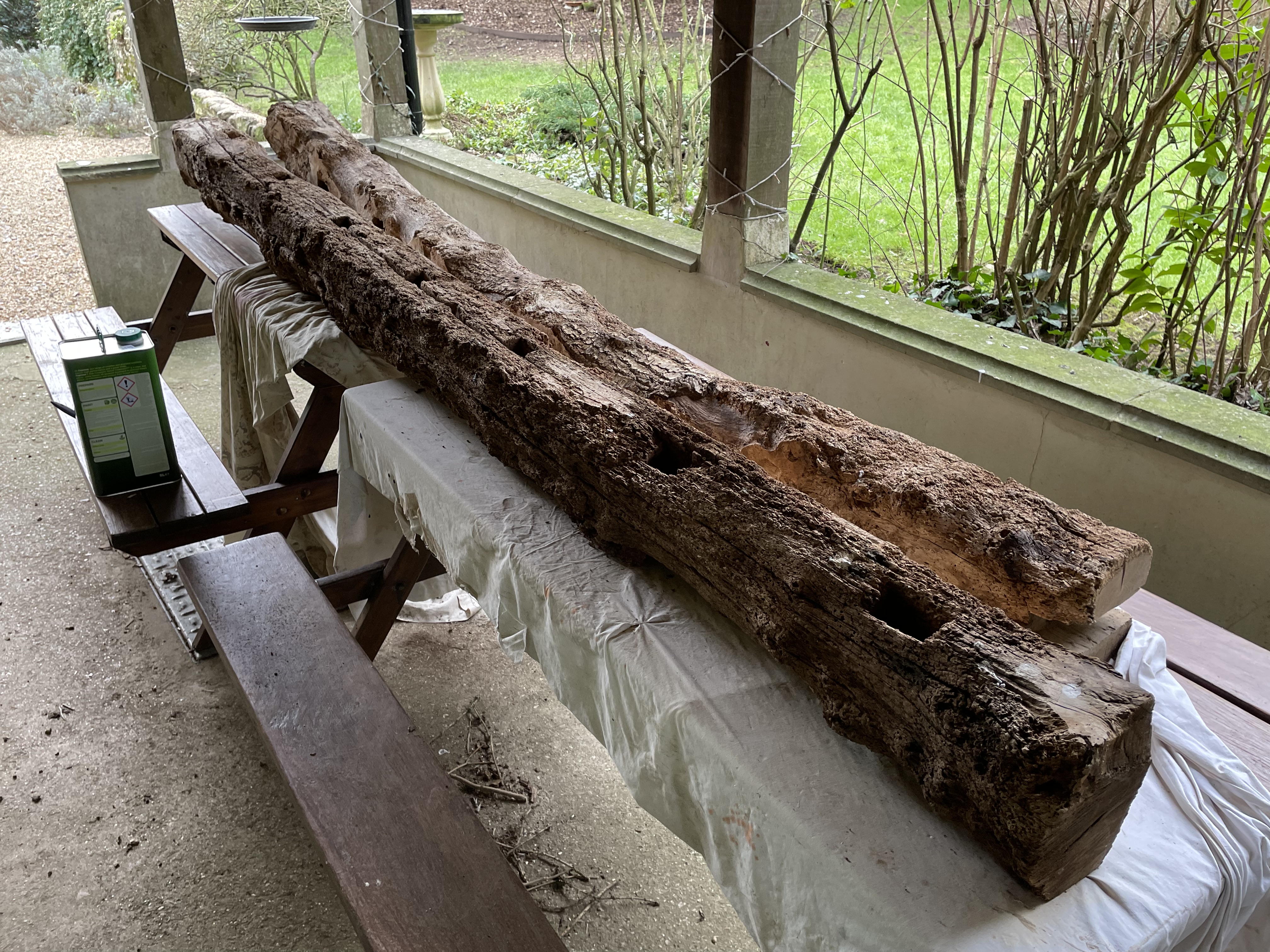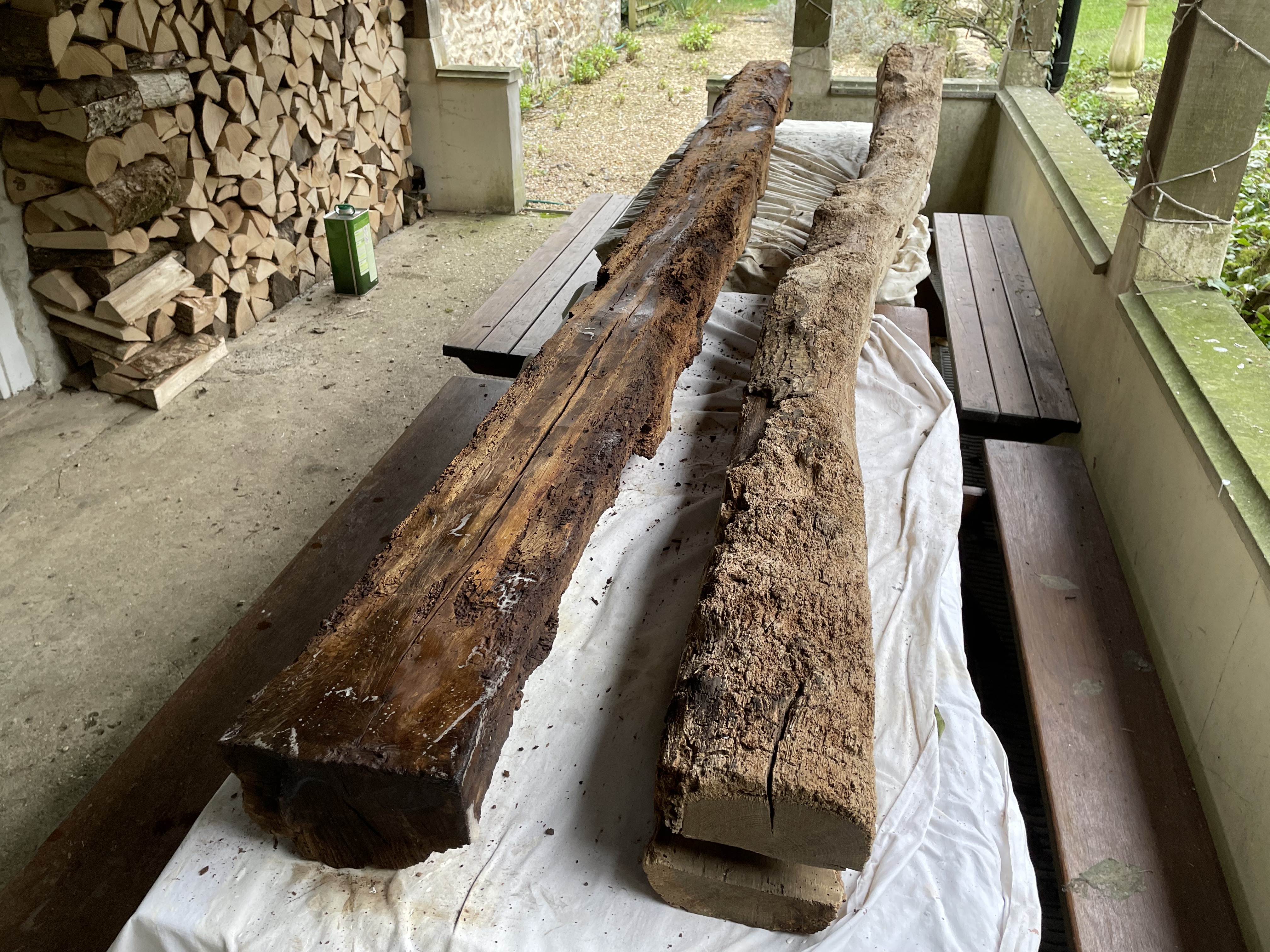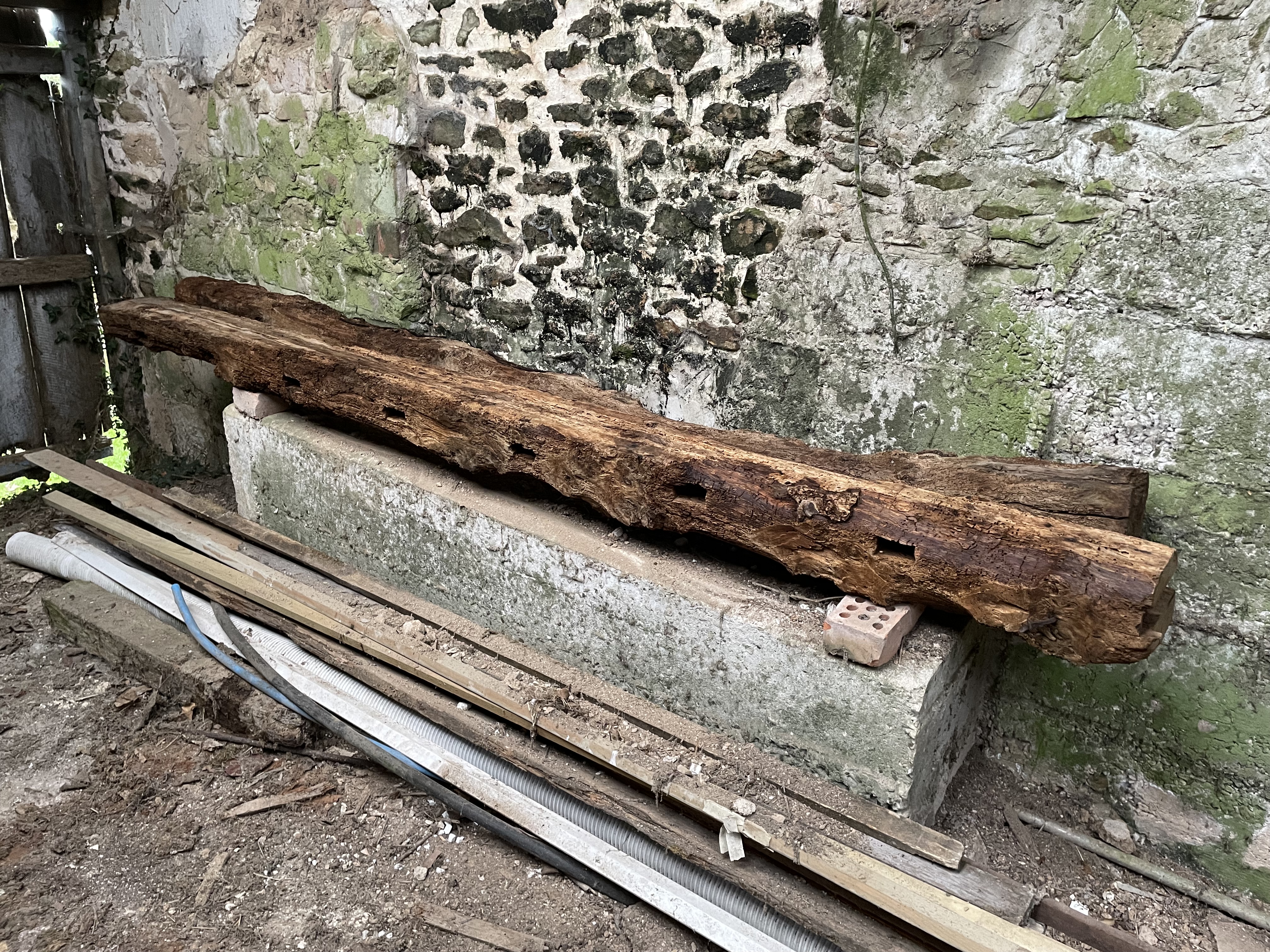 At some point we also need to move the chest freezer out of the main barn, where it’s been living for the last year. Eventually it’ll go into our ancillary barn but as that’s not yet built, it’ll temporarily live round the back of the farmhouse under our terrace – right where we’ve been storing the old beams we cleaned up to use for light fittings. So one of the other priority jobs this weekend was to treat the beams (just in case the woodworm holes were current) and move them out of the way to be stored. I think we used up 4 litres of wood treatment in the end – not a quick job, but worth it if we can reuse them.