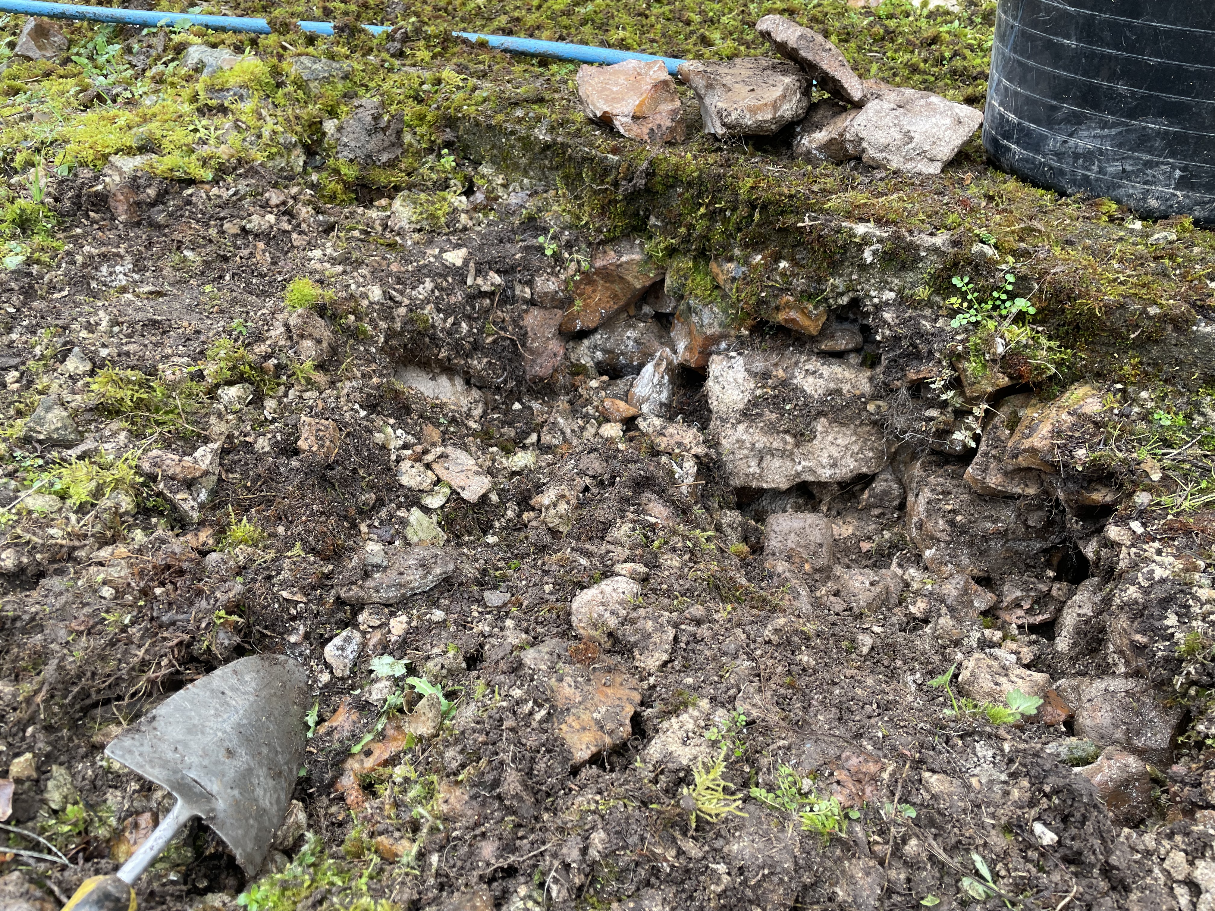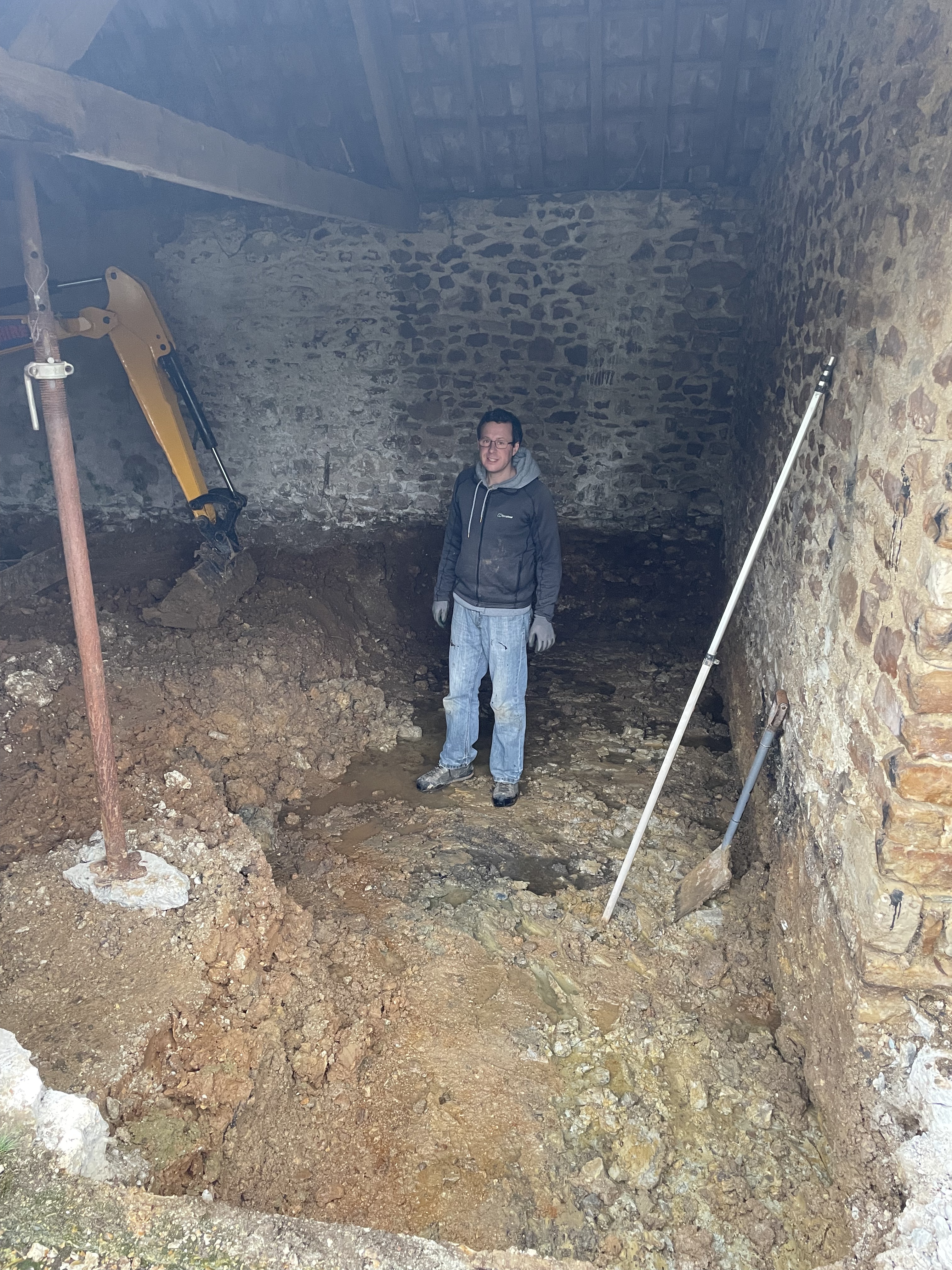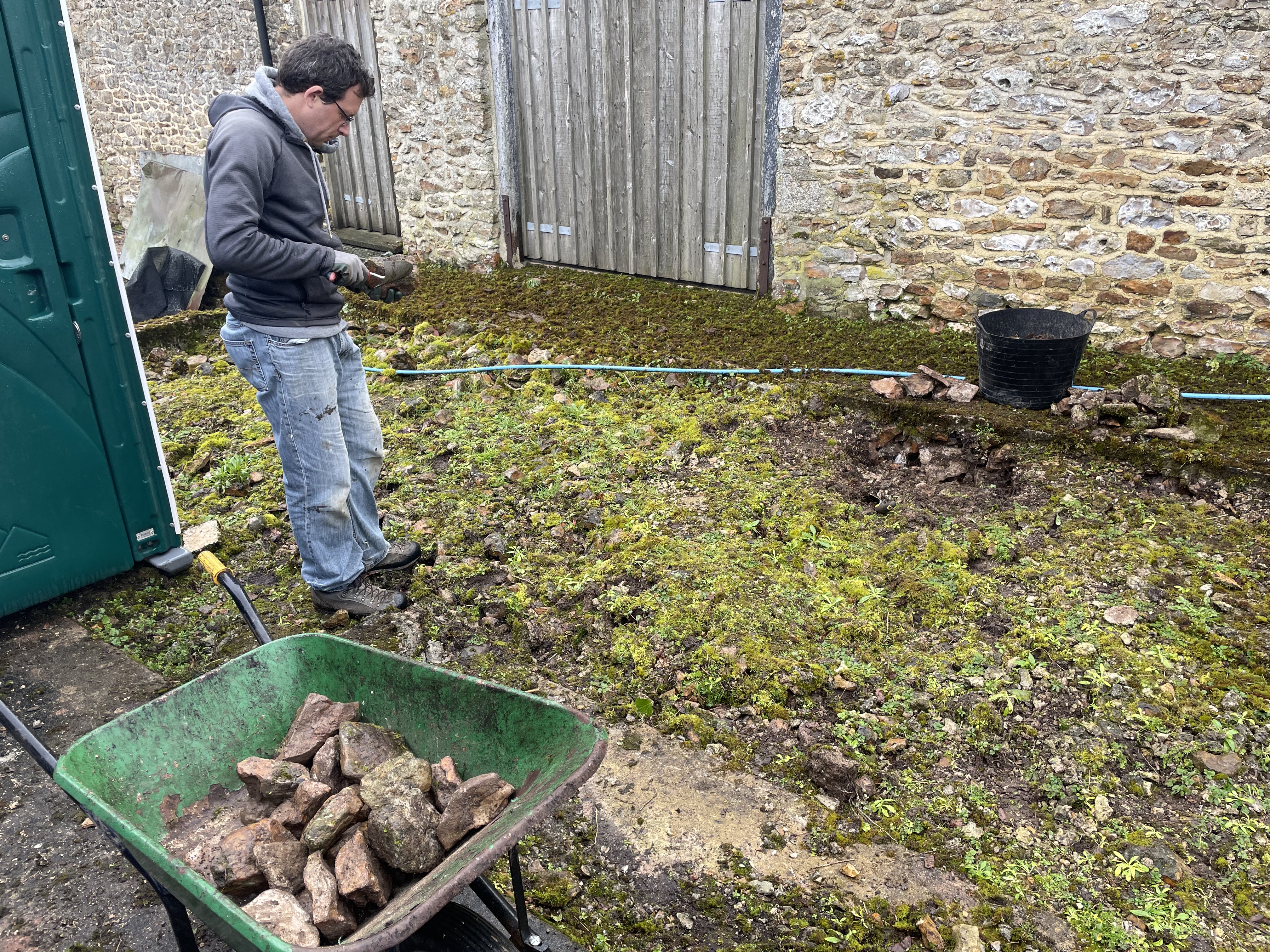 All the concrete and stones that are dug out are being stored in the derelict barn (the one we’re going to demolish and rebuild). Our builder is still investigating whether it’s cheaper to take away the old material and bring in new material that’s ready to use; or to hire a crusher and use what we can on site, while recycling the rest locally. We’re really keen to reuse whatever we can locally, because of the carbon impact of transporting materials all over the place, but it’ll be hard to justify it with our limited budget if the costs are significantly different. We need a lot of stone to face the new barn walls, so we’ve spent most of the weekend salvaging whatever stone we can – both from the pile dug out, and from the footprint of an old barn – to minimise costs and also to avoid bringing in new materials. It’s a pretty hard job moving stone for hours on end, especially when it’s covered in clay soil and needs to be cleaned. We’ve managed to double our stack of clean stones though, so it feels well worth the effort.