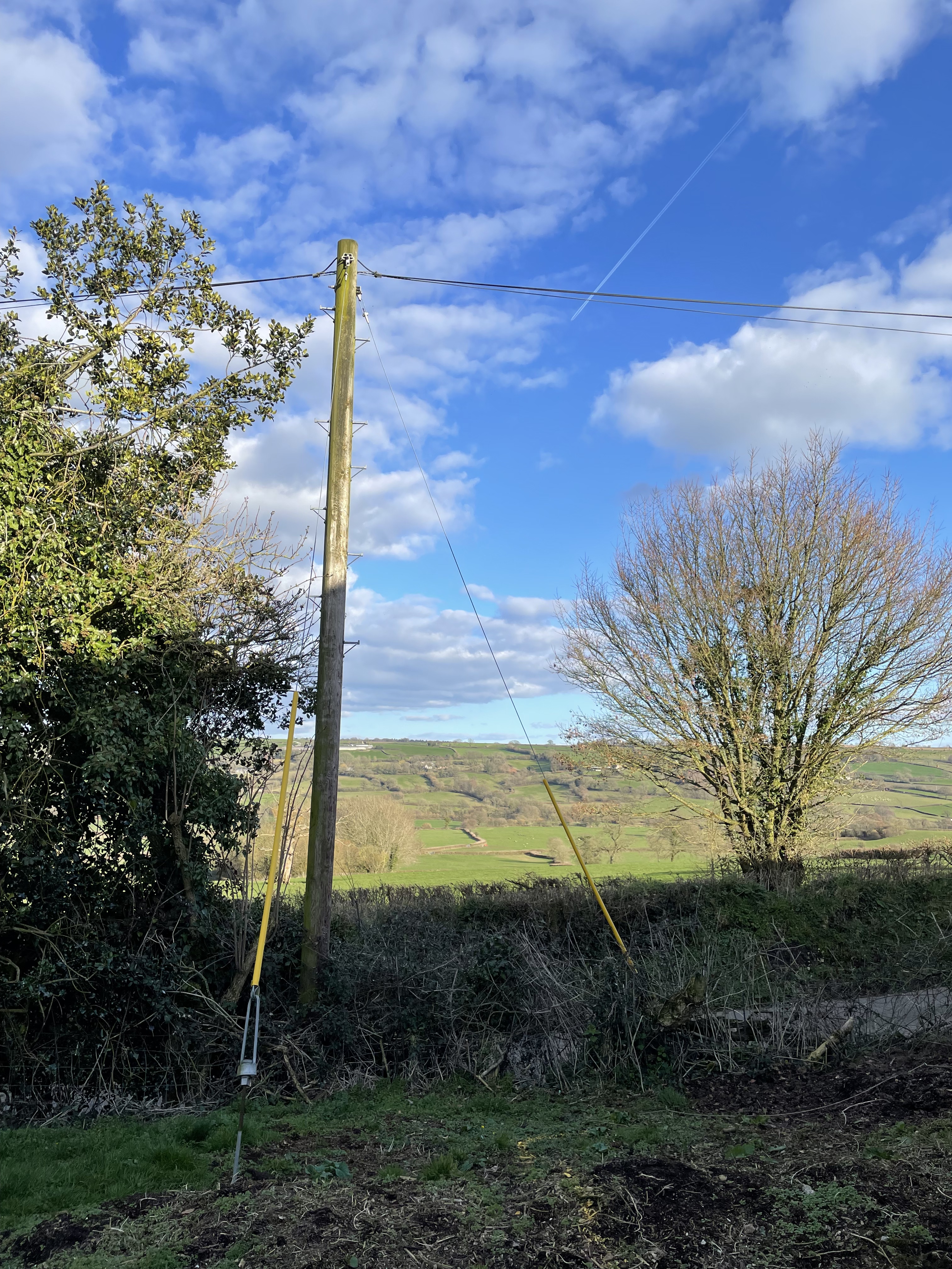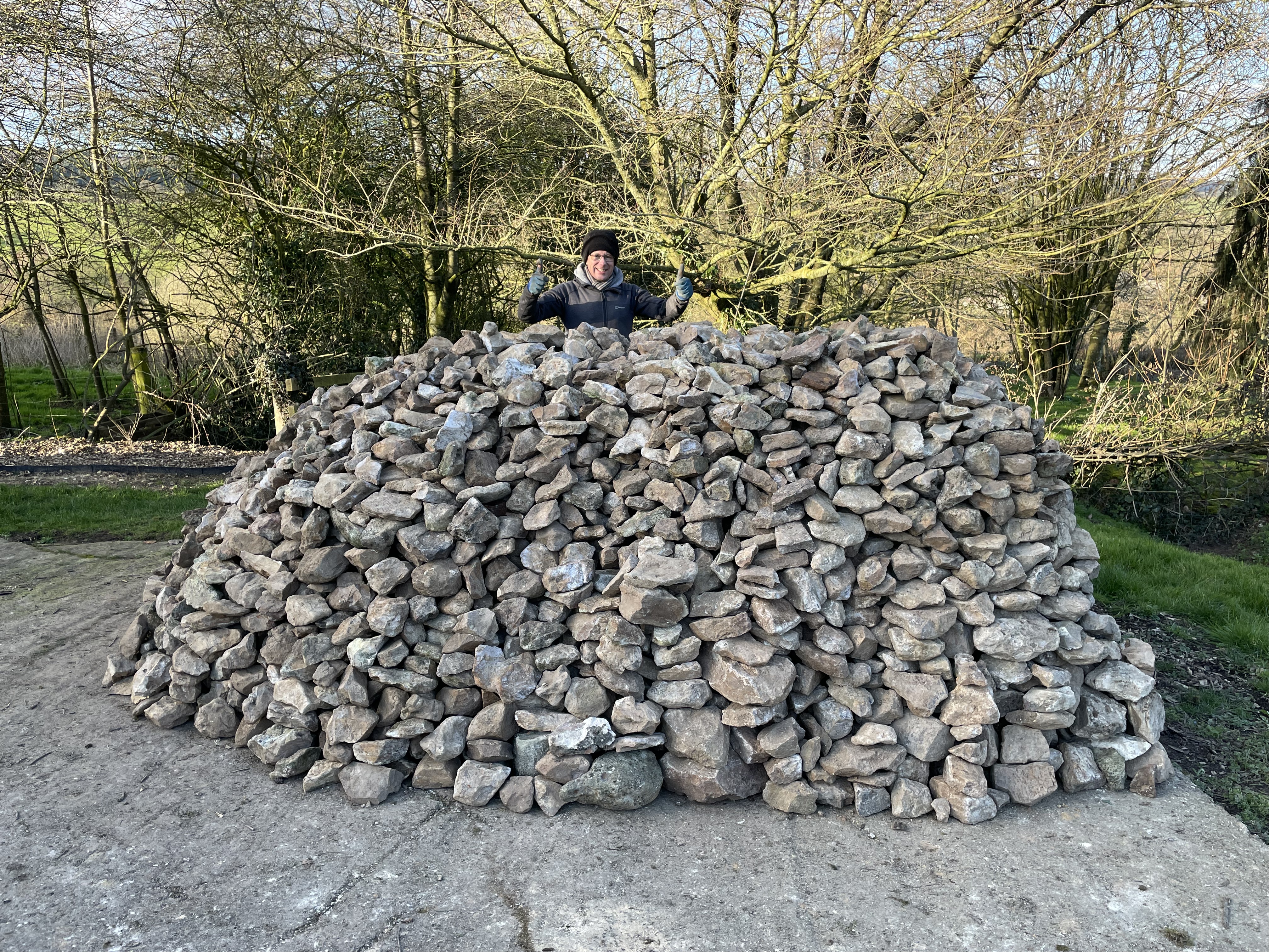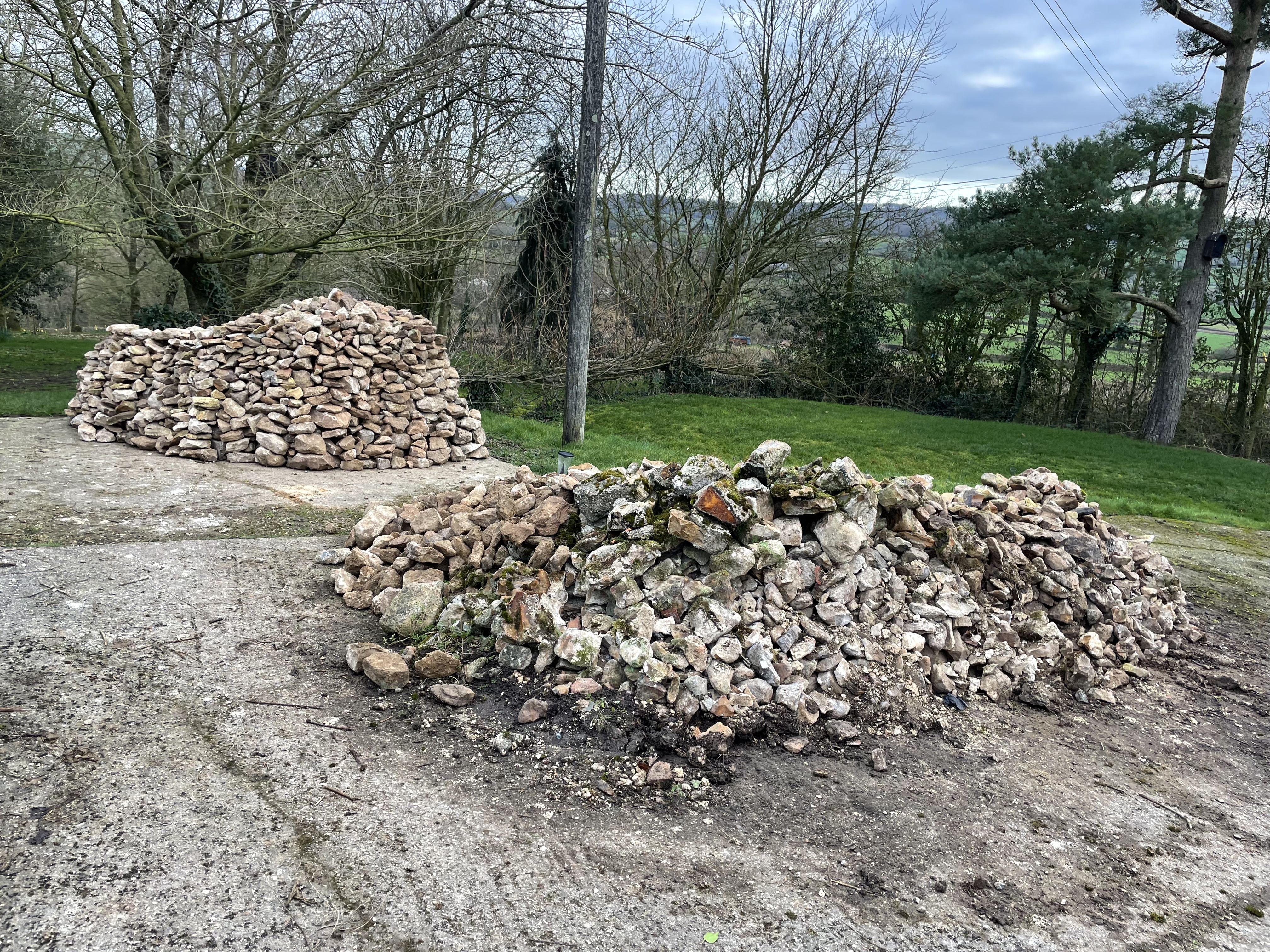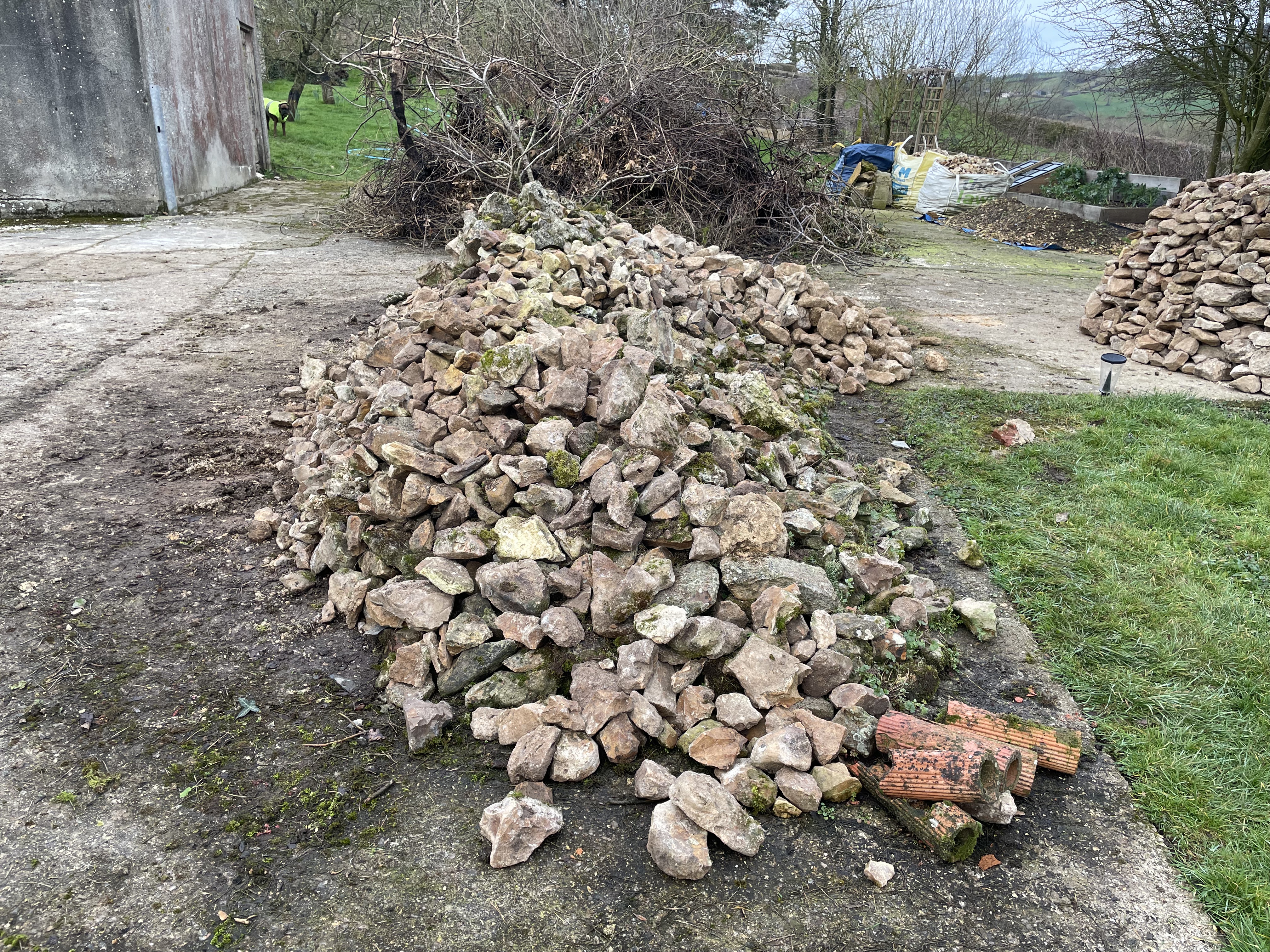 We had more positive news this week in the form of a visit from BT Openreach about the telegraph pole and bright yellow supporting cables that are just outside our new lounge window. We’d previously asked them about options to remove the cables, and were fully expecting to have to pay for a thicker replacement pole that could stand by itself. Instead, it turns out that the cables aren’t actually holding the pole in place at all (one has been uprooted by vegetation over the years, and the other one isn’t tensioned so is effectively doing nothing) – which is fantastic news as it means they can be removed easily. The only challenge is that – where the telegraph pole is next to the road on the border of our land – we’d either need to provide access from our side, or pay to close the road (also a ‘main’ route between villages). The huge pile of stones we’ve been saving to face our new barn is right in the way, so we needed to move this before Openreach come out.