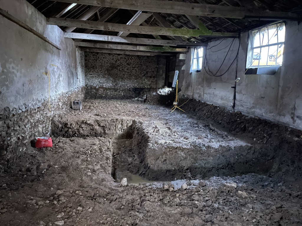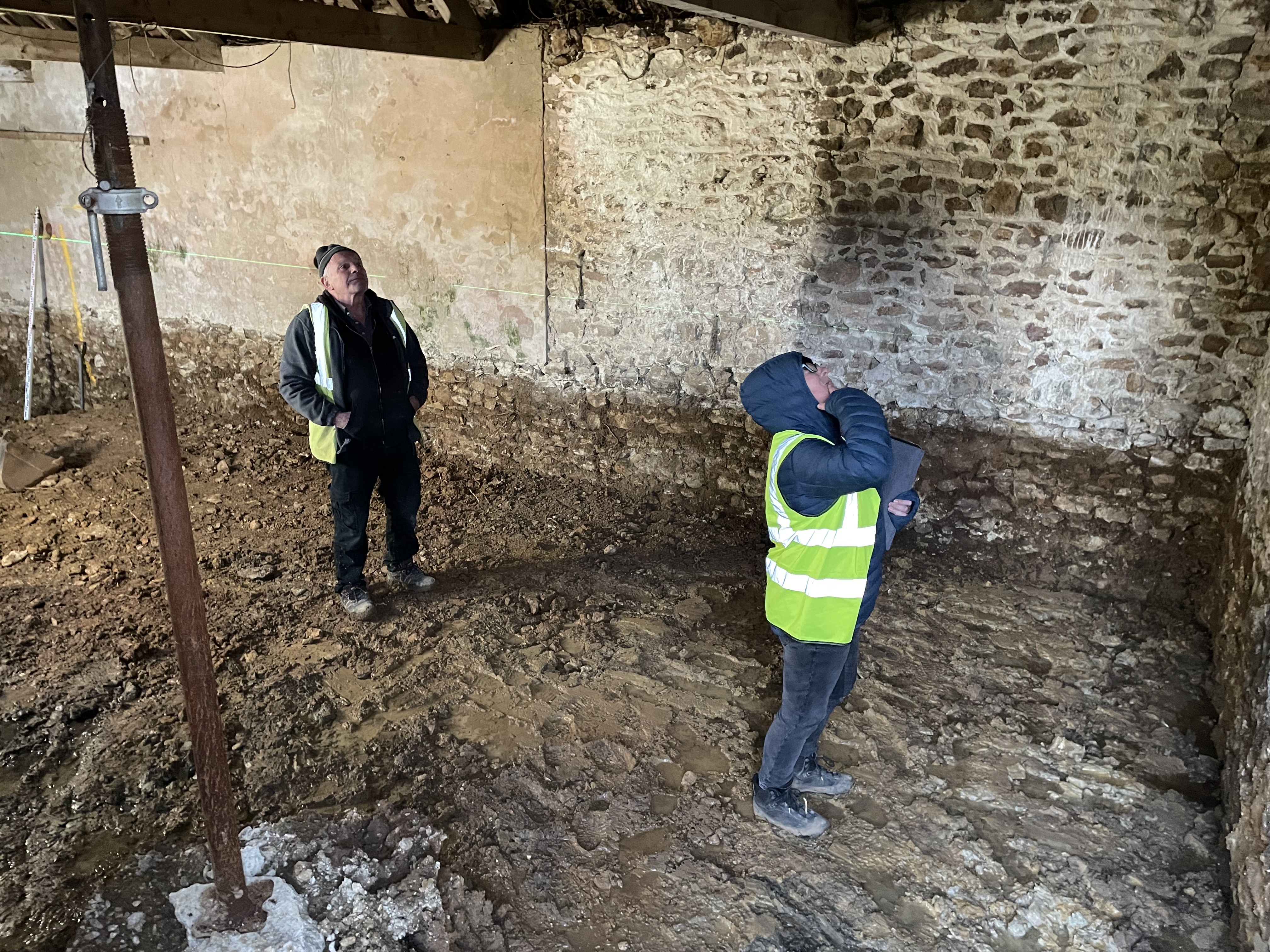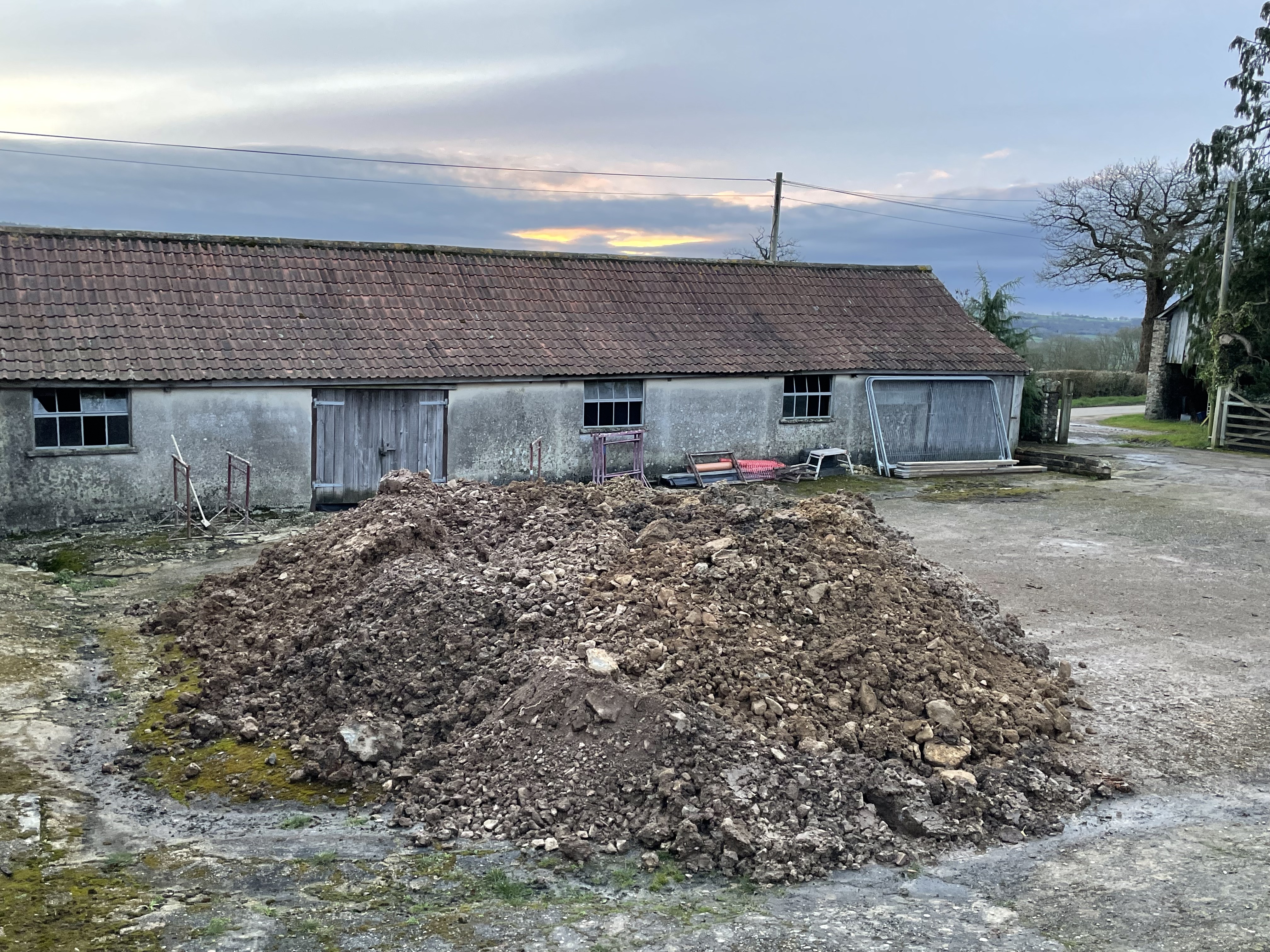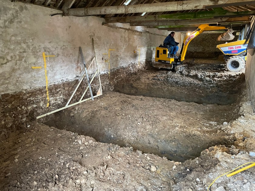 Week two, and building work seems to be progressing well. Our builders have dug out the concrete from the shippon floor, and have taken down the internal wall to open up the space completely. They’ve had to dig quite deep because the roof beams are fairly low (cow sheds don’t need much headroom), and we need to allow space for the various flooring elements, as well as making sure there’s enough height once it’s completed. Luckily the existing foundations seem to be very deep, so there’s not much underpinning required to support them (this could have been expensive!)