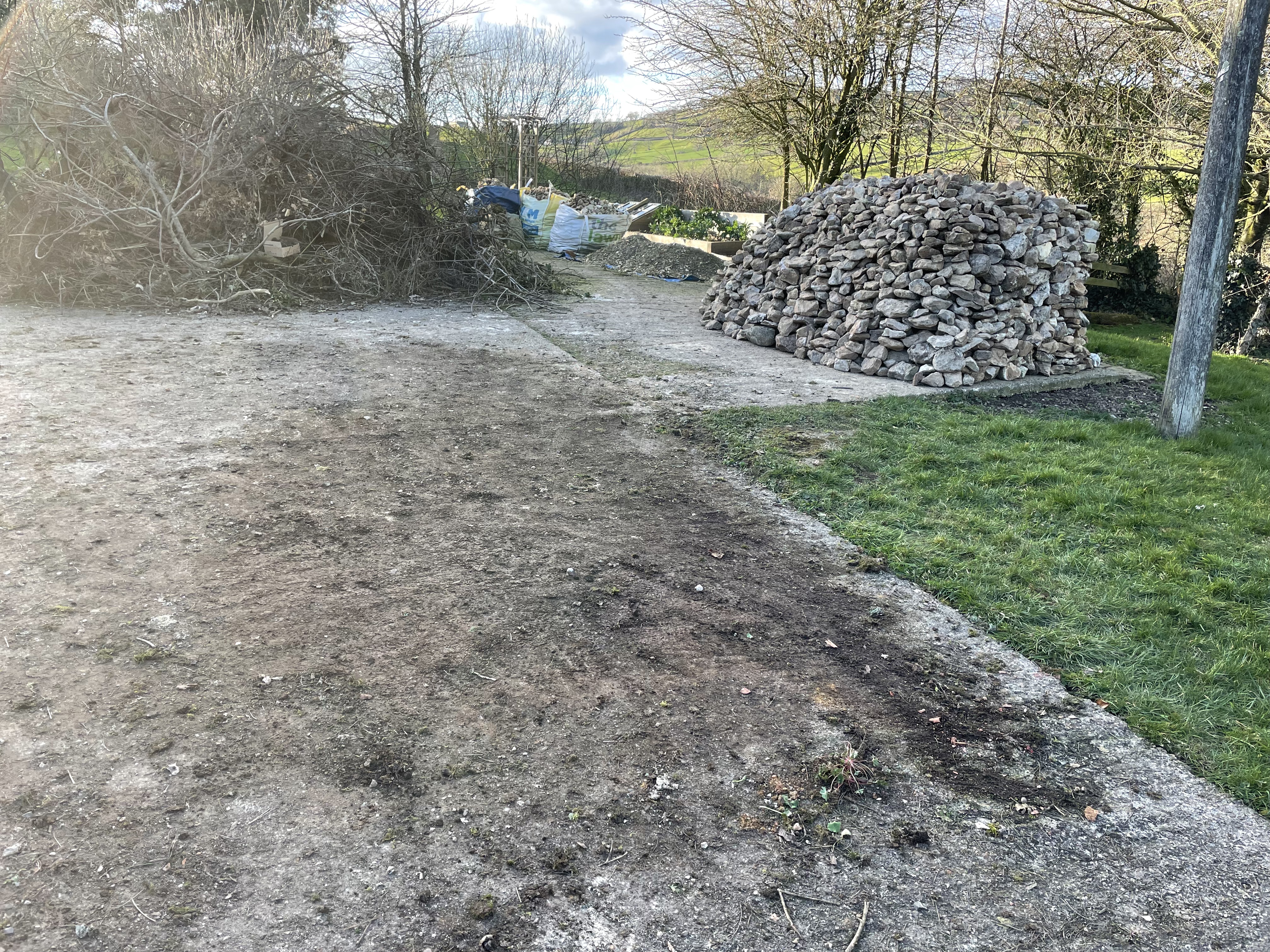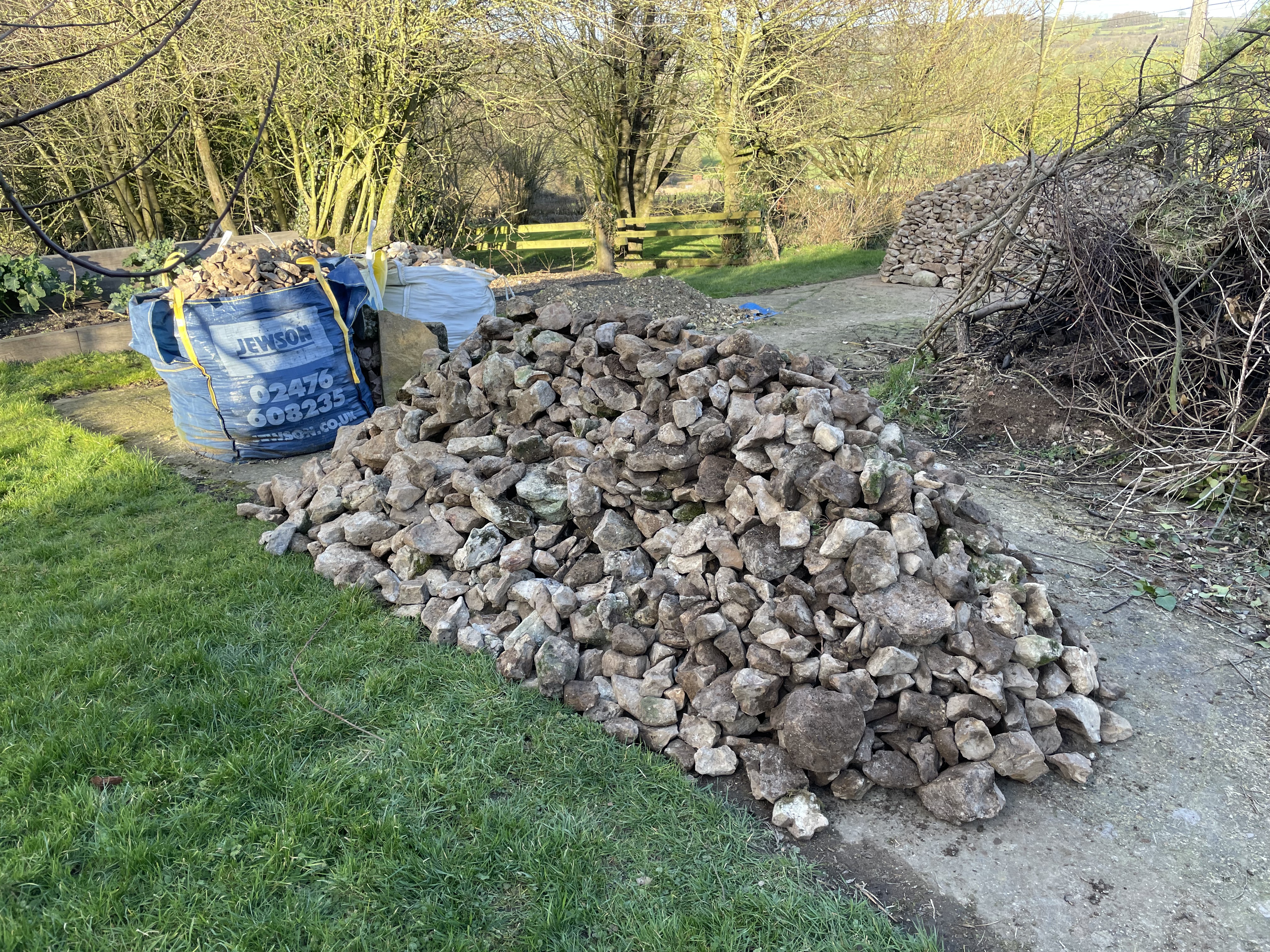 We’ve been working through the pile of stones for the last few weeks, cleaning all the dirt and moss off before stacking them ready to be used – but it’s not an easy or quick job. We’re running out of time as Openreach also need to do their work before our builders start digging the foundations for our extension, which will block access to the telegraph pole. So we’ve spent most evenings and all weekend working our way through the pile. We managed to clear about two-thirds of it, before deciding to move the rest to another part of the garden, giving us a bit more time to clean them. It’s frustrating having to move them about the place so much, but it can’t be helped – and it’s better than spending a thousand pounds to close the road!