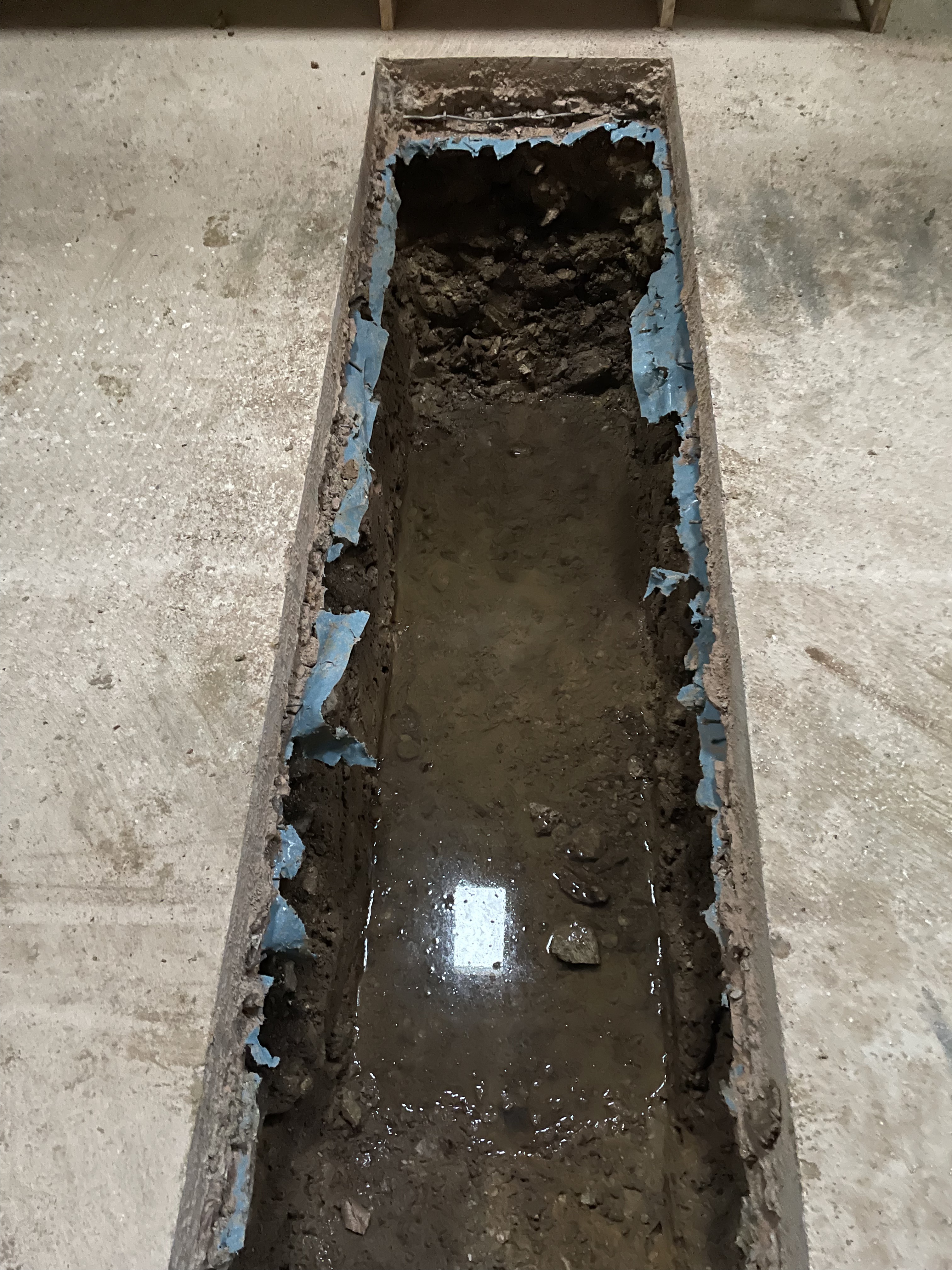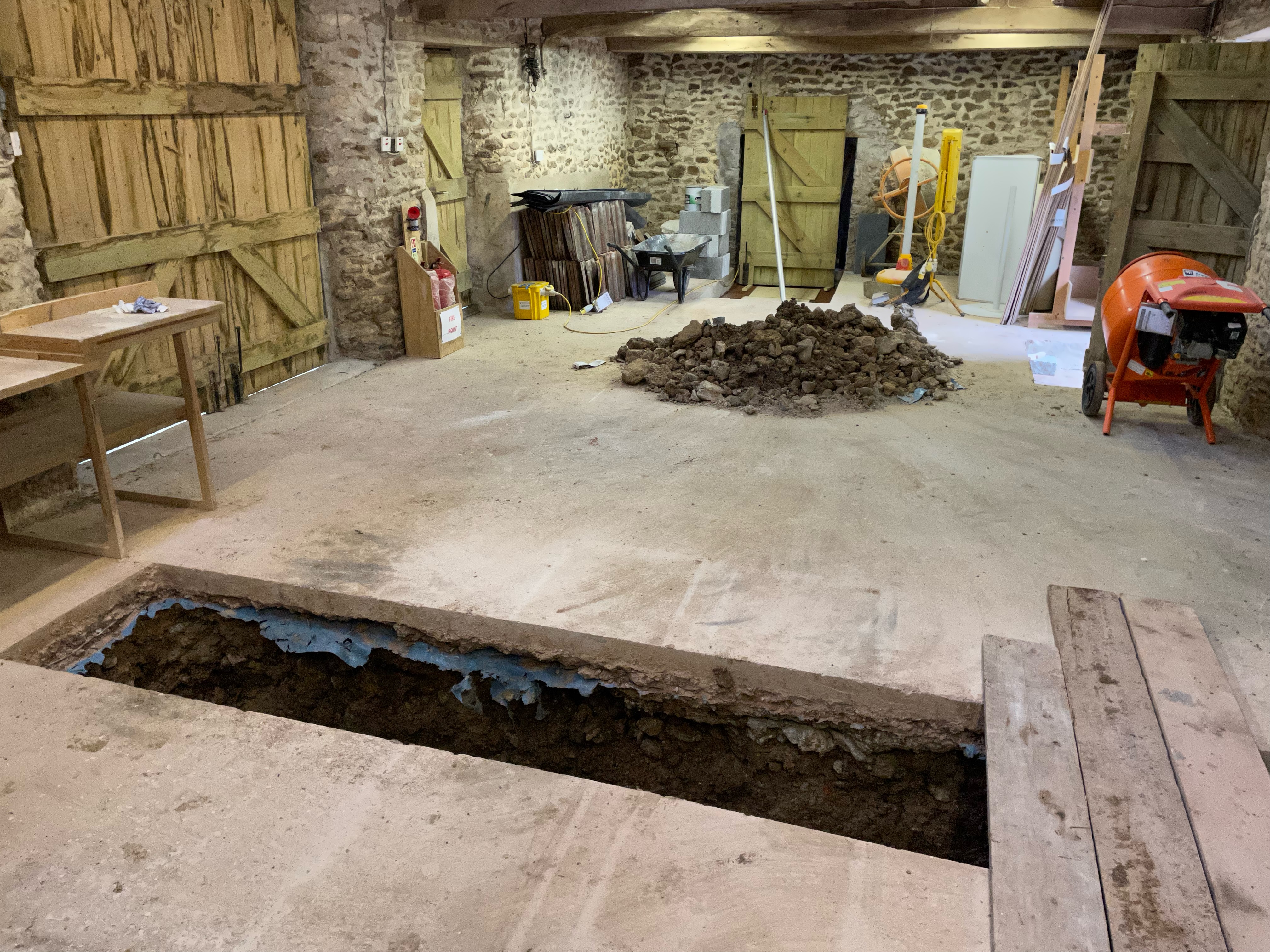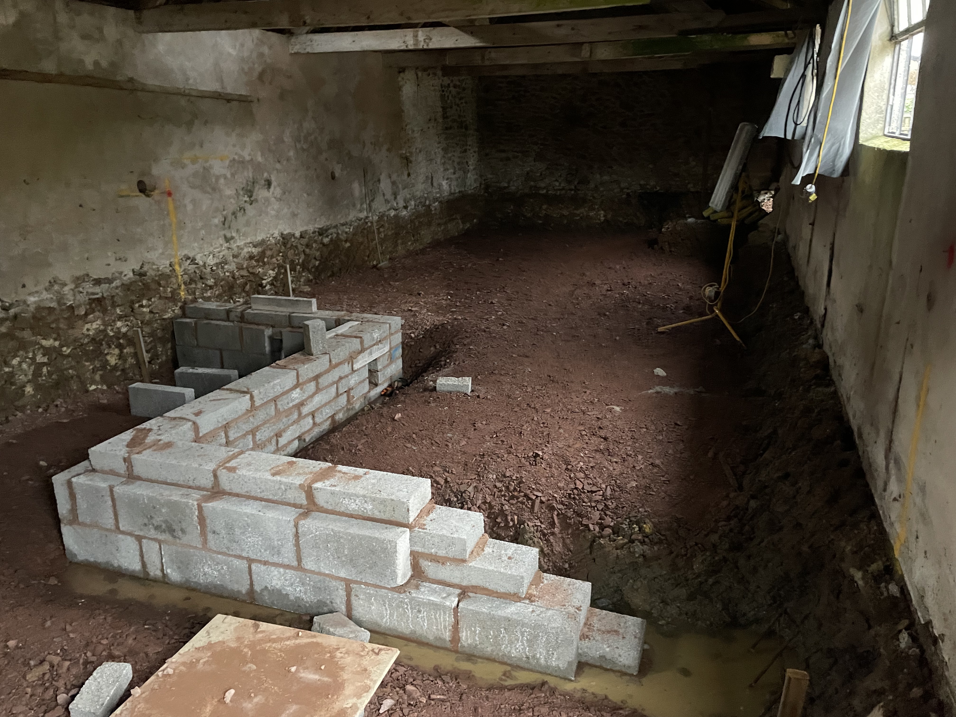 Inside, the builders have started building the party wall in the shippon between our new home and the one-bed cottage at the end. You can see the footprint of the one-bed cottage now – it feels a bit small but hopefully looks are deceptive, and we can turn it into a nice, cosy property. They’ve also cut away part of the concrete floor in the bigger barn, ready to lay the foundations for the wall that’ll support the new floor we’re putting in. It’s already filling up with groundwater a bit, but we don’t know yet whether that means more tanking or not.