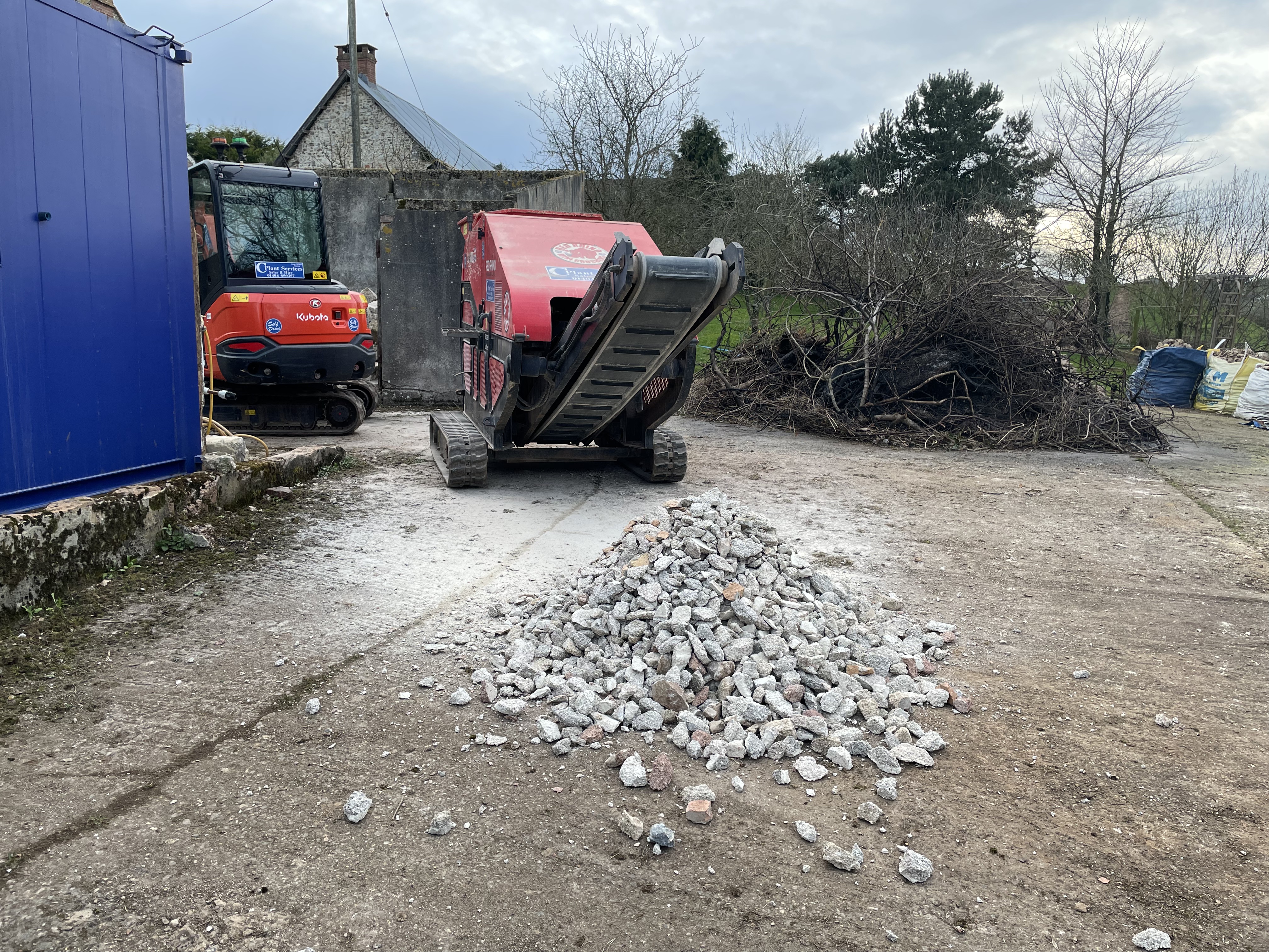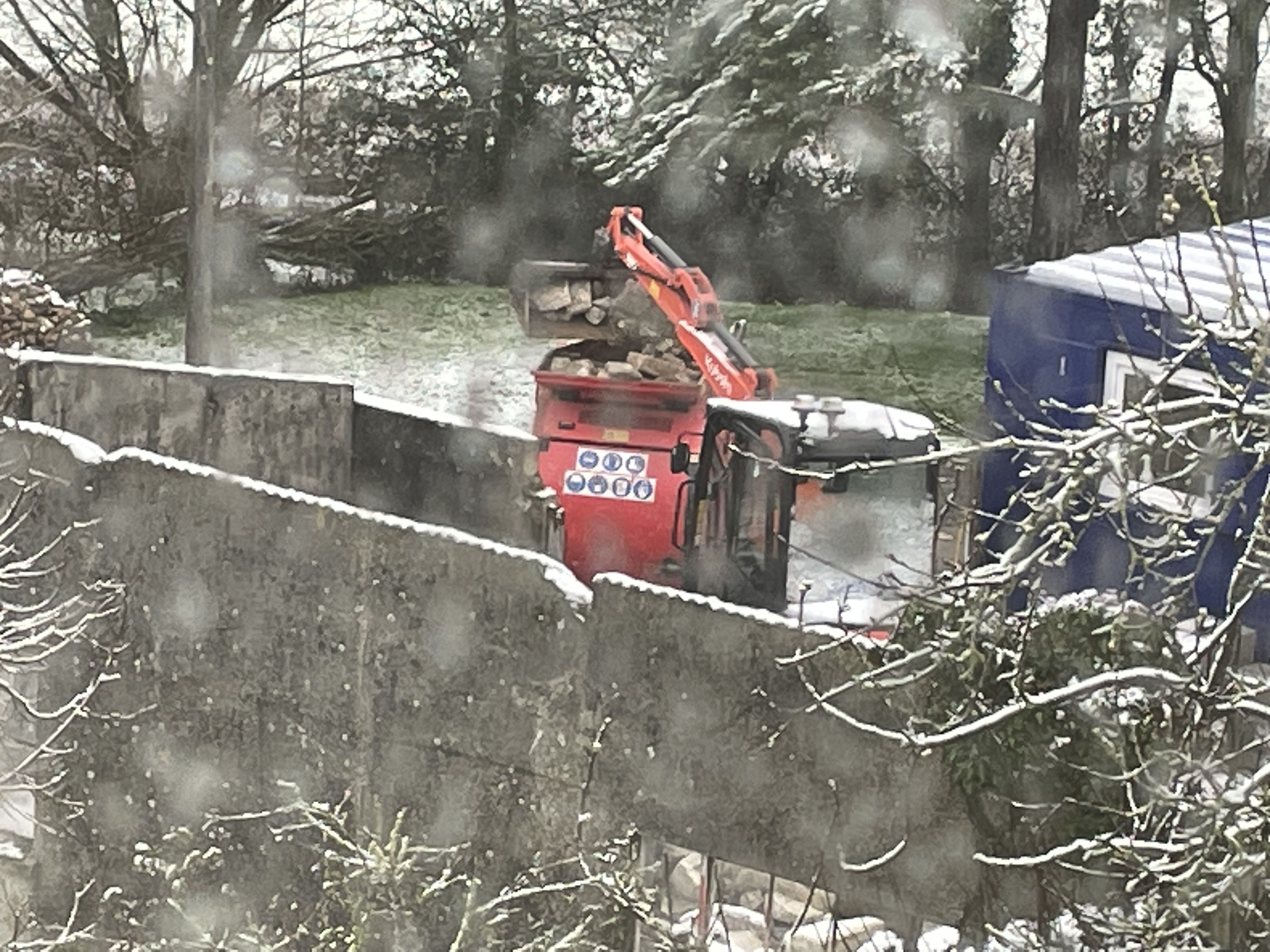 It feels like it’s been particularly busy this week. The building work seems to be progressing well despite the weather – our builders had ordered a crushing machine for a day this week to break down the concrete rubble and make it more usable. Typically, it turned out to be the coldest and most miserable day, with snow and rain almost the entire time – not a fun day to be outside crushing concrete! We’re amazed by how our builder carried on regardless and managed to get rid of at least two-thirds of the material – very impressive. He also started demolishing the old derelict barn at the same time – slowly but surely it’s coming down!