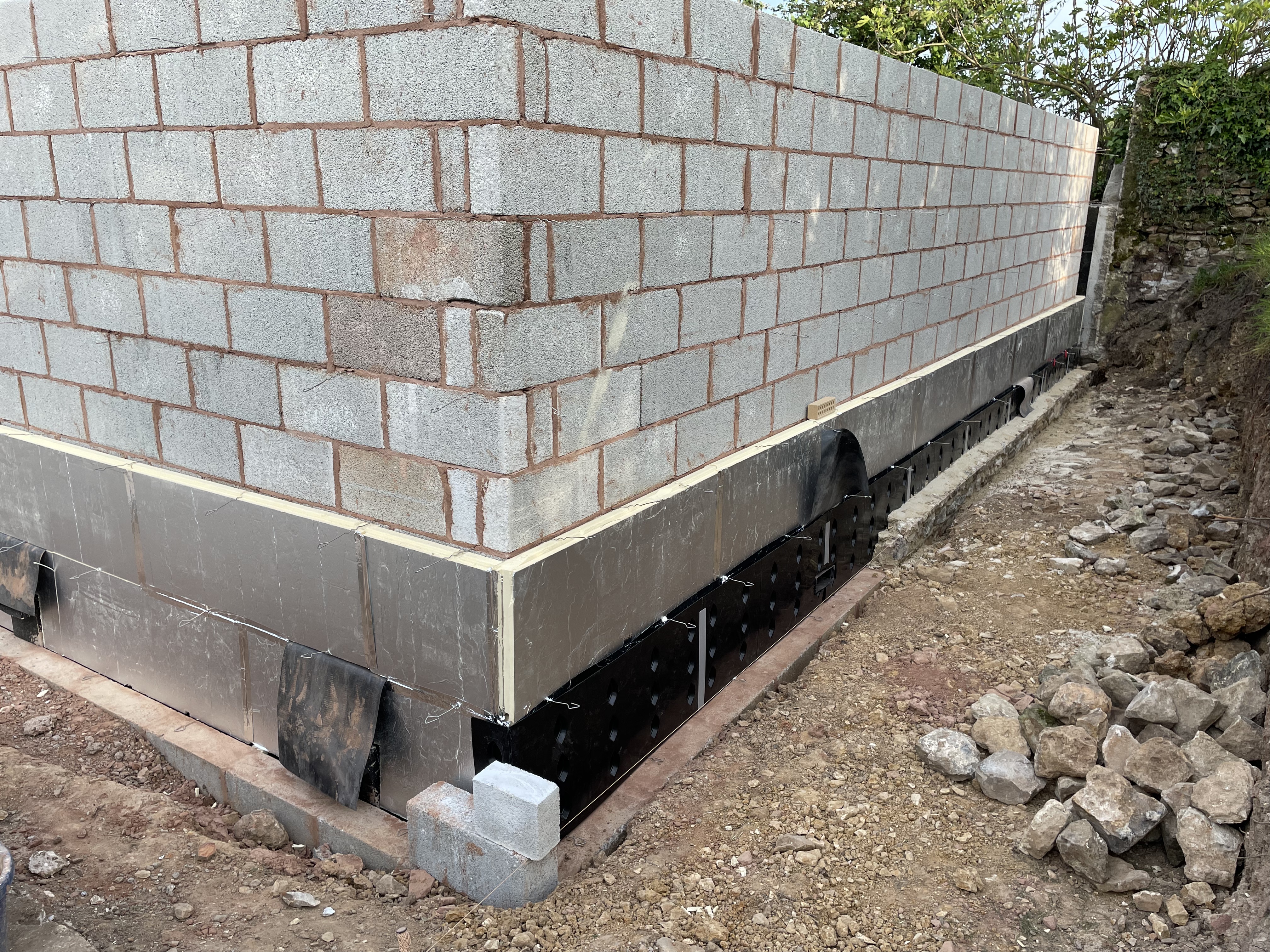 Another week of sunshine, and another good week of progress from our builders. The walls of our derelict barn (soon to be our garage / laundry / communal area) are coming along nicely – as they’re building up the breeze block inner walls, our builders are also adding the insulation and plastic cladding, and our stonemason has started on the outer stone wall. It’s getting easier to visualise what the building is going to look like – although it still feels like there’s a long way to go. We’re starting to worry about how many stones we’ll need though – we did hope our two large piles salvaged from the site would be sufficient and we’d get away without buying any, but already that’s looking doubtful. You can get specially-cut corner stones – ‘quoins’ – which we’re going to need to buy, and possibly a bag of normal wall stones too. The costs just keep adding up!