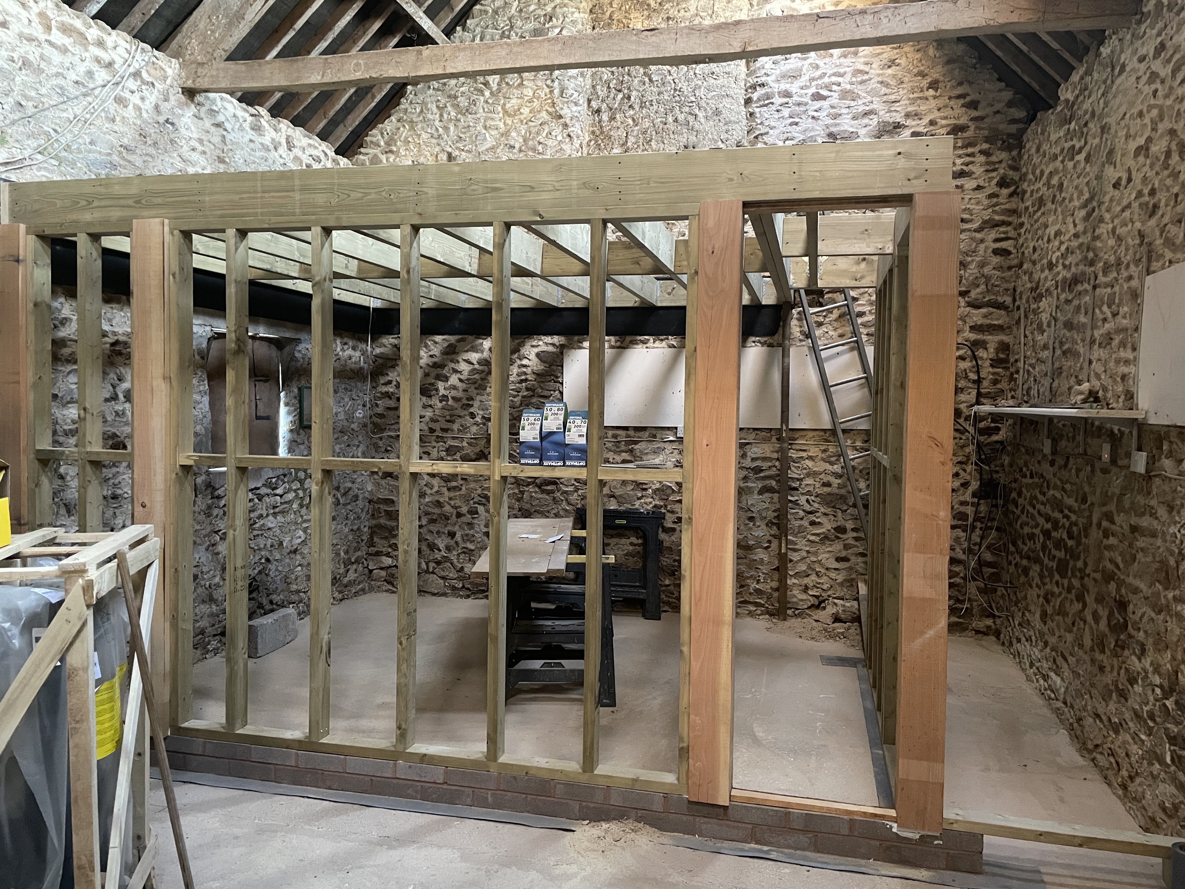 We’d seen an extra car on site this week but hadn’t appreciated what who that was until we went into our two-storey barn to move a workbench we’d inherited and wanted to keep, and found the shell of our downstairs bedroom and bathroom already in place. Our carpenter has certainly been working quickly! The space is feeling quite small suddenly – we’re hoping that’s just because we’re used to the bigger space, and because there’s no natural light in the building. Once the big barn doors are changed for glass, it should make quite a difference – and once the room’s been plastered and painted a lighter colour. We’re still a long way away from that though.