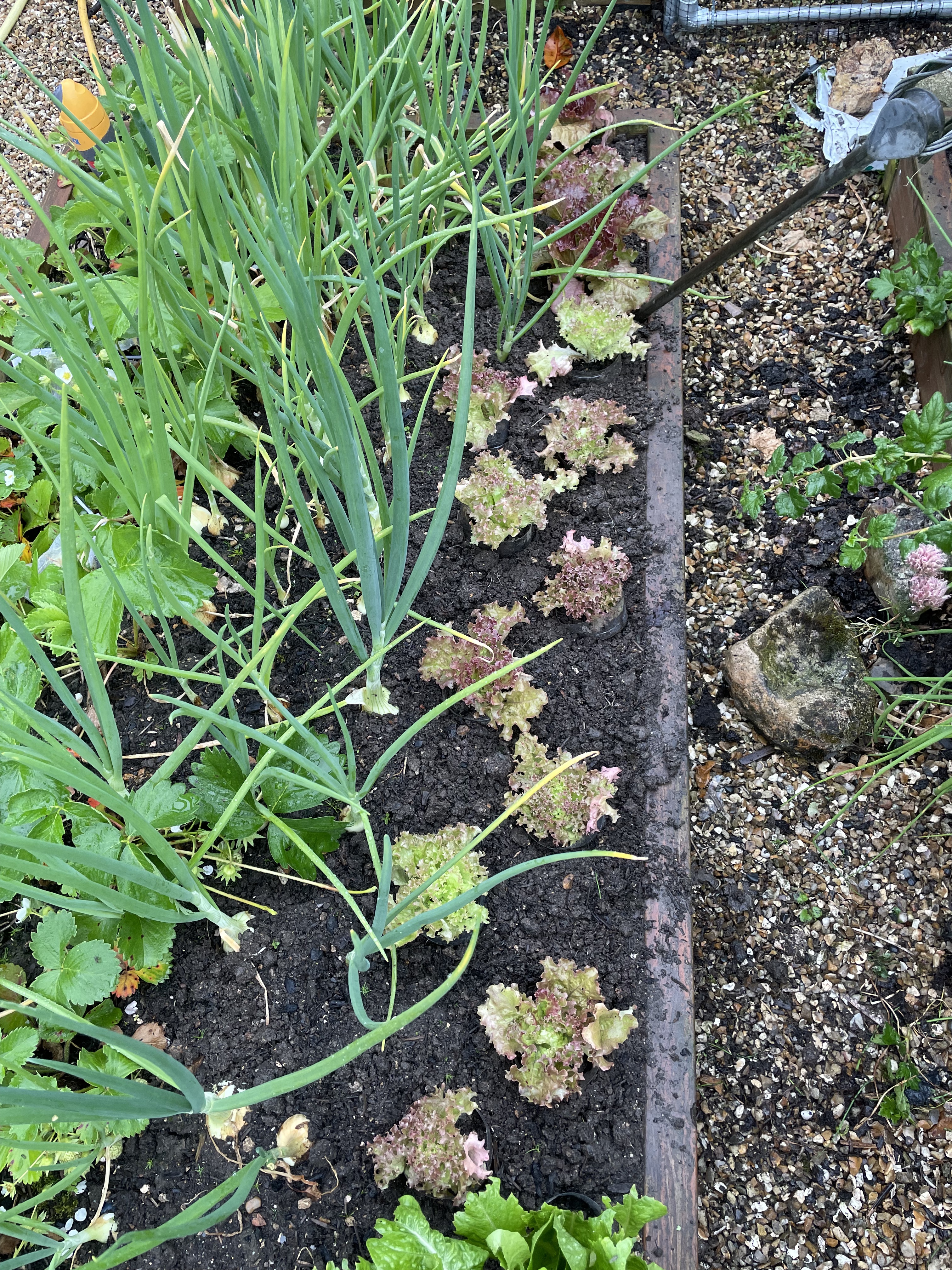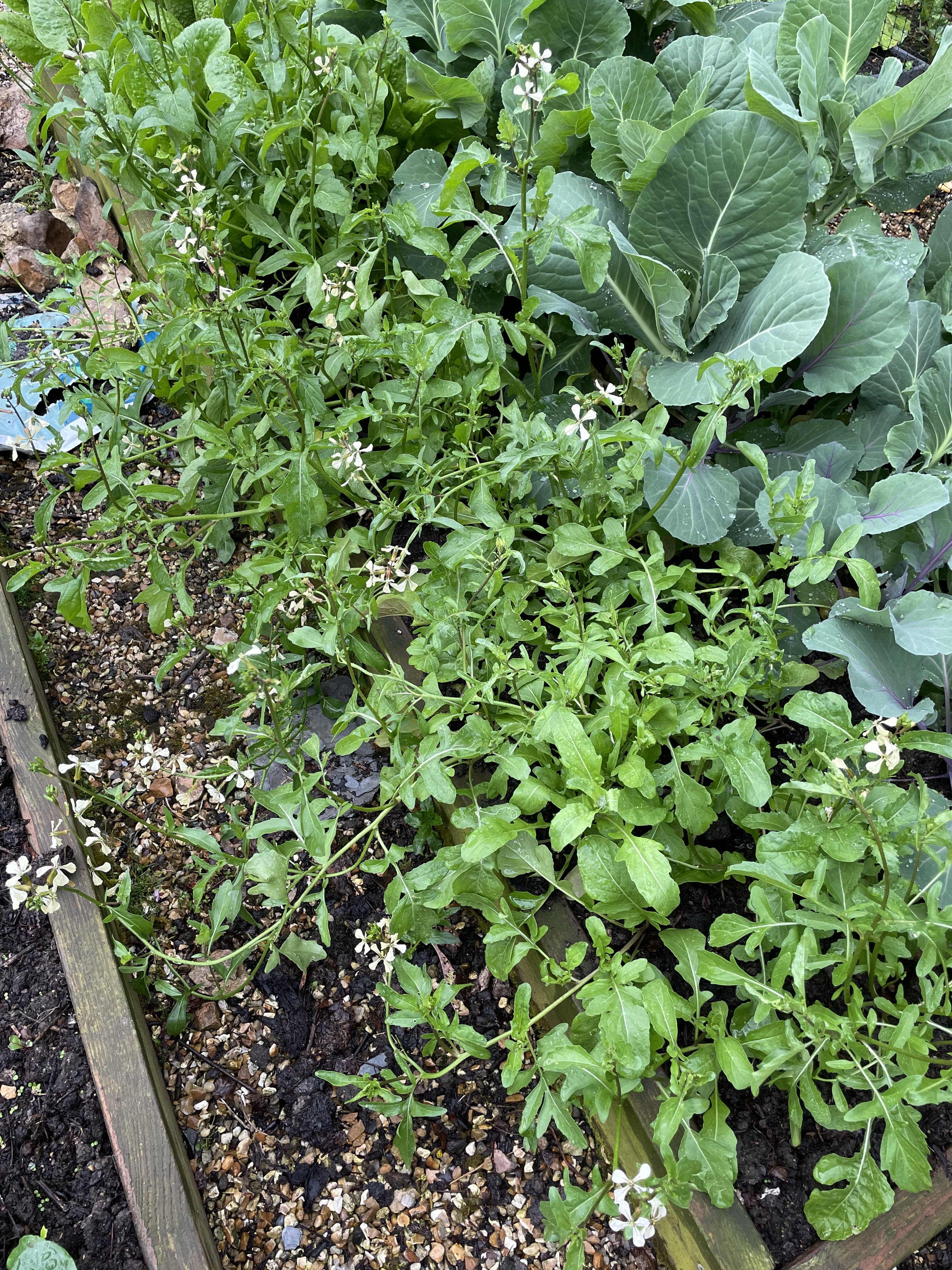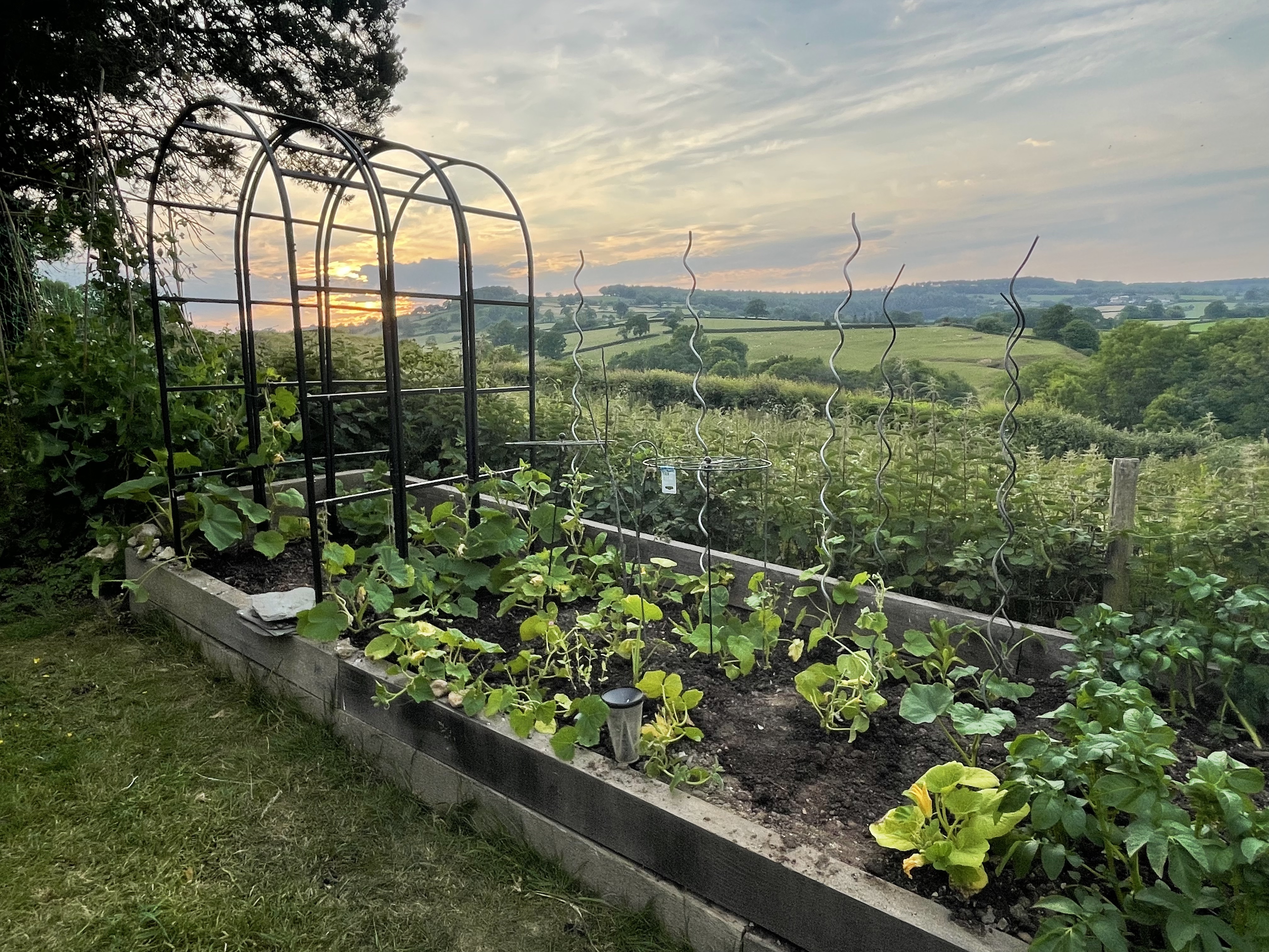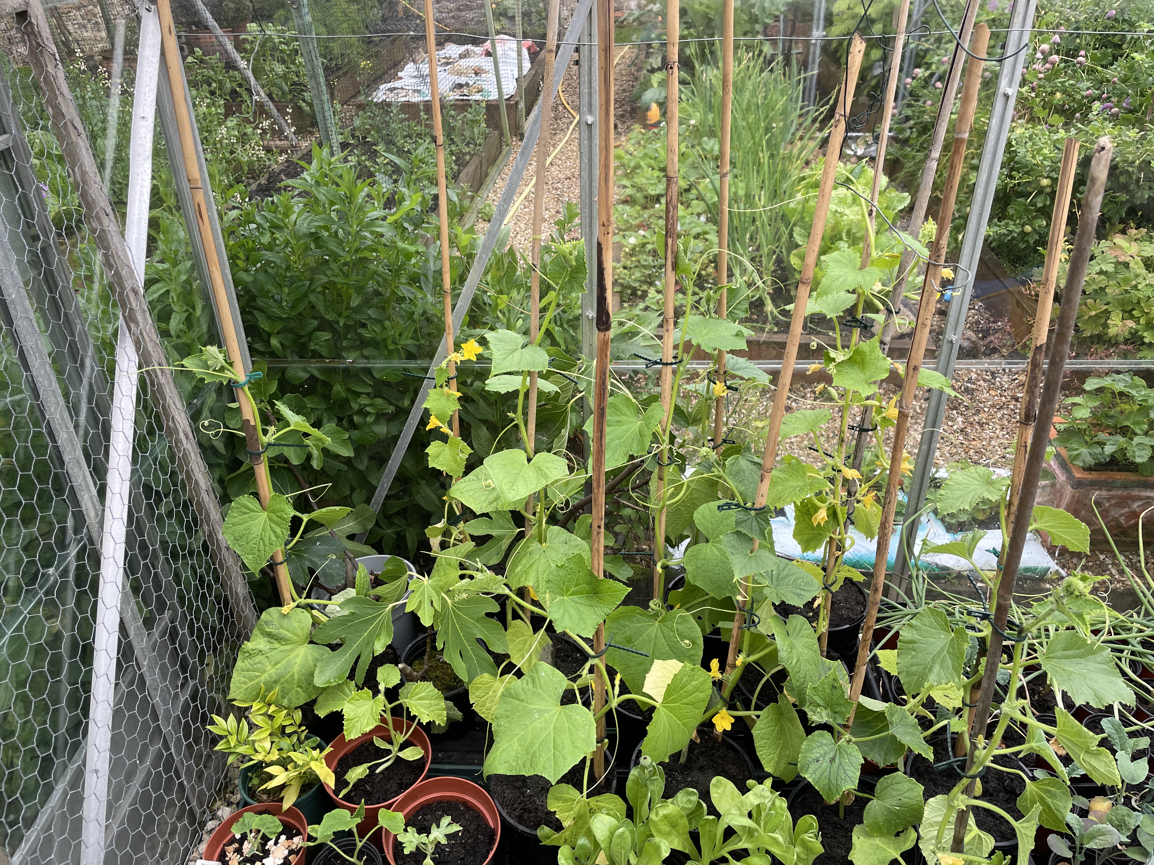 Other jobs we managed to do were to sweep the back terrace – it sounds a small job but as it’s next to the bird feeders, it invariably ends up strewn with dropped nest-building material – as well as filling with gravel from the paths when it gets stuck on your boots (I can’t wait to get rid of it all, but that’s a huge job in itself). And we planted out various vegetables and flowers to make space in the greenhouse – including caning the cucumbers and melons so they’re not causing havoc draping themselves across the greenhouse floor, and filling up our pumpkin/squash bed. There’s still a lot to do but it’s looking a bit more manageable – a few more days (or a lot of evenings!) and we should have caught up. Then we’ll move onto weeding and cutting back all the shrubs so the place is less like a jungle – the plants seem to have appreciated the hot weather and all the watering we’re doing! A lot of the leafy seedlings we planted have bolted in the heat, so we’ll replace them as soon as we can.