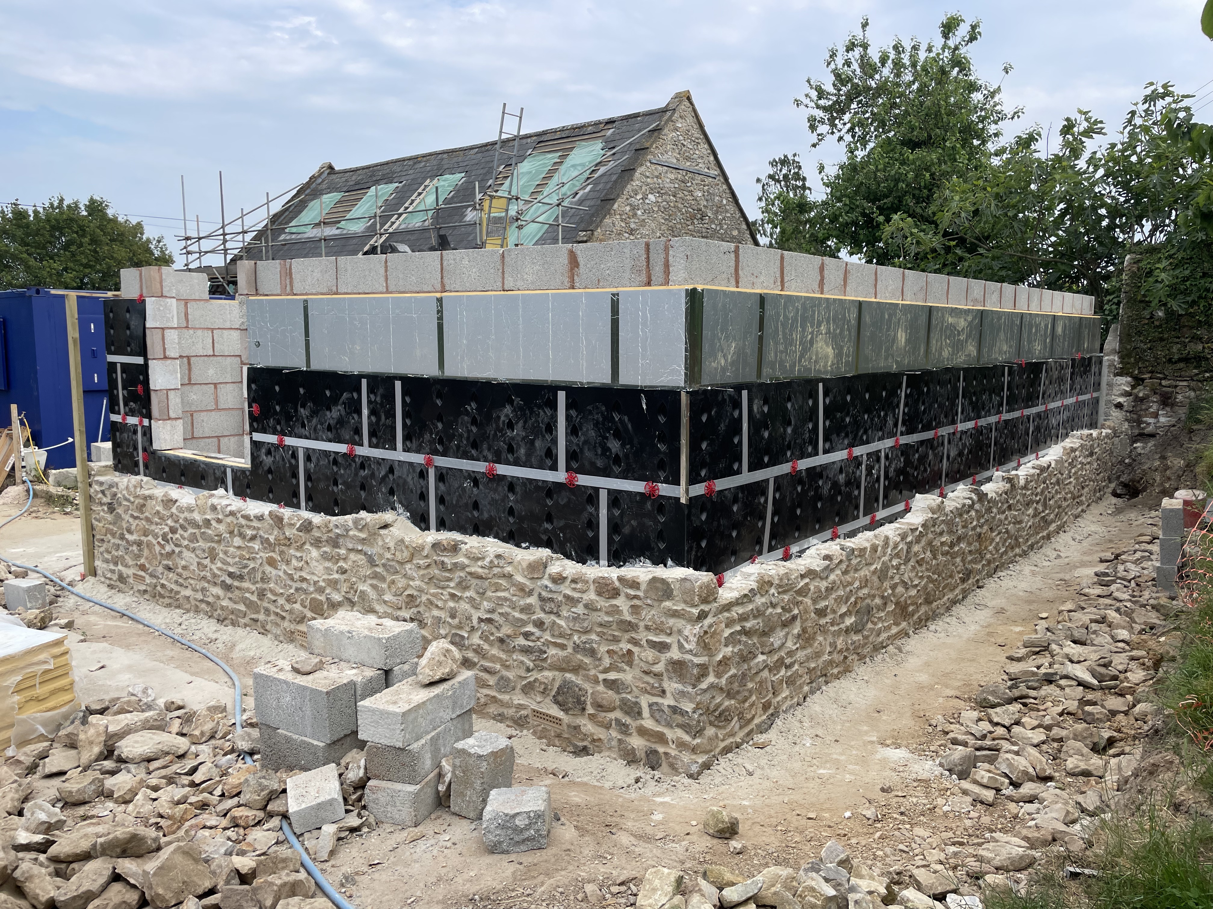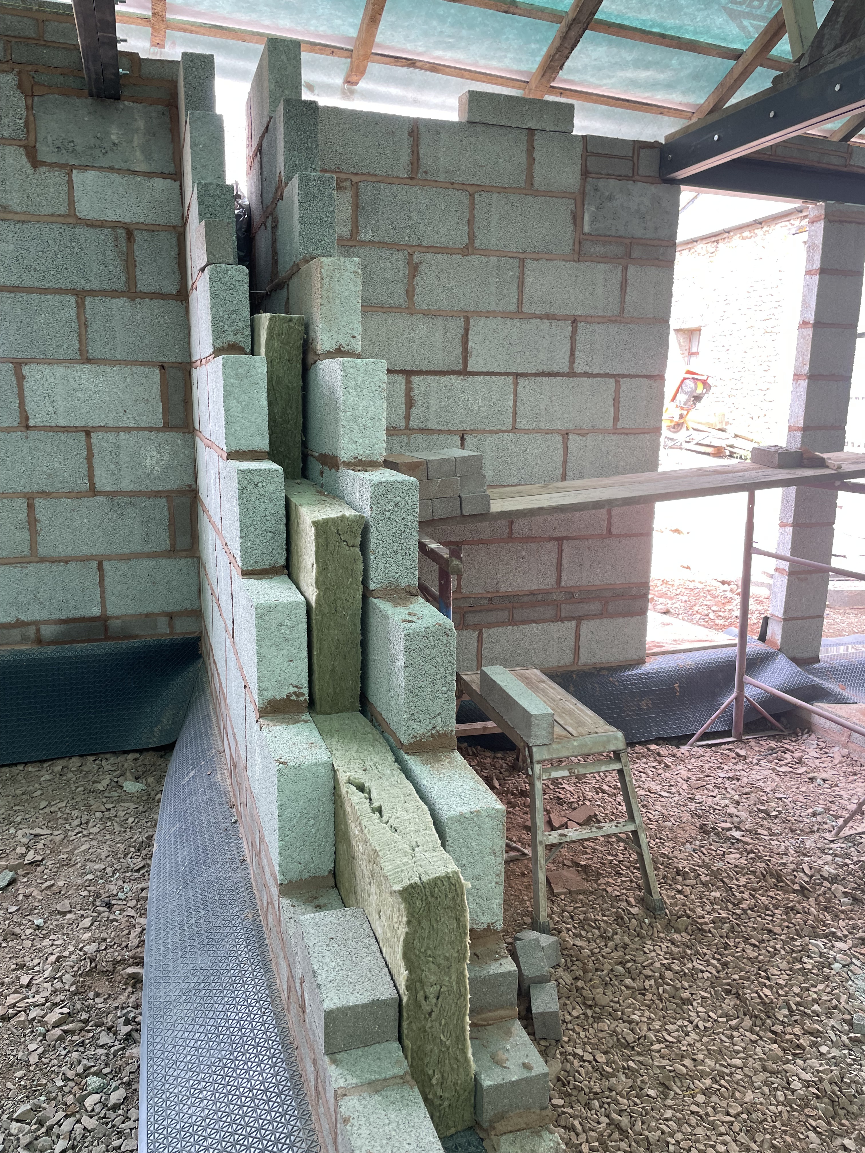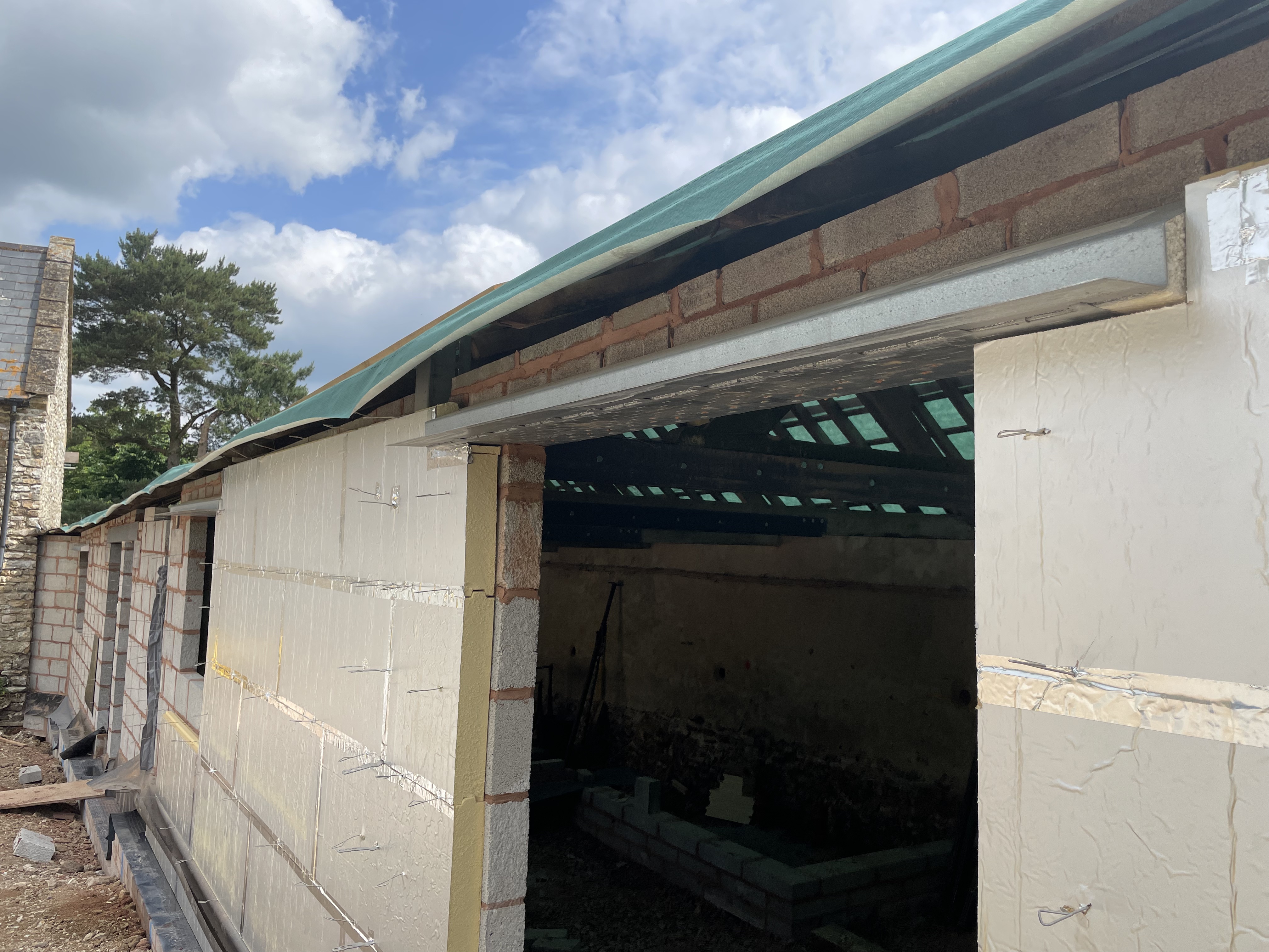 We also now have a wall along the whole of the shippon – not just the section that’s going to be the one-bed cottage. Our builders have put in the steel lintels above the windows and doors so that the building is now structurally able to stand without the internal acrow props. With the insulation starting to go on too, it looks like a real building again! Our stonemason has been incredibly busy building up the walls of our garage ancillary building too – his work is genuinely incredible. We’re starting to run out of stones already though, which is so frustrating as we have plenty of stones we didn’t get time to dig out from the footprints of the old barns, one of which is now under the builders’ cabin. We’re doing whatever we can to save money so having to buy something we have but can’t access is a little galling.