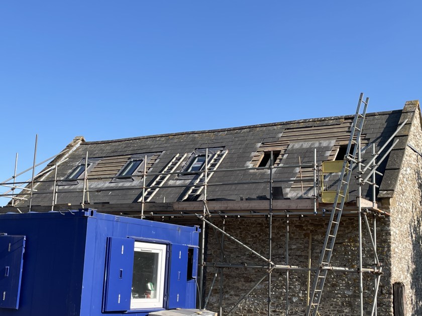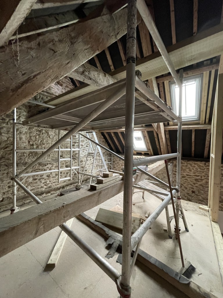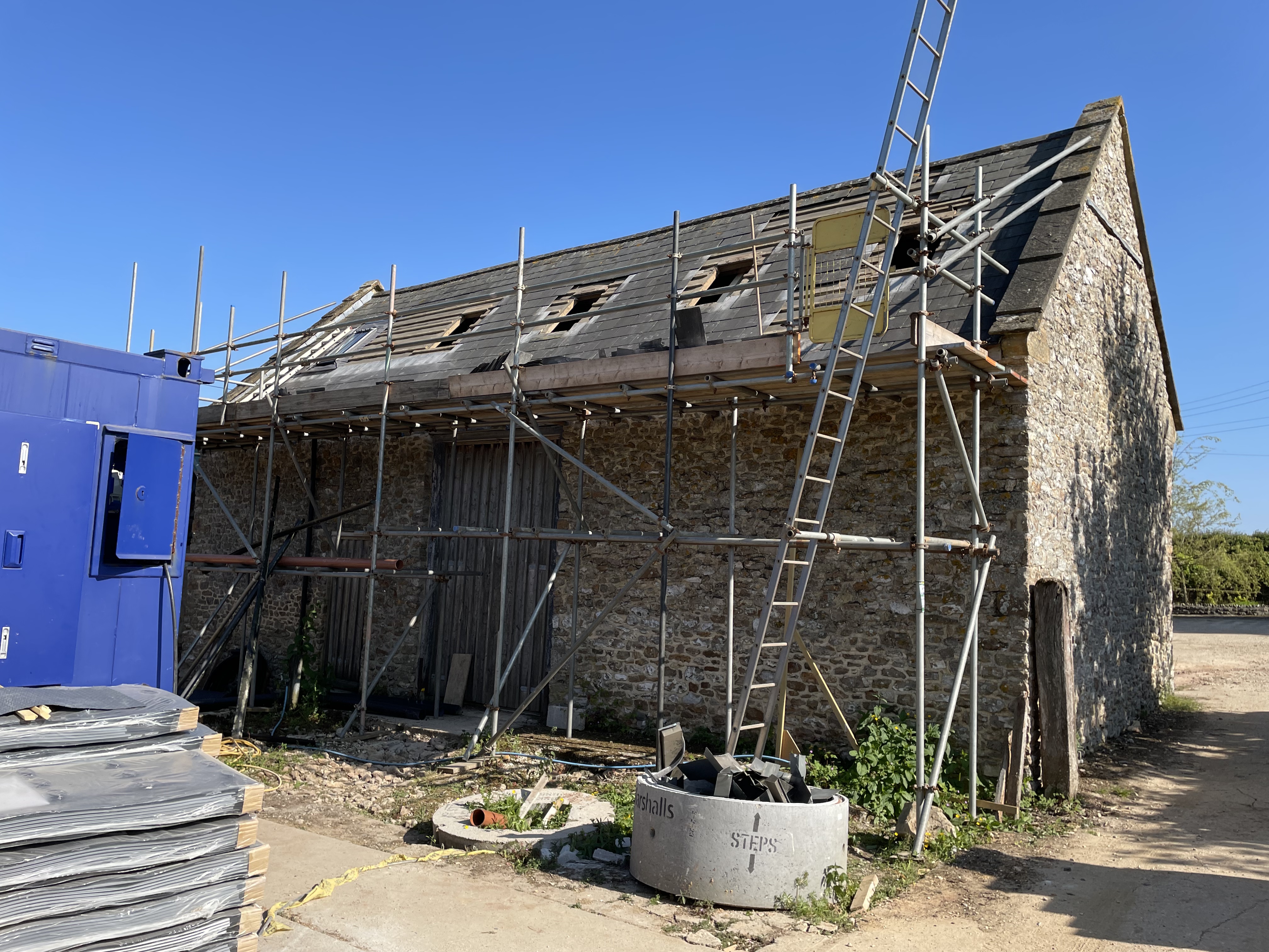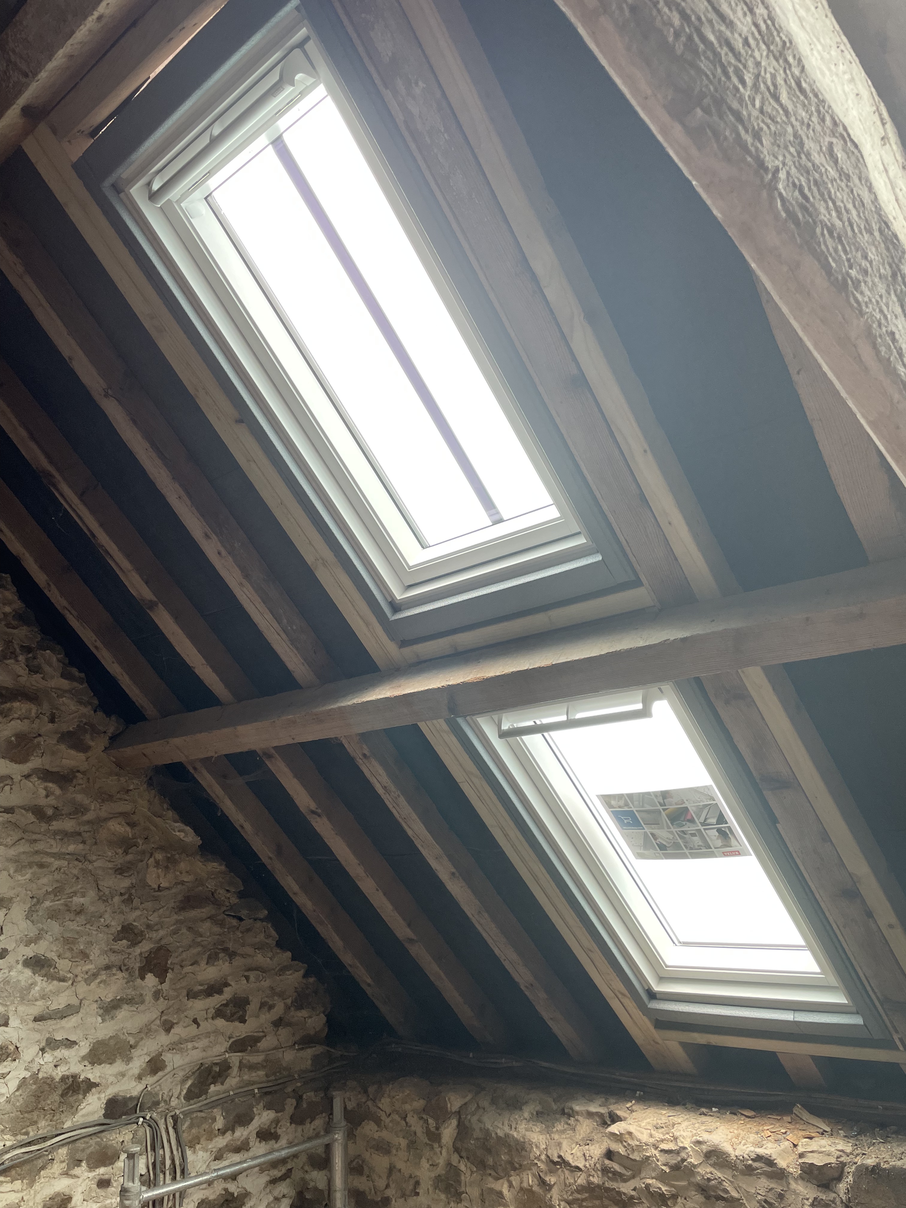 Our builders have been loving the dry weather and have made huge progress this week. Last week they’d installed the first roof light in the three-bed barn – now all roof lights are installed and they just need to finish putting the tiles back. Our carpenter Dean has also been incredibly busy inside the barn – he’s installed the first floor above the new bedroom and bathroom so you can get a sense of how the building is going to look. It’s almost a shame that we’re going to finish that barn in a later phase, as it’s exciting seeing it progress so fast.