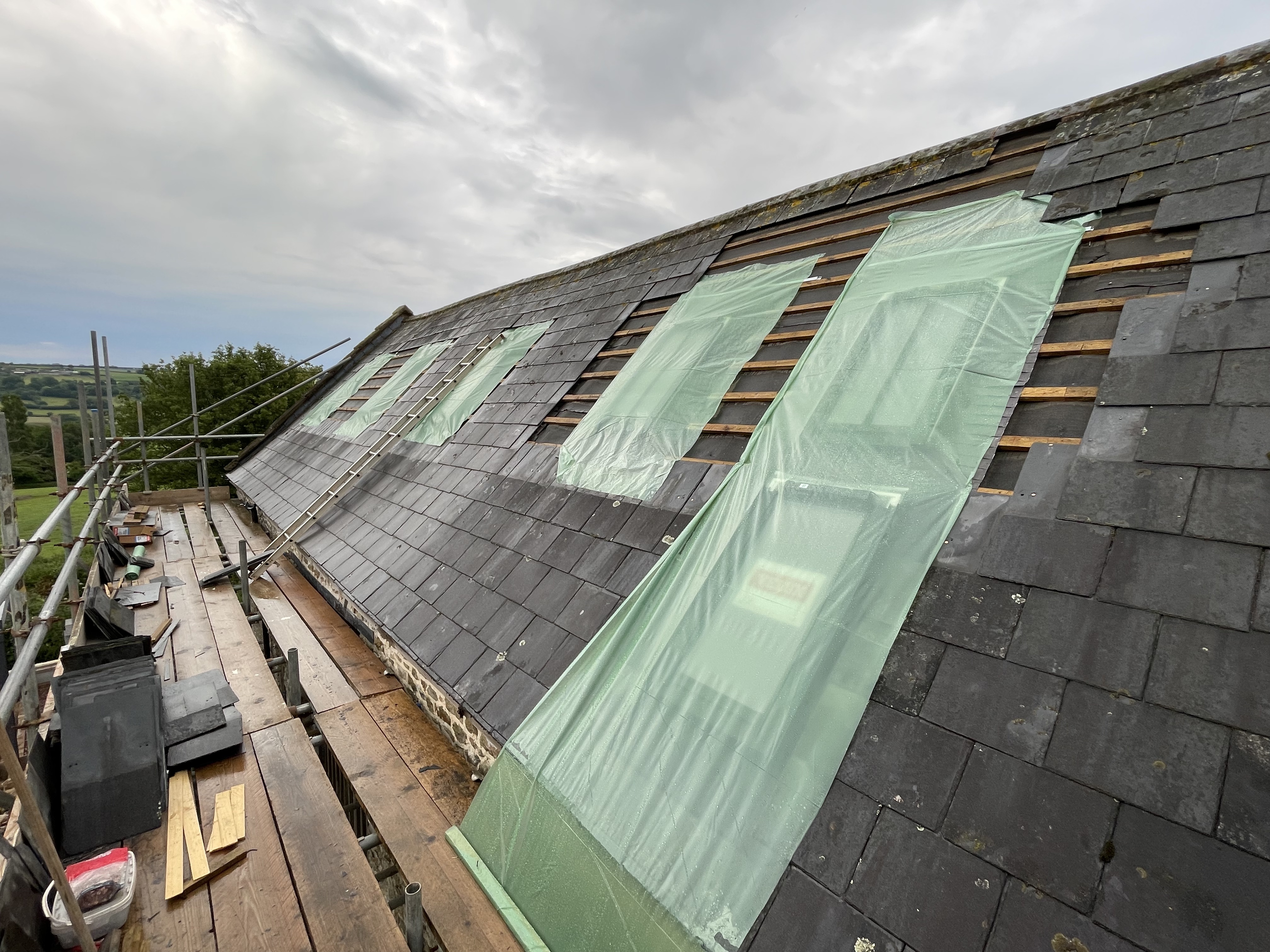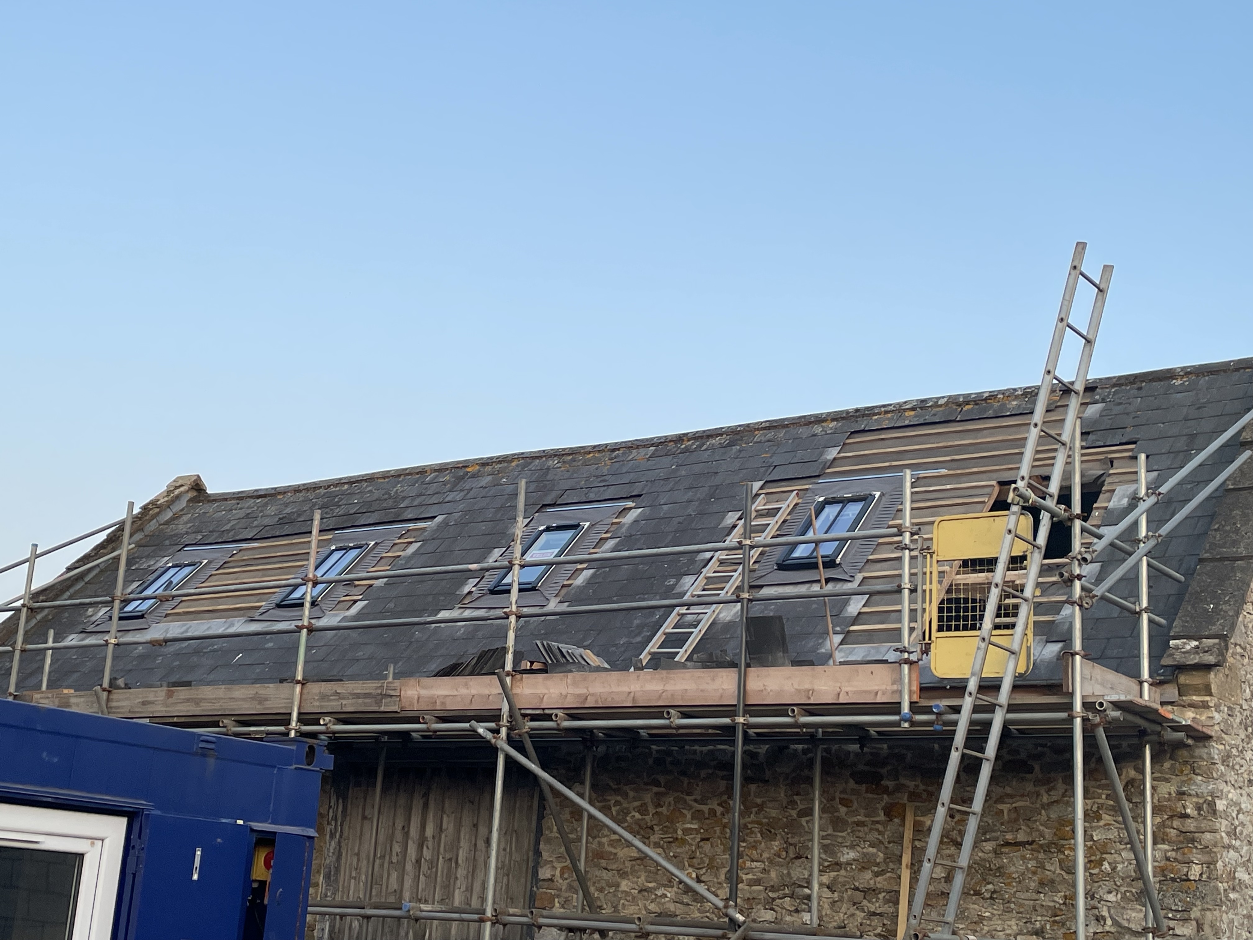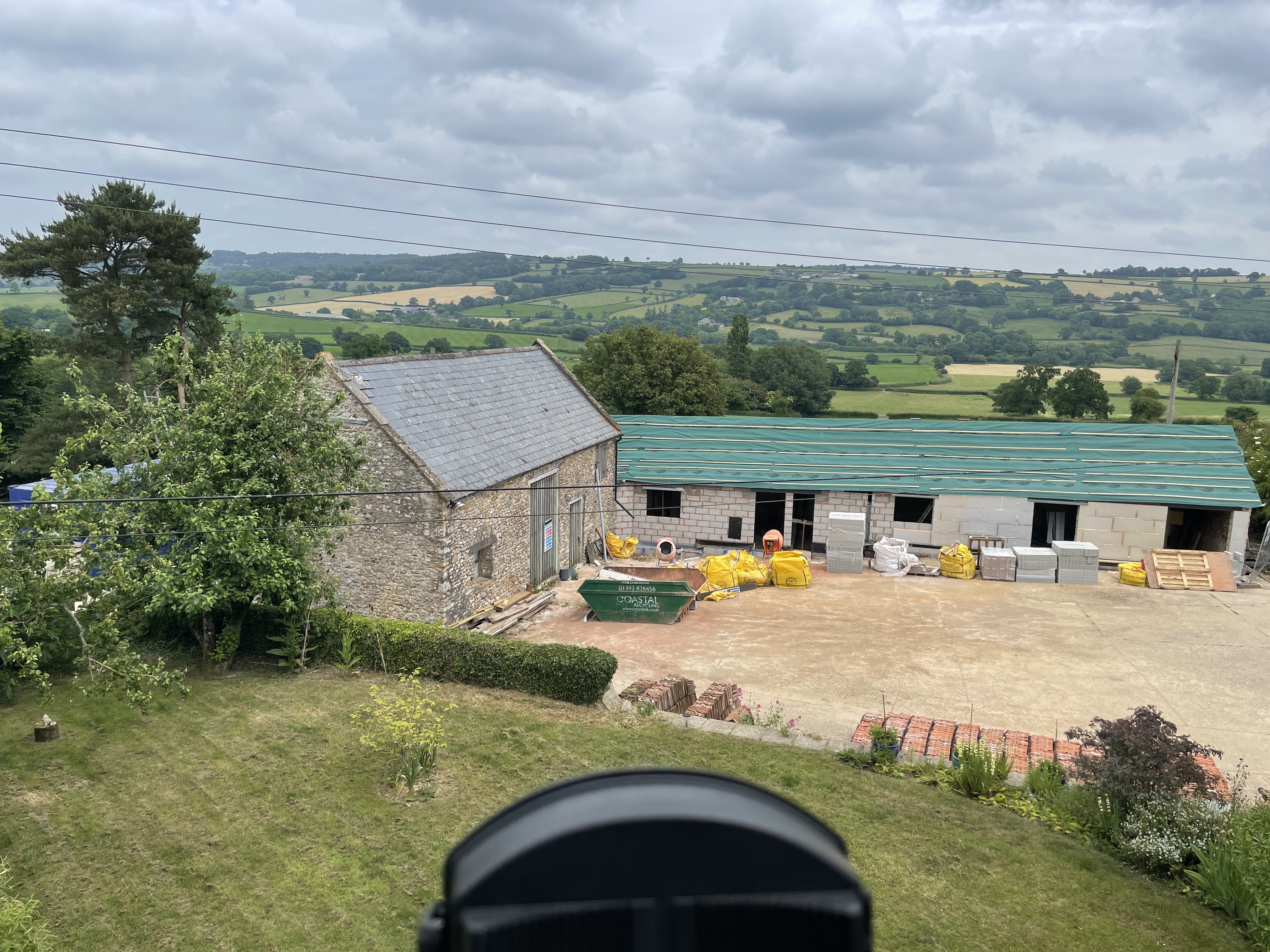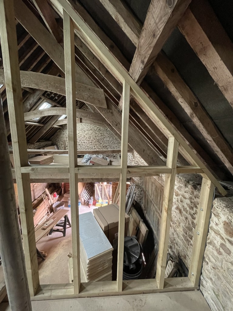 Our builders have been loving the dry weather and have made huge progress this week. Last week they’d installed the first roof light in the three-bed barn – now all roof lights are installed and they just need to finish putting the tiles back. Our carpenter Dean has also been incredibly busy inside the barn – he’s installed the first floor above the new bedroom and bathroom so you can get a sense of how the building is going to look. It’s almost a shame that we’re going to finish that barn in a later phase, as it’s exciting seeing it progress so fast.