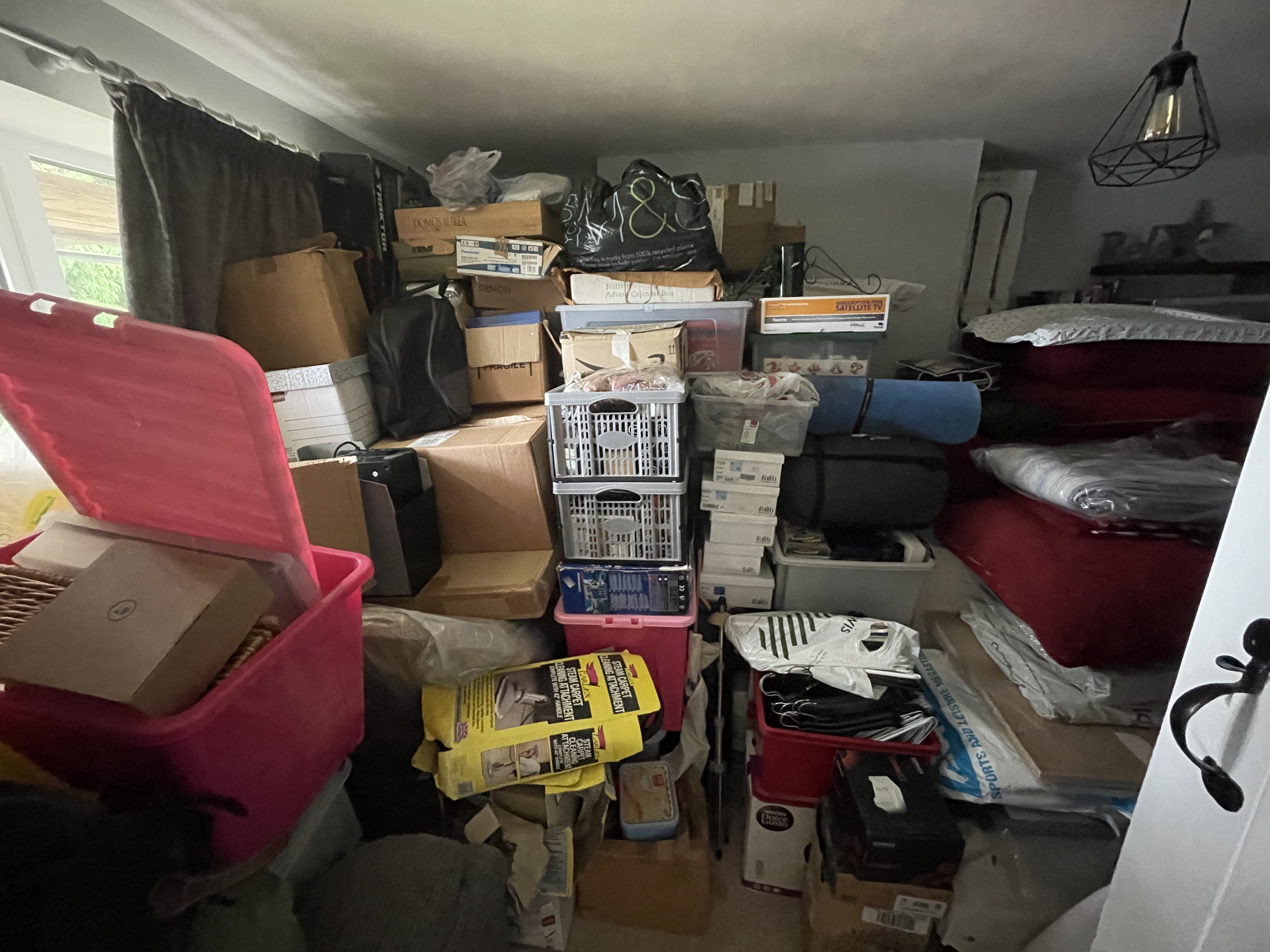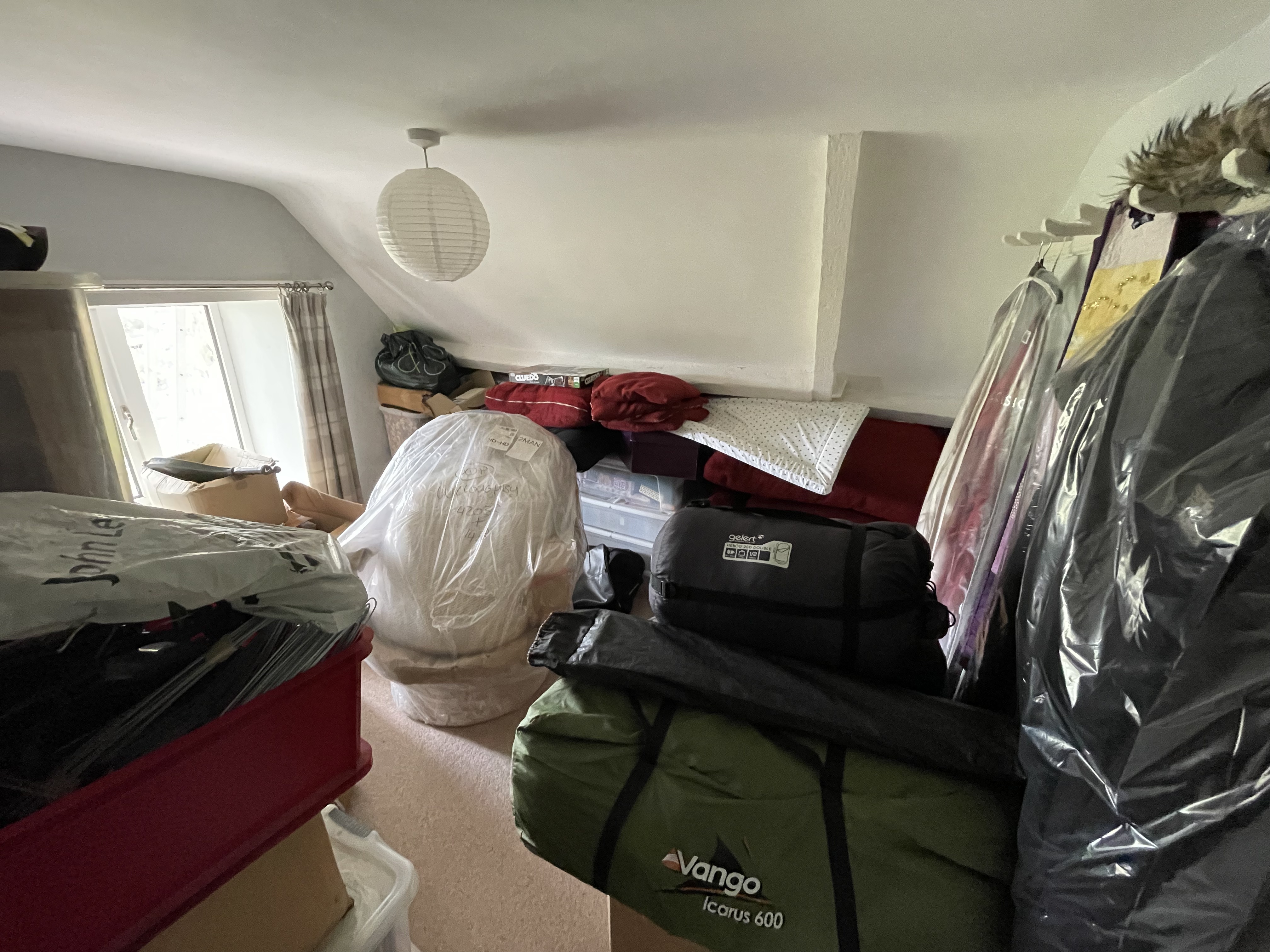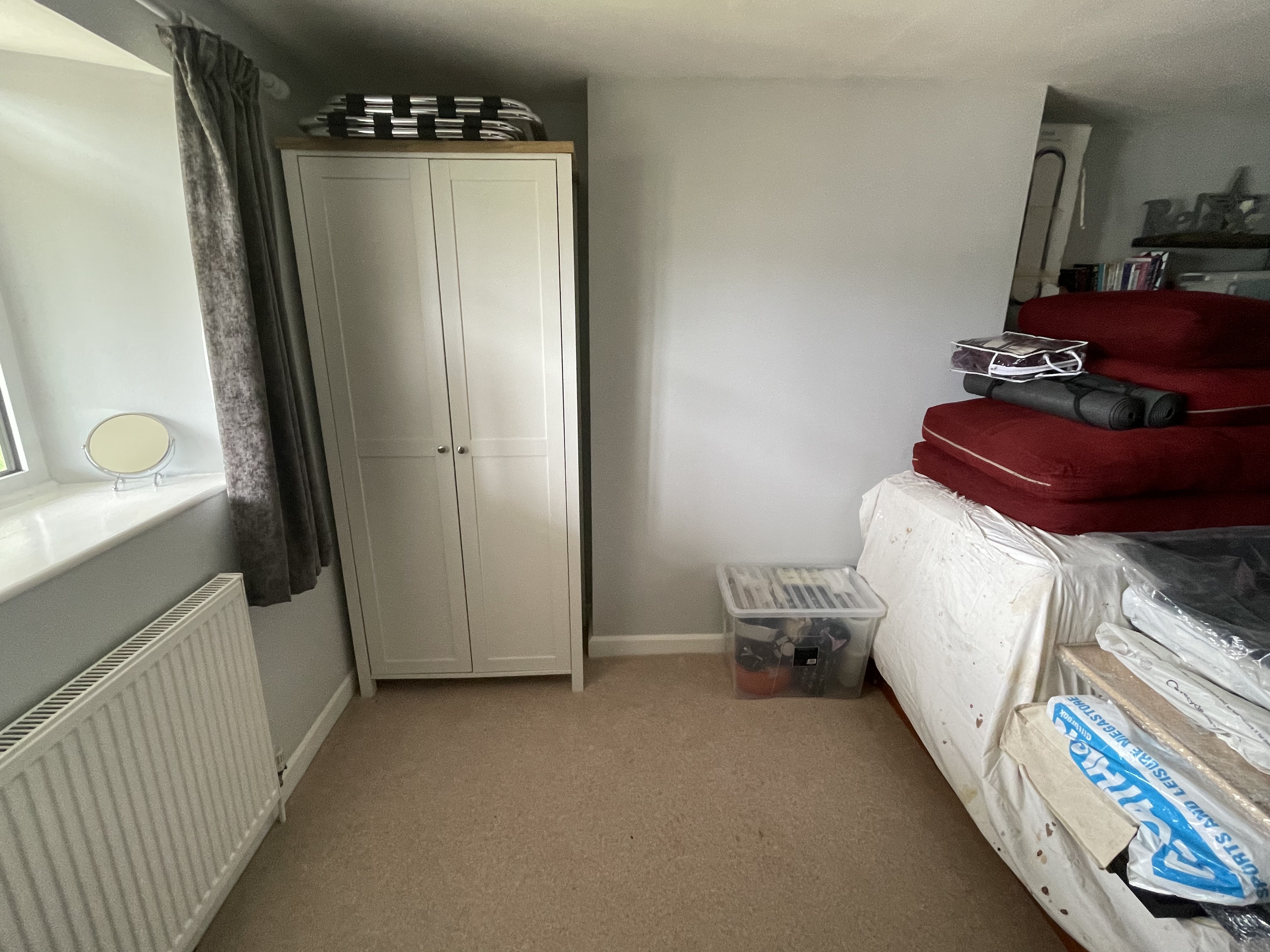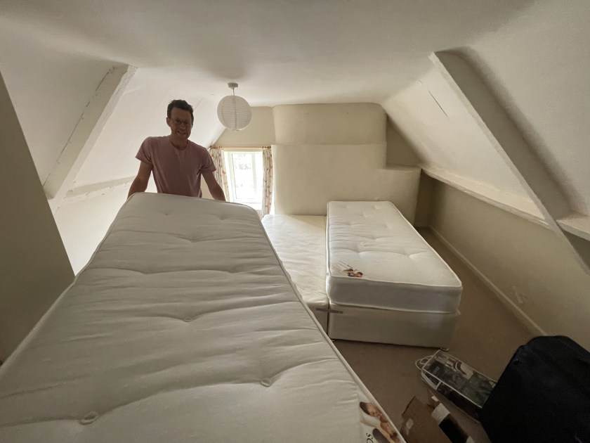 As our attic is pretty much inaccessible, we’ve been storing our ‘less-used items’ firstly in the barn, and then (before build began) on the top floor of the farmhouse – as well as using one of the rooms as a spare room. Our builders are getting ready to start work on the top floor in the next week or so, so we needed to clear it all out for them. We waited until this weekend’s visitors had gone, and then spent several hours moving beds and boxes (and repacking some boxes more efficiently) down into our first floor spare room. Over the last four years we’ve been collecting cottage-related items kindly donated by family and friends so we’ve acquired quite a number of boxes!! At least we don’t have any more visitors until mid-July now so we have some time to get the top floor done – and even then we’ve managed expectations so our next visitors know they might be sleeping on one of the sofas!