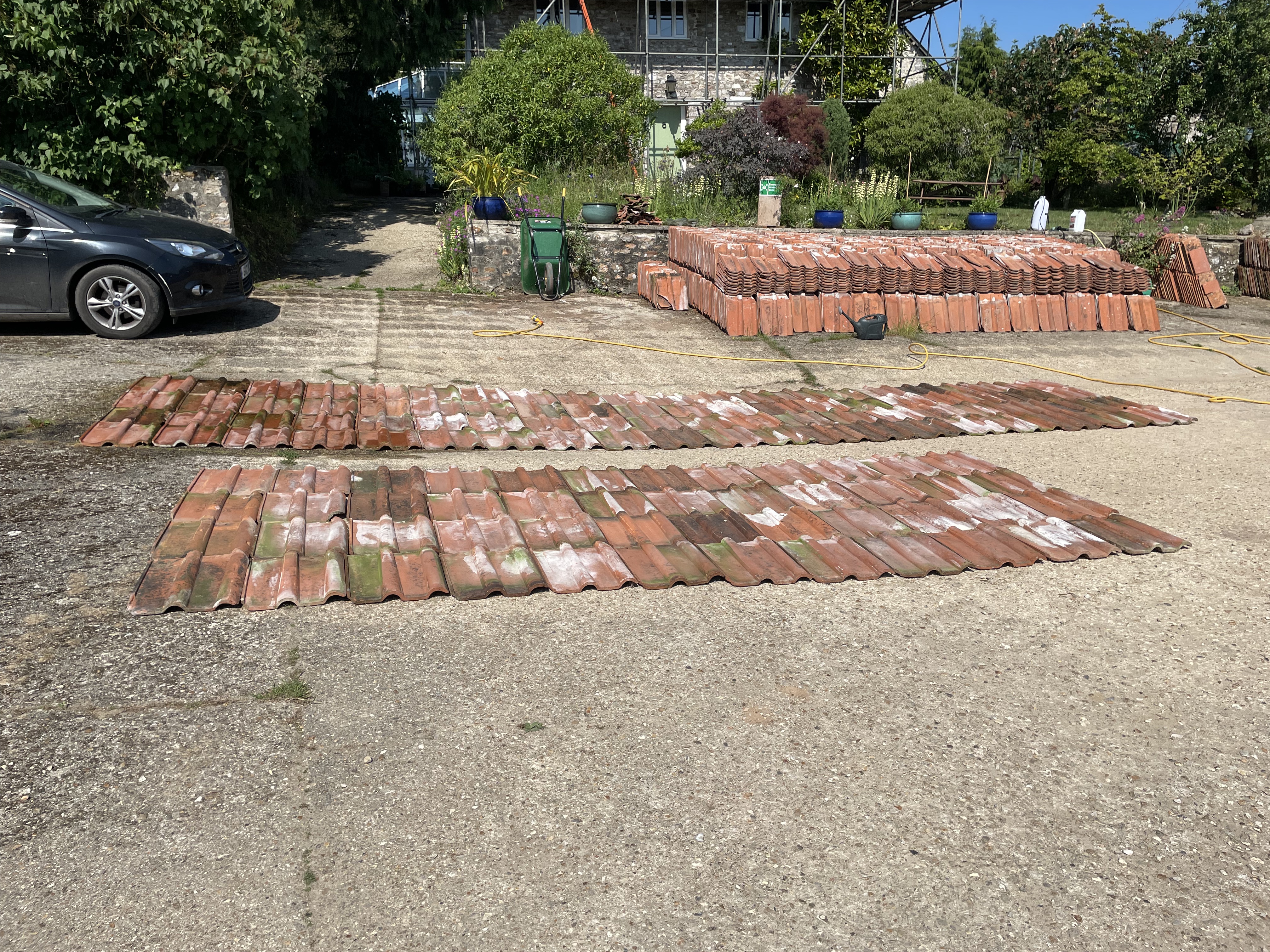 Last week our local farmer sold us about 350 roof tiles that matched ours – we need extra tiles for the shippon extension and were very lucky that they happened to have a stack that had been sat in one of their fields unused, and were kind enough to sell them to us. The tiles still need cleaning so John’s been back on them this week – not ideal in the sunshine (it burns off the cleaning fluid too quickly) but he’s managed to get through a third so far, with the remaining ones hopefully being finished next week.