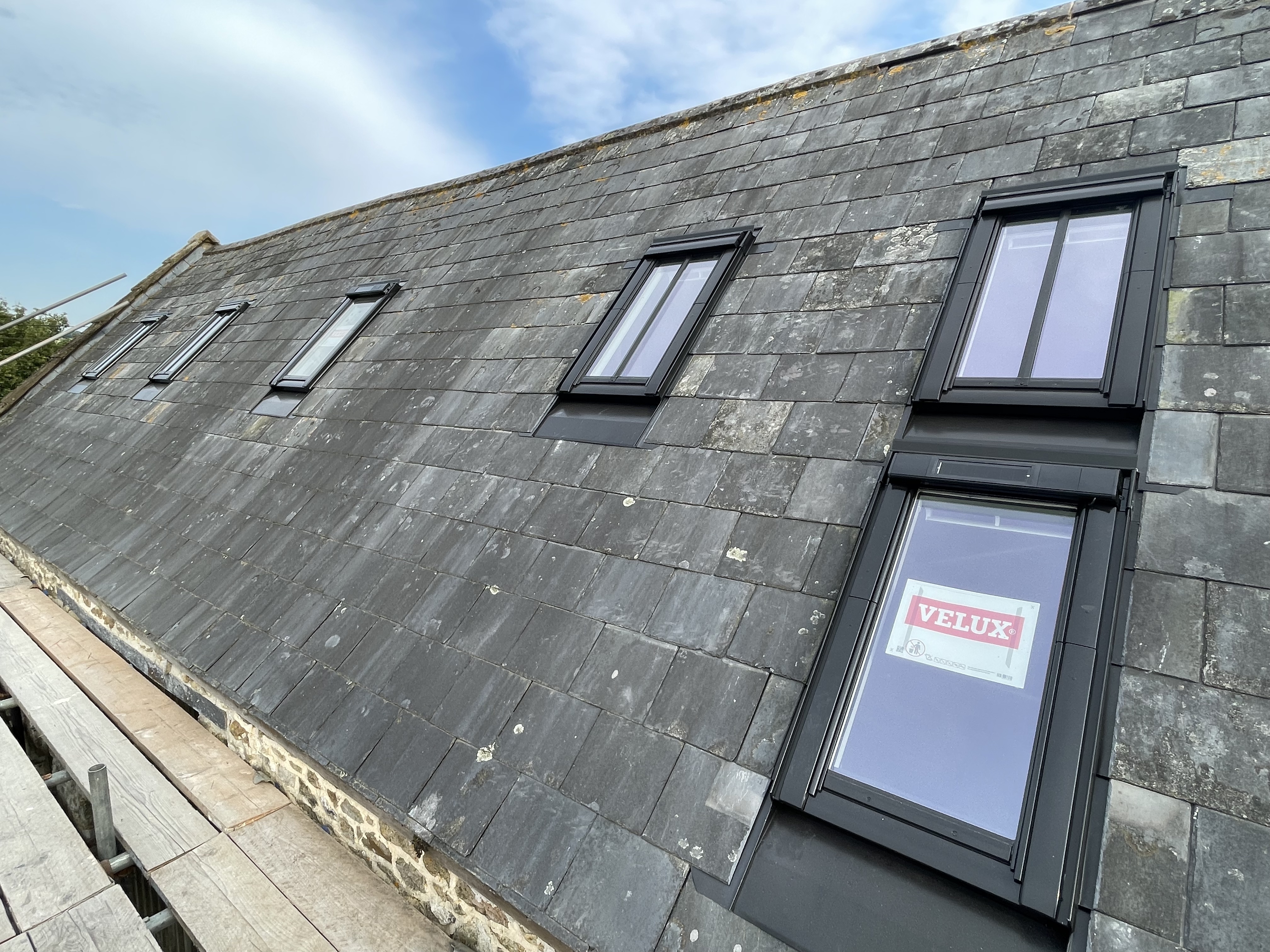 Having put the roof lights into the main barn last week, they’ve now finished tiling around them, making sure they’re watertight. Good timing given we had our first rain shower in weeks on Friday night, and are due rain again this week (keeping our fingers crossed for this, as the garden is parched and our well keeps drying up from our daily watering).