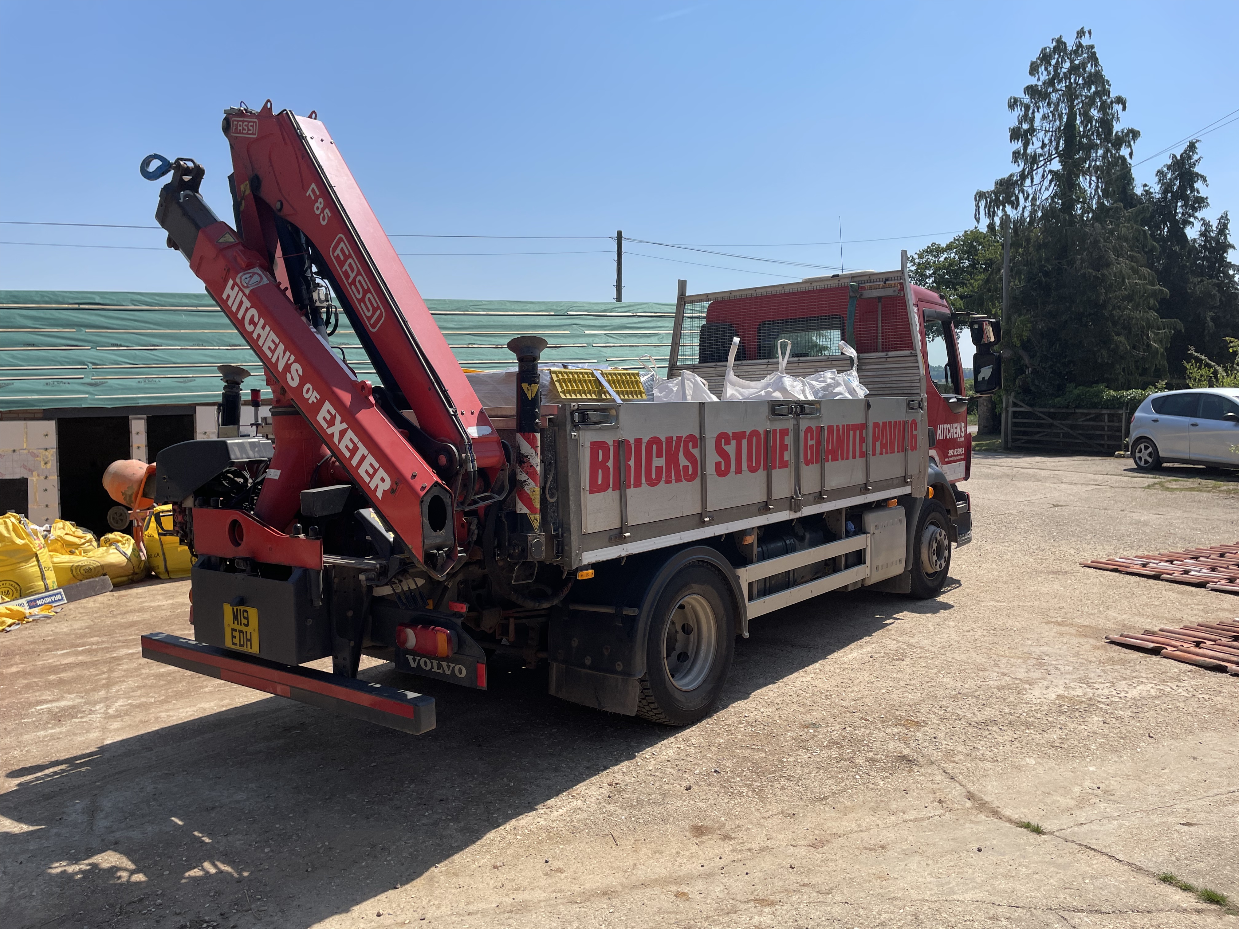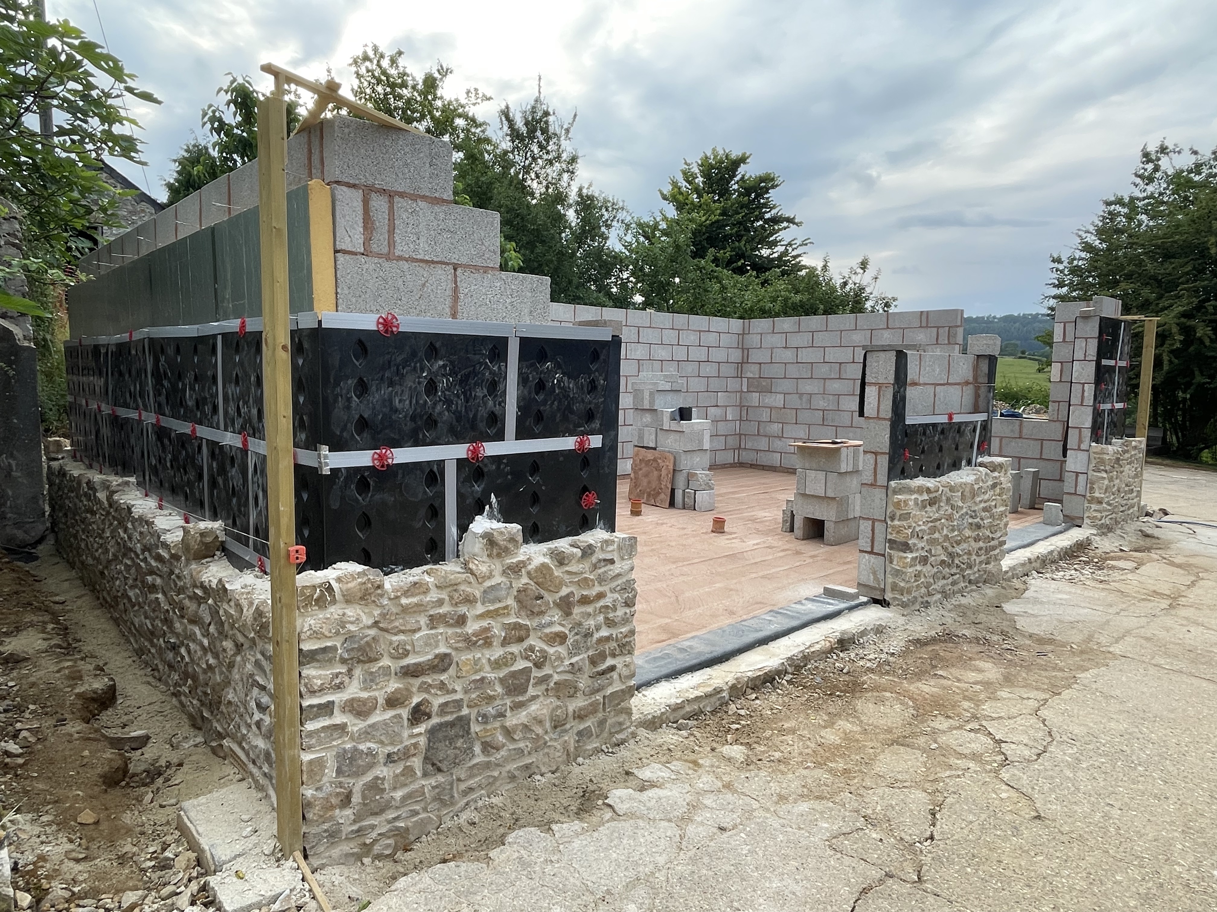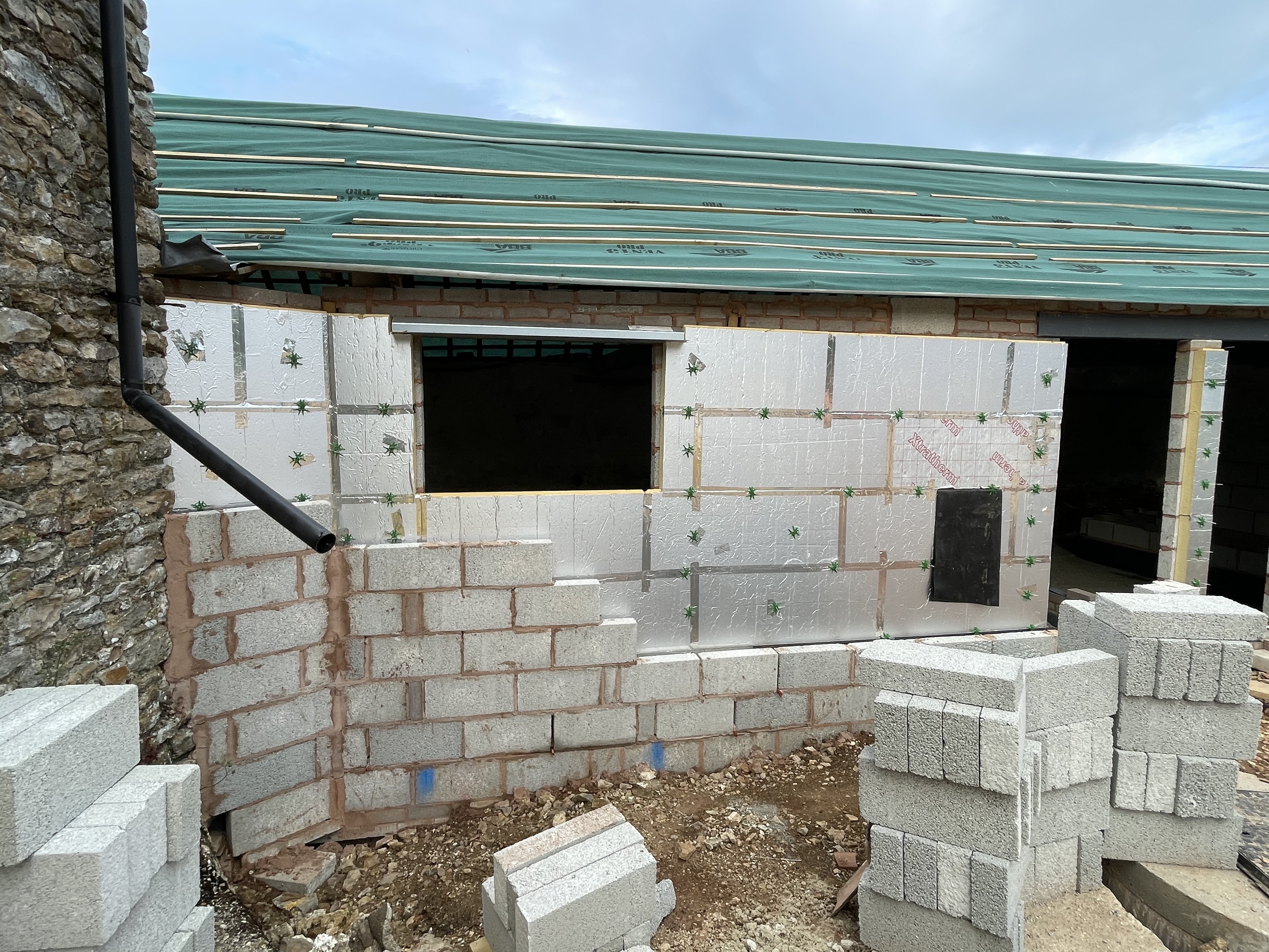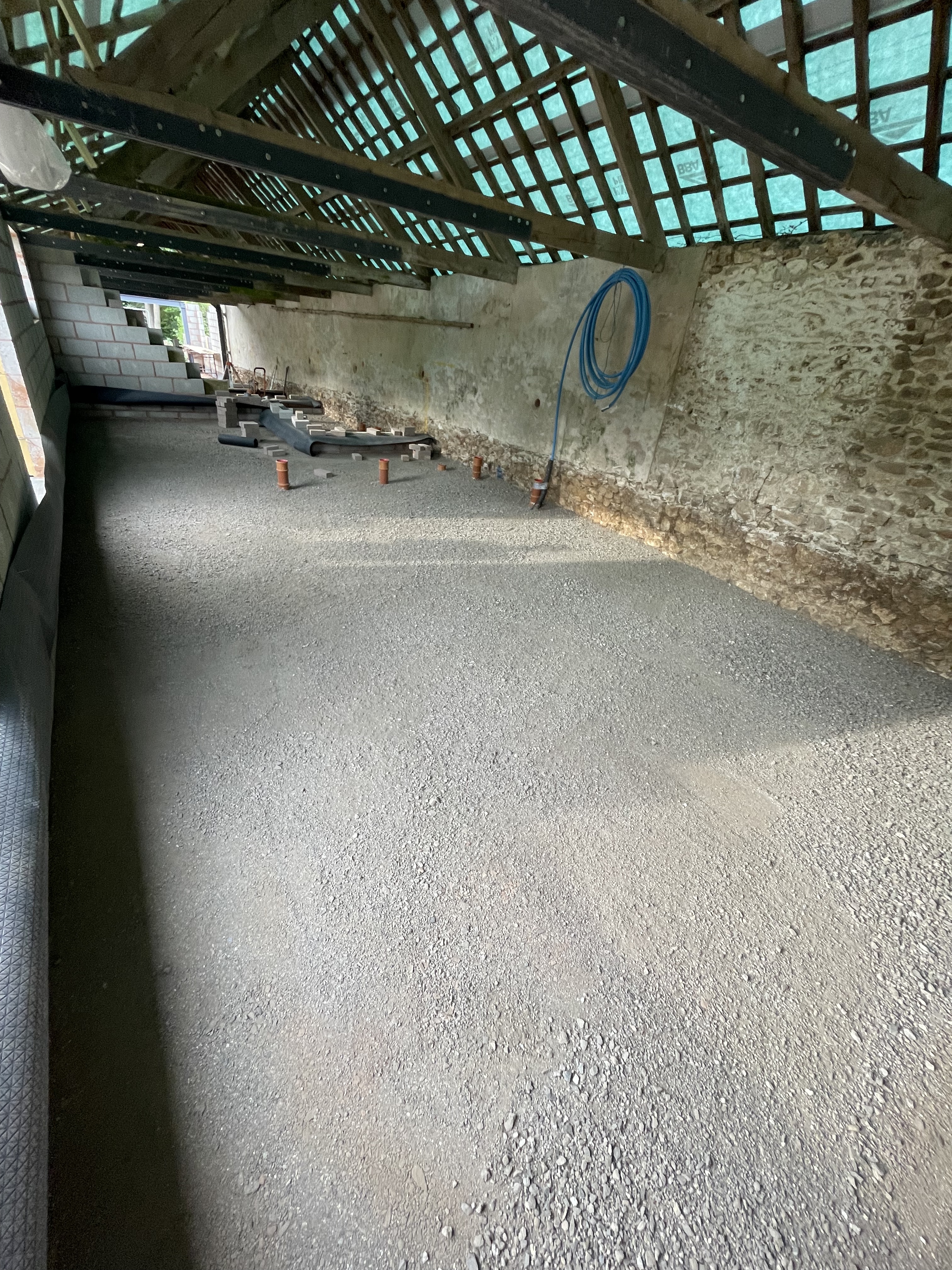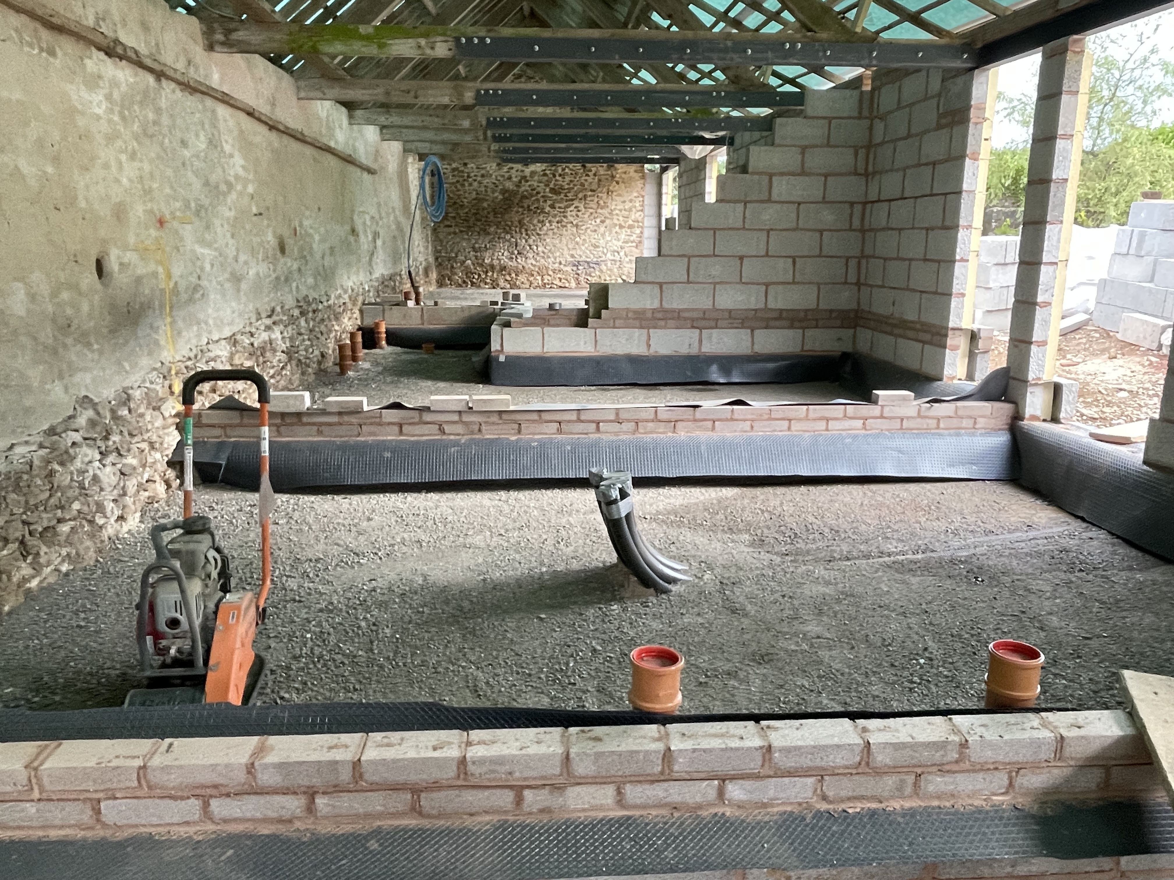 Another week of dry weather meant our builders could work uninterrupted – with the amount to be done on site, we’ve now got up to 5 builders on certain days working on different parts. They’ve finished putting insulation along the front of the shippon and have now started to build up the second layer of breeze blocks, starting from the corner next to the barn. This front wall is the only one we’re finishing with render instead of stonework to keep consistent with the original wall – although we’ve gone with a creamy buttermilk colour instead of the dirty grey we had before. We had a delivery of crushed stone this week, which our builders have laid in the one-bed cottage and in half of our new house to level the floor out. This sounds like an easy job but remember this week it reached 27 degrees – not a temperature I’d like to shovel a huge sack of stone by hand… huge respect to our builders.