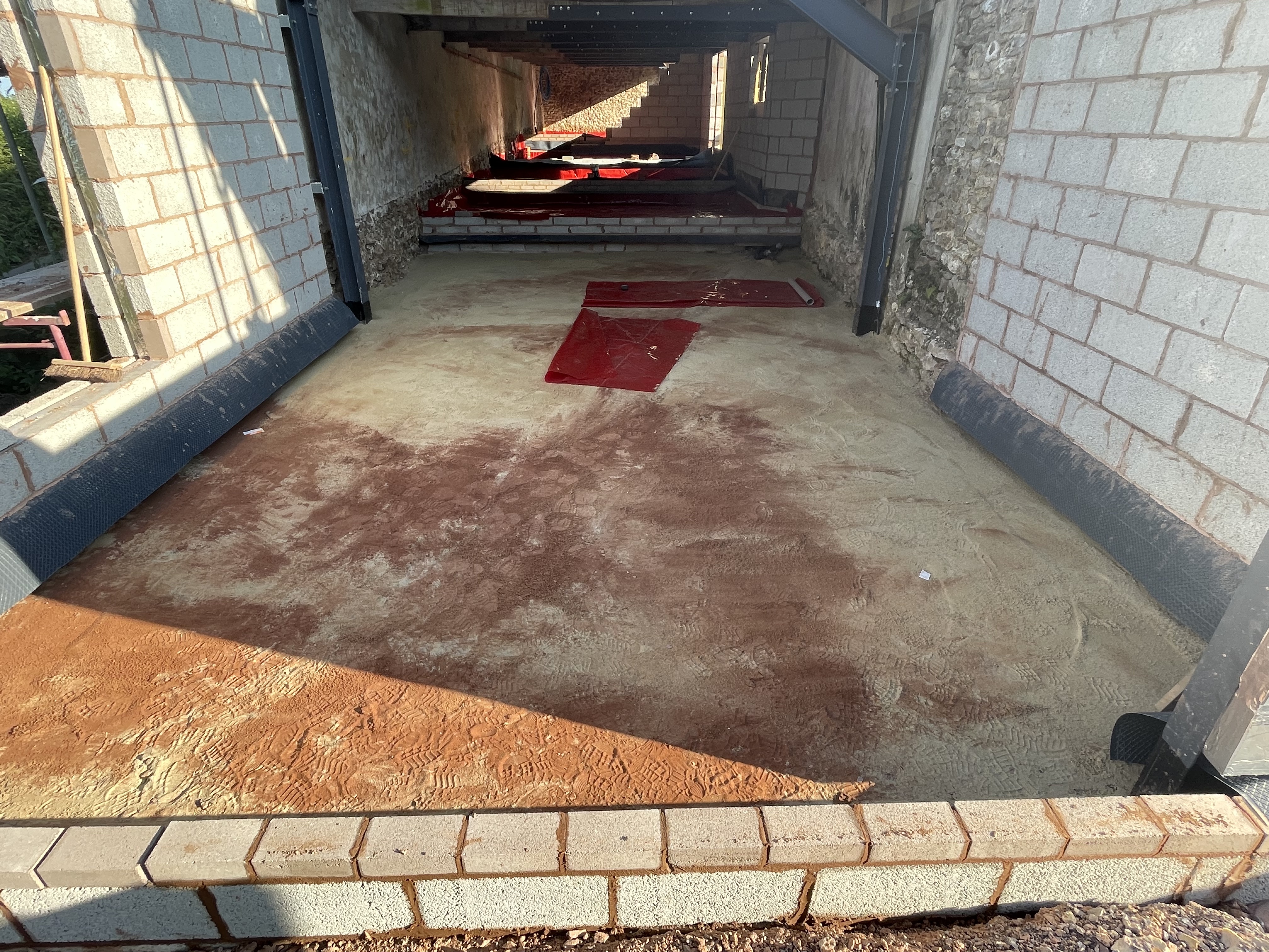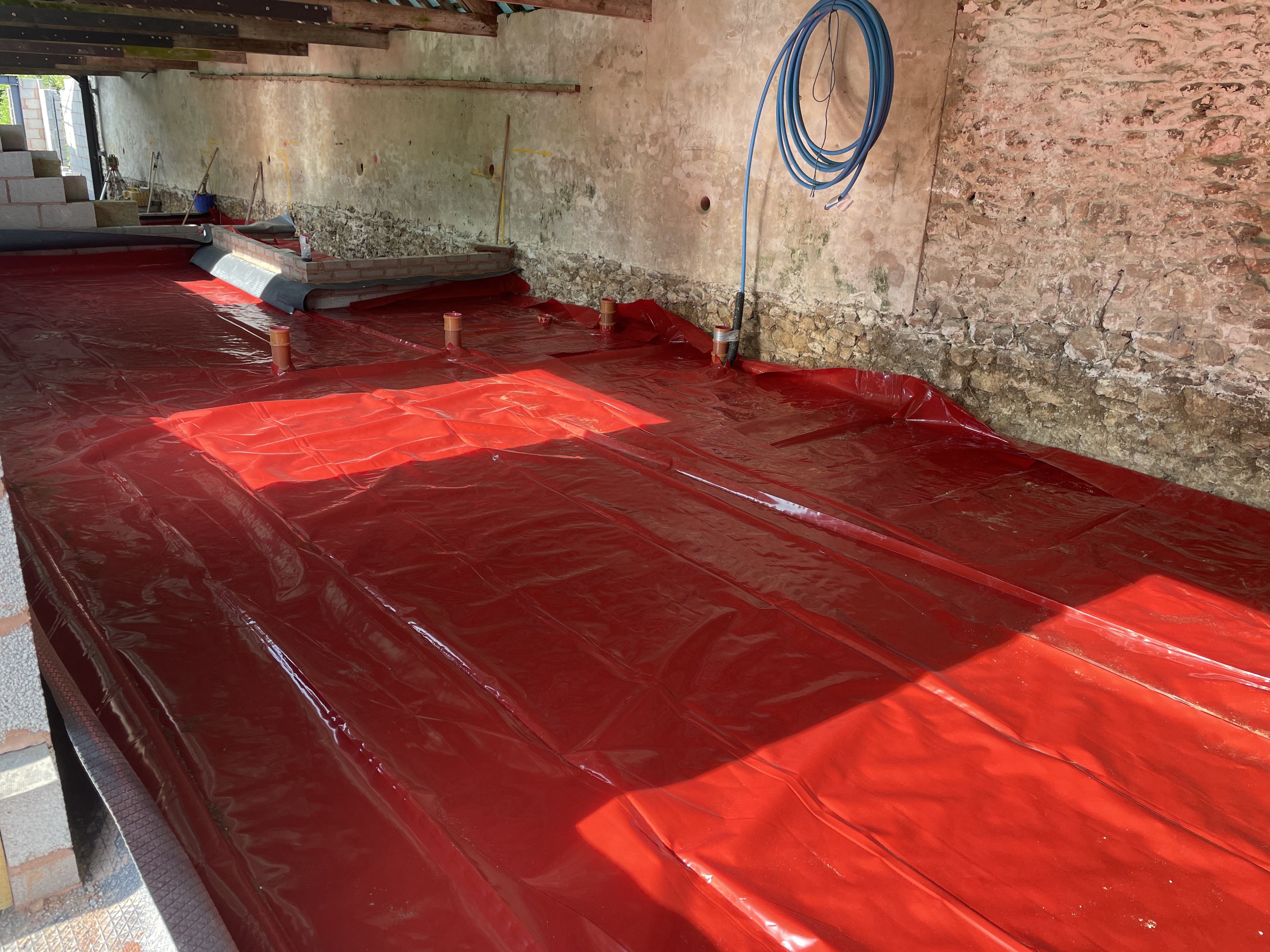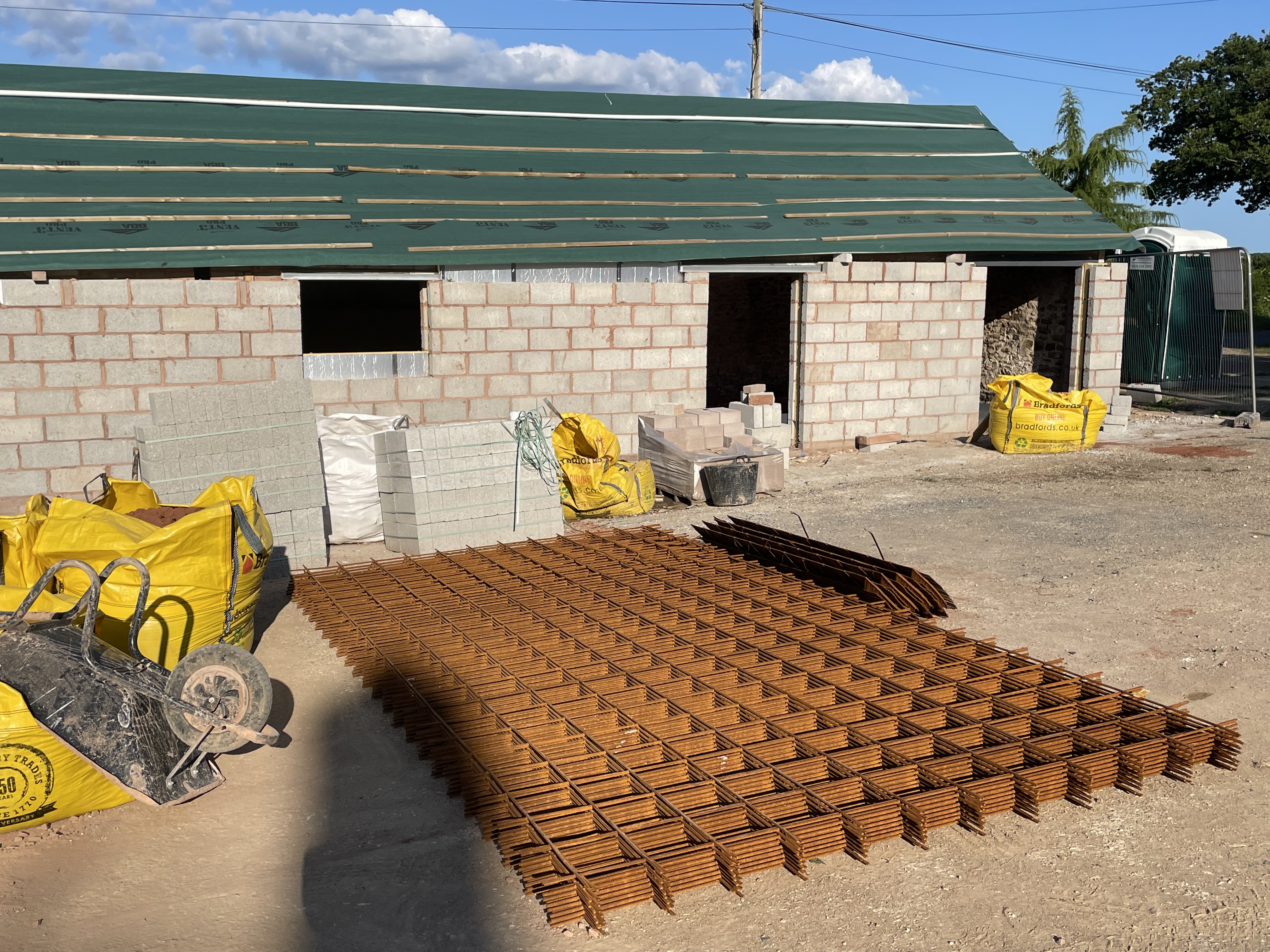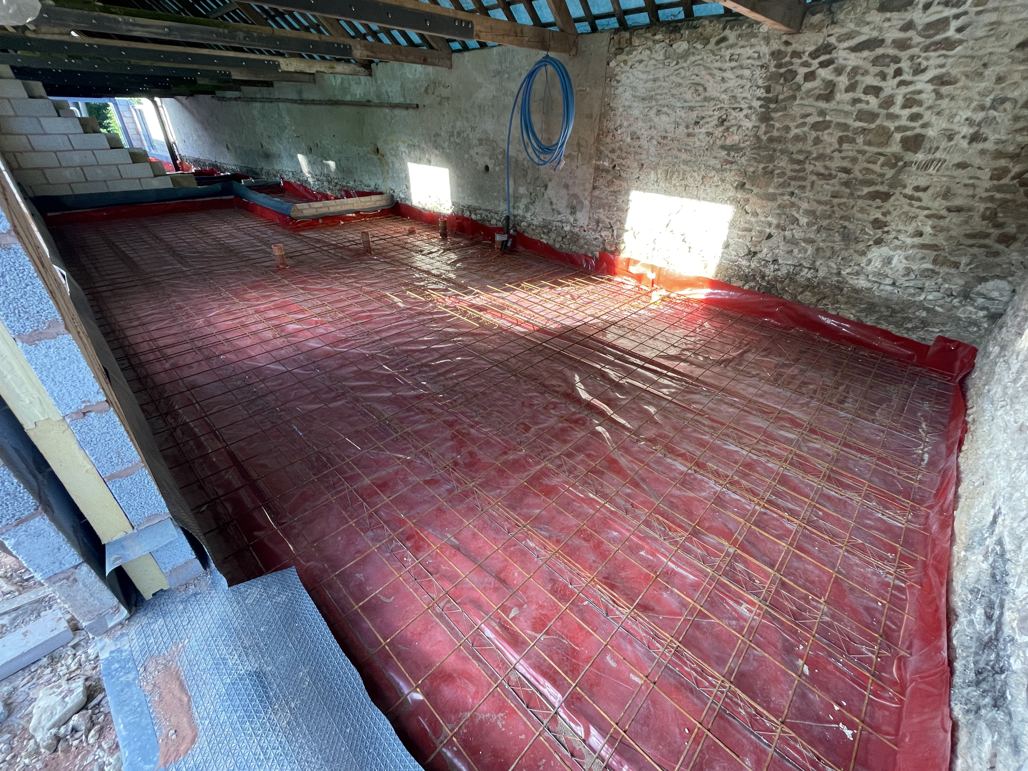 The shippon front wall is almost complete, and our builders have installed the concrete lintels over the doorways. Their next main job is to concrete the inner floor, so they’ve been flattening the floor with stone, laying red sheets that double as a radon barrier and a damp proof membrane, and then installing the reinforcing metal mesh ready to pour the concrete on. The sheets are huge so it must have taken some doing to lift each one, get them through the doorways and then put them in place. It feels like there’s a delivery of materials almost every day at the moment – whether that’s stone, brick, metal sheeting, wood or something else that’s required that day. The deliveries tend to arrive on the day the materials are used because we don’t have enough space to store them for days on end – it must be a real mission to time everything.