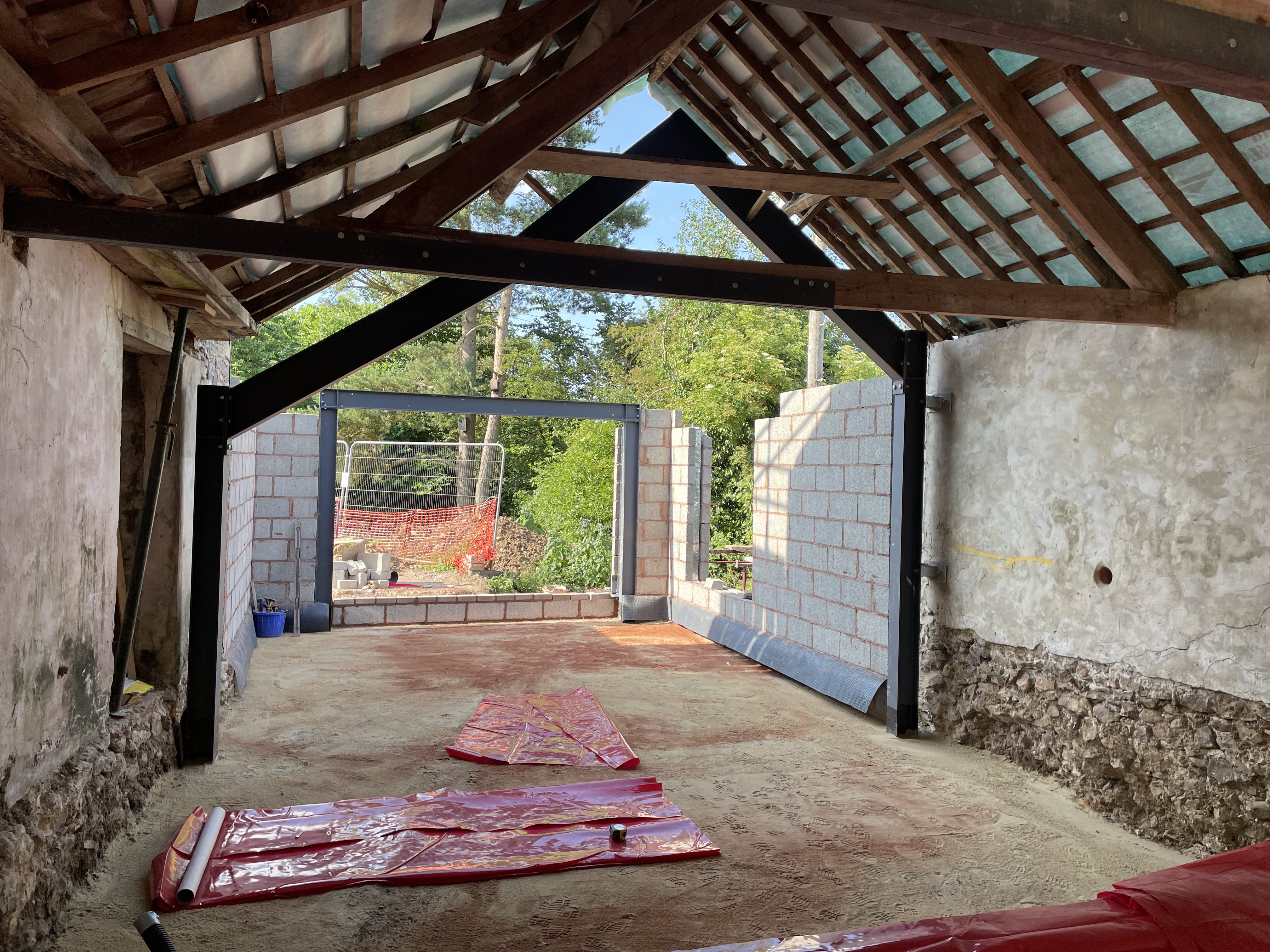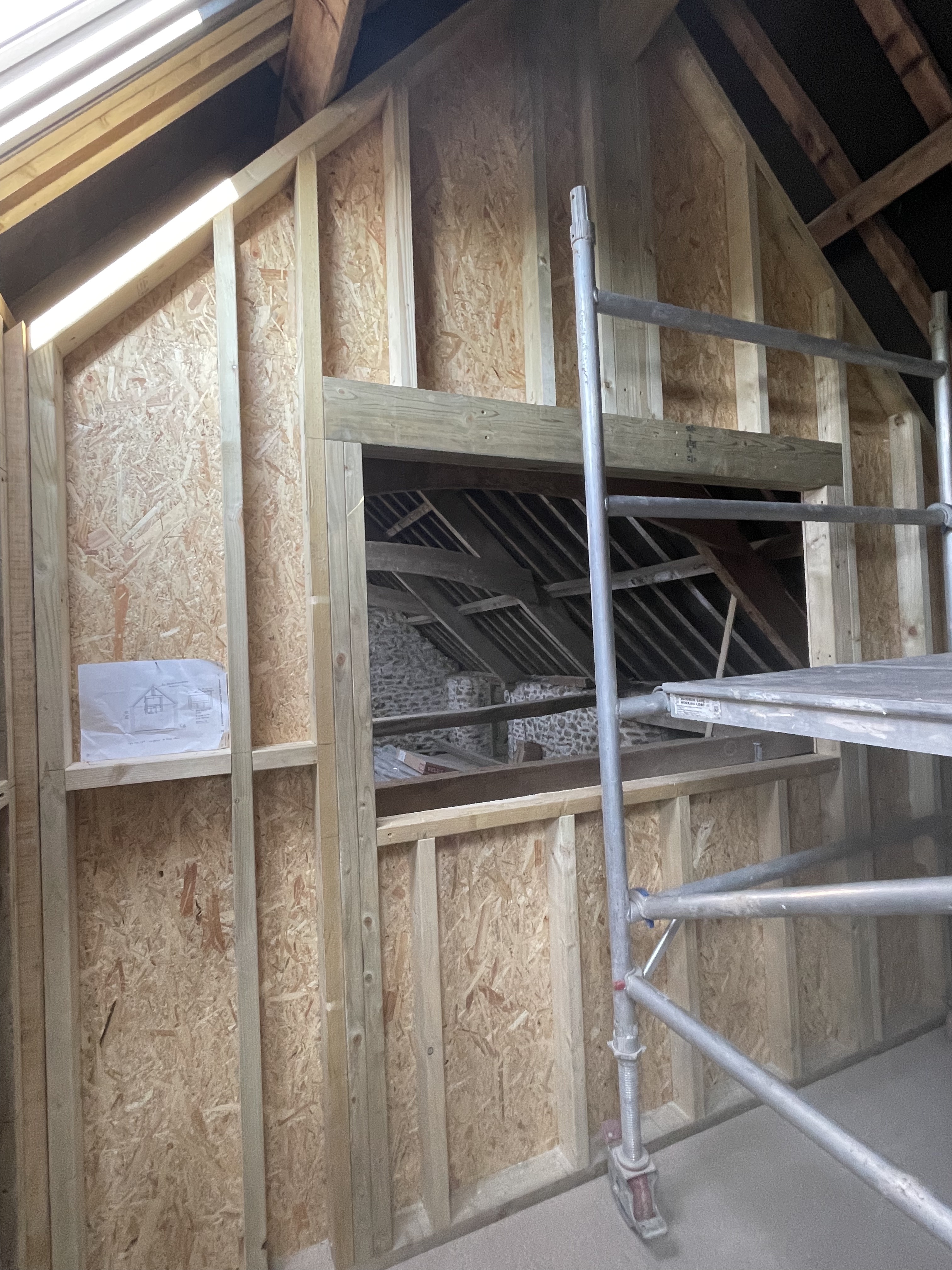 And in the old hay barn, the stud walls have now gone up at one end, so you can really visualise what the rooms are going to feel like. Although the roof lights are in, the building still won’t be fully weatherproof until we get the main windows and doors in – hopefully we’ll have a date for the windows this week.