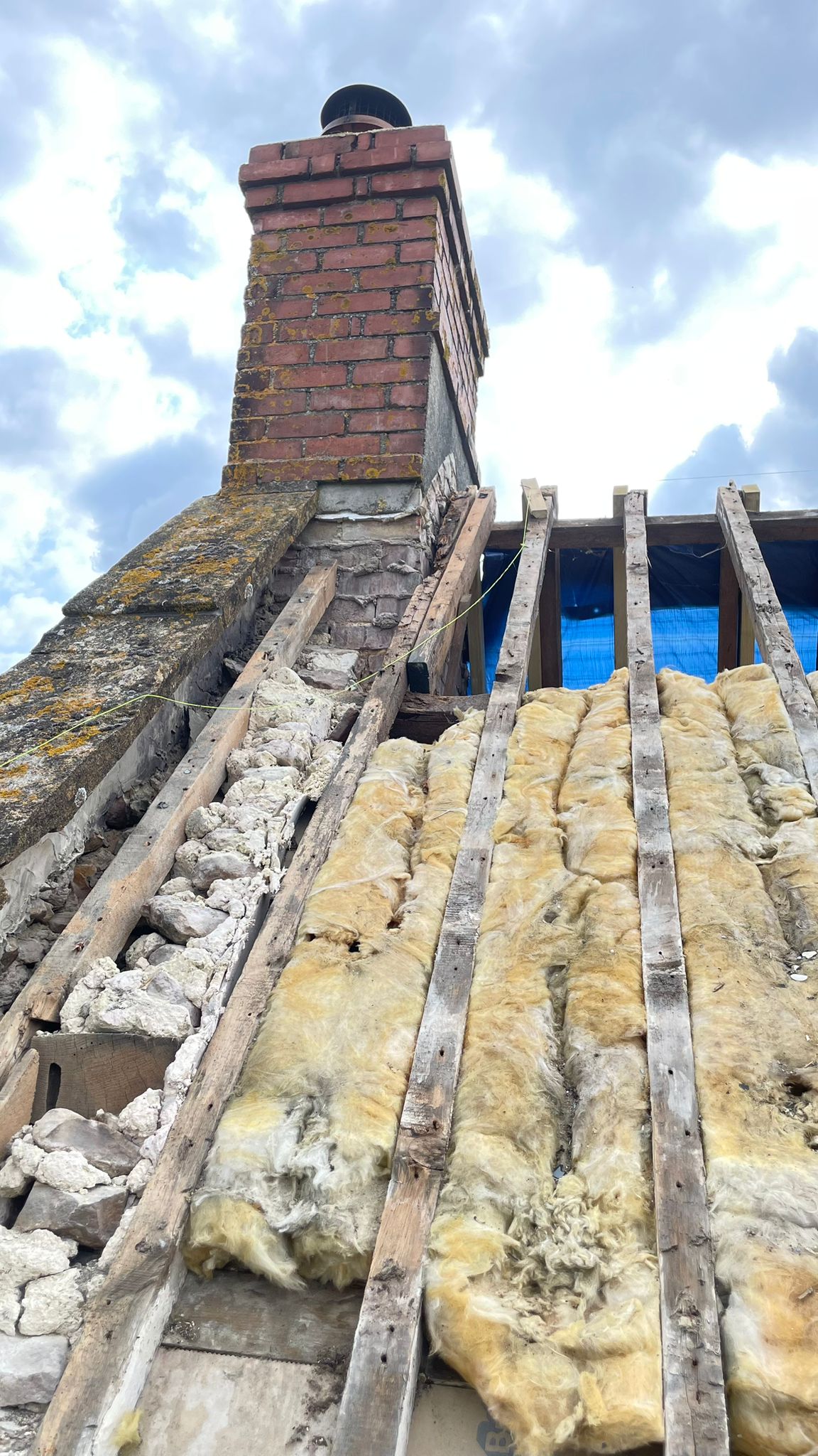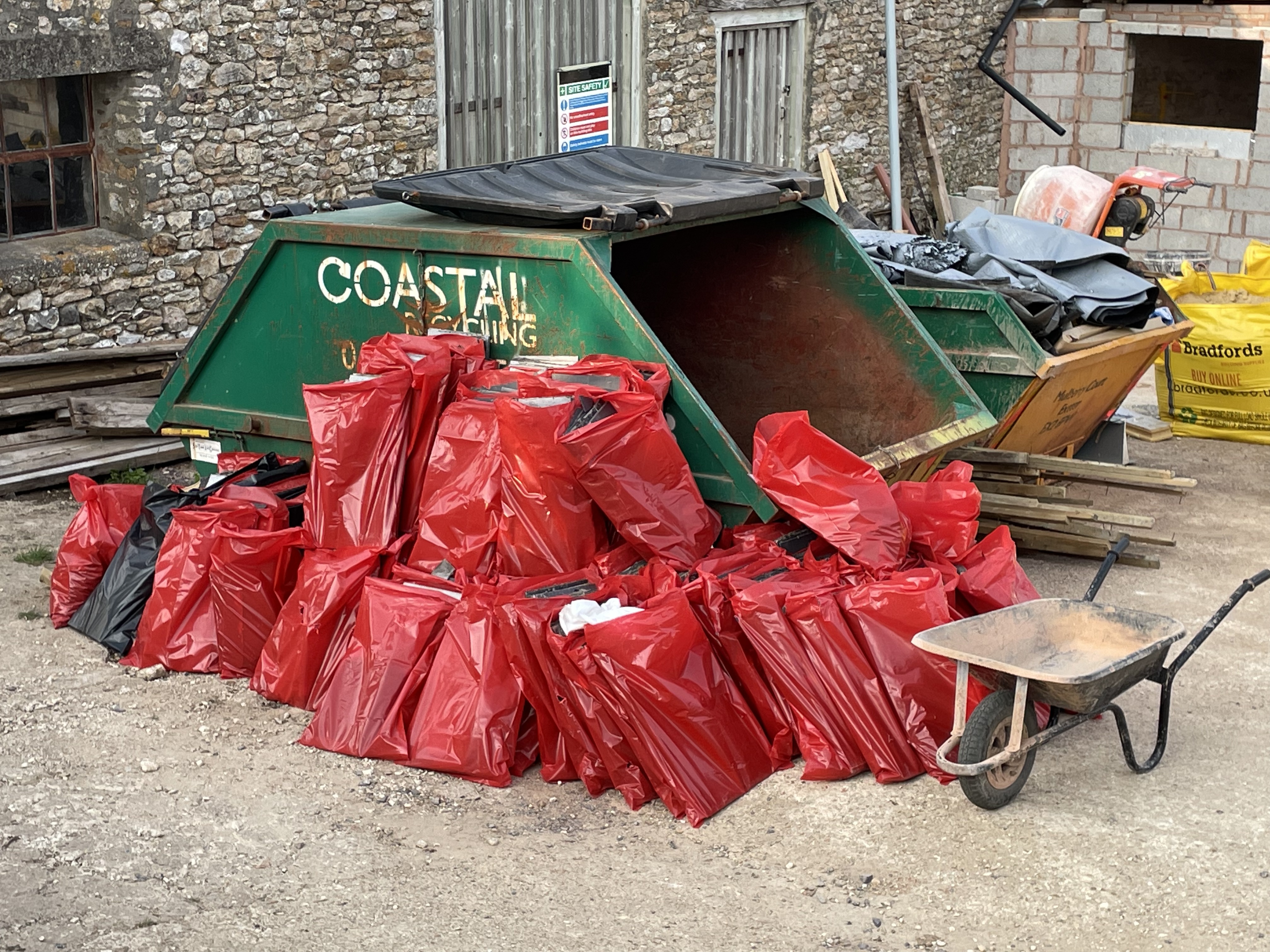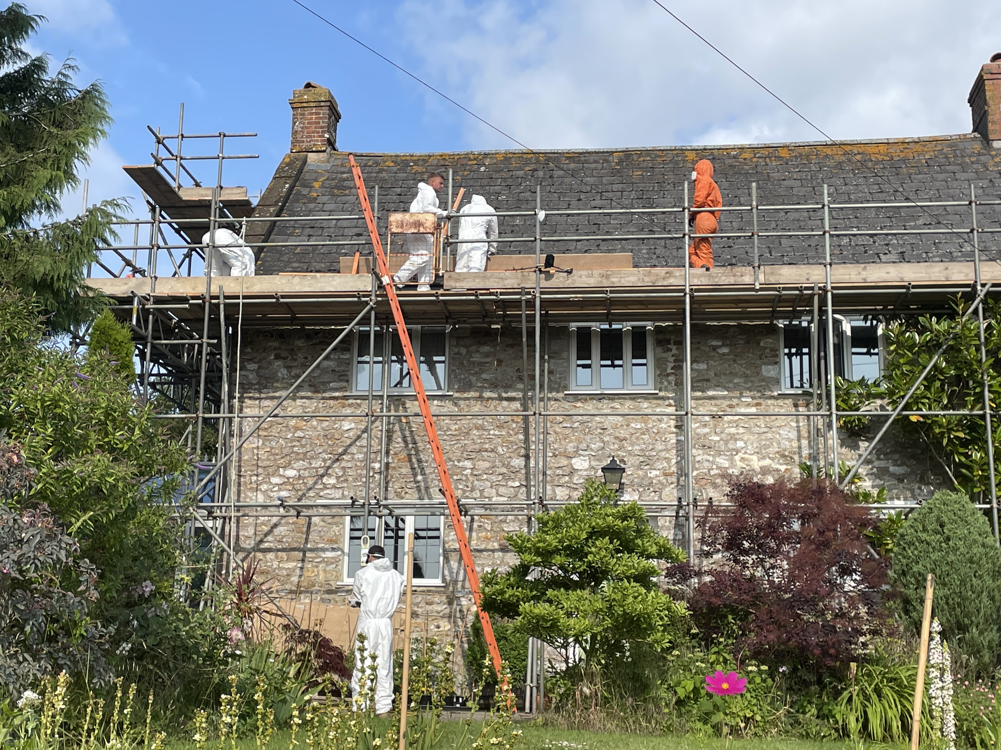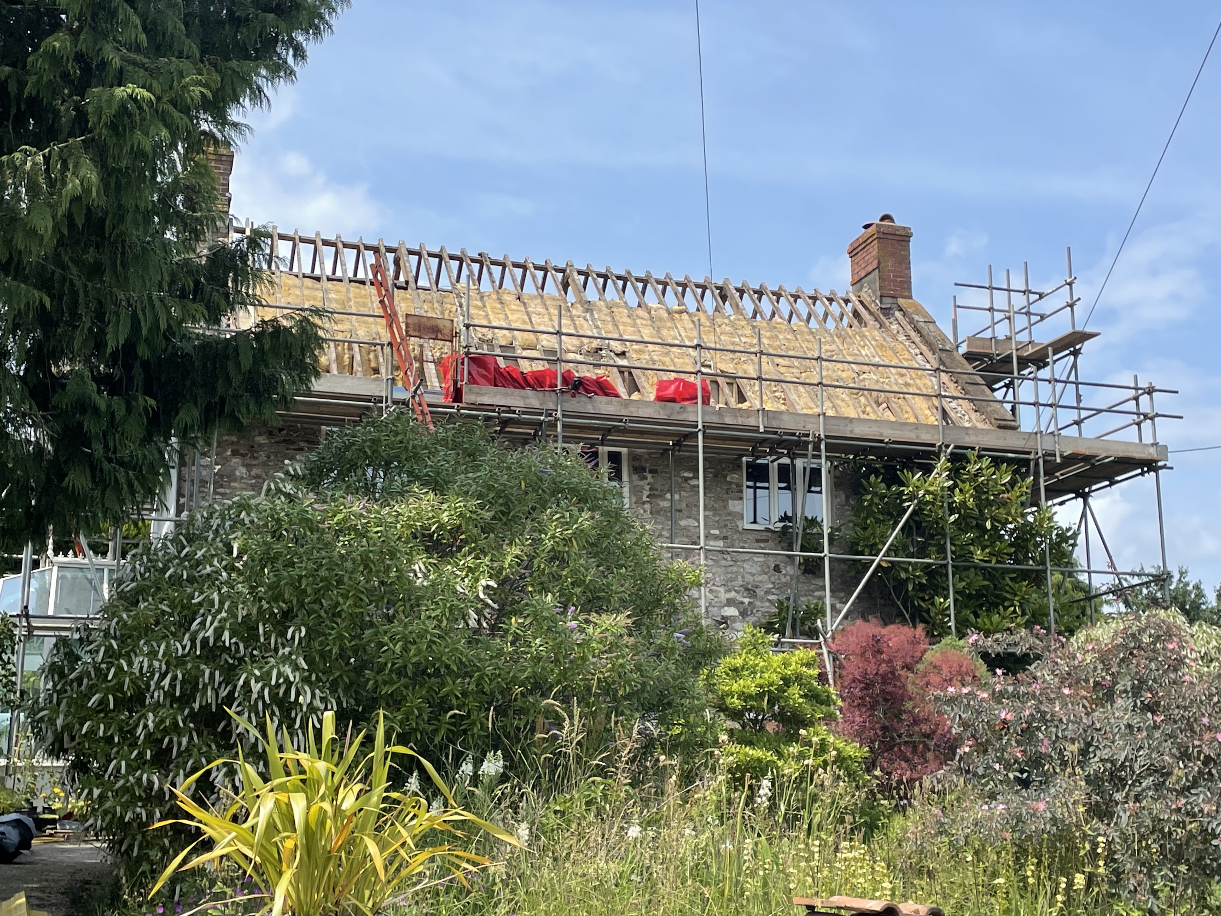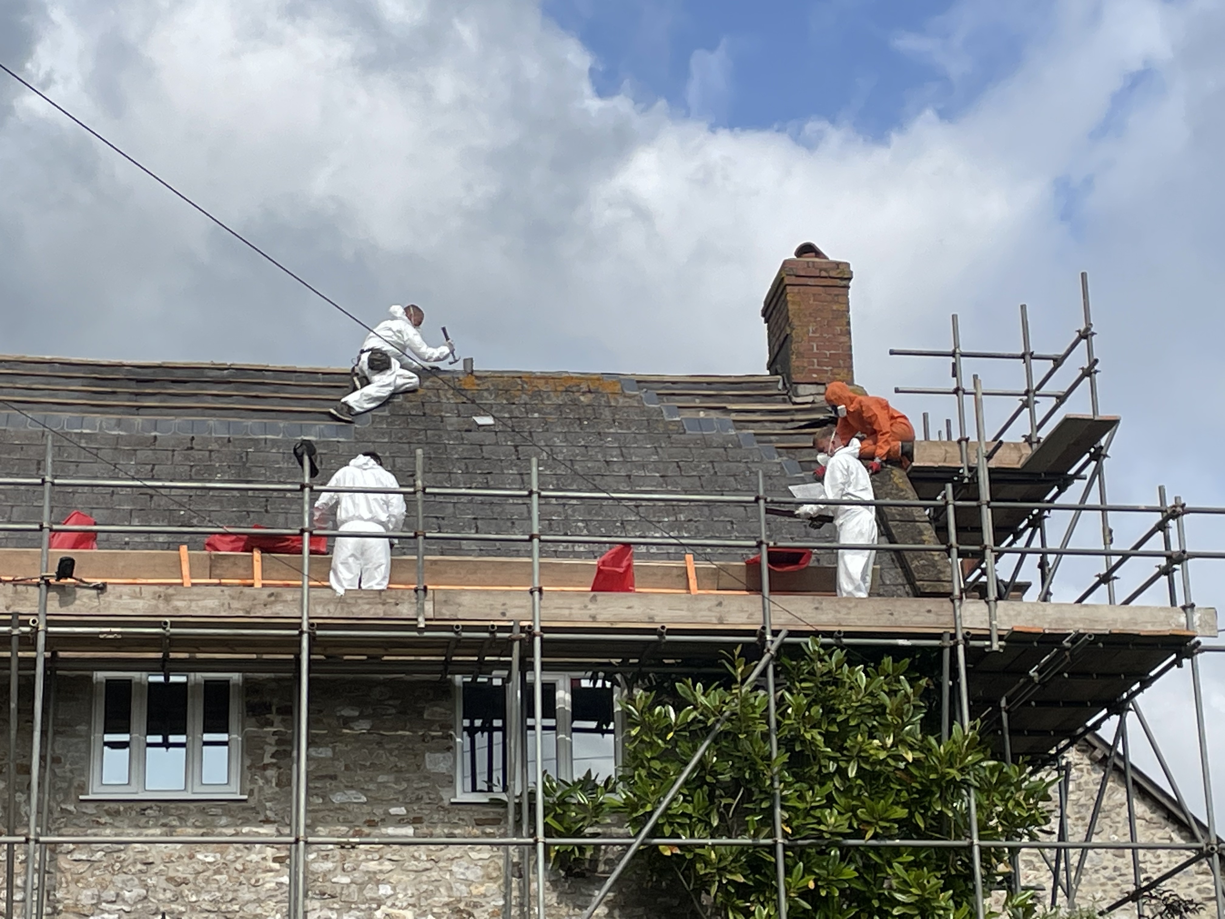 Day one started well – the roofers arrived and stripped the roof completely. They had to wear proper suits and breathing masks because of the asbestos – it was quite disconcerting working at the dining table and seeing white and orange-suited people going up and down the scaffolding ladder all day! The tiles were hauled down in bundles – most of which made it down in one piece – a couple weren’t balanced properly and tipped their contents over the tomato plants which we promptly moved!