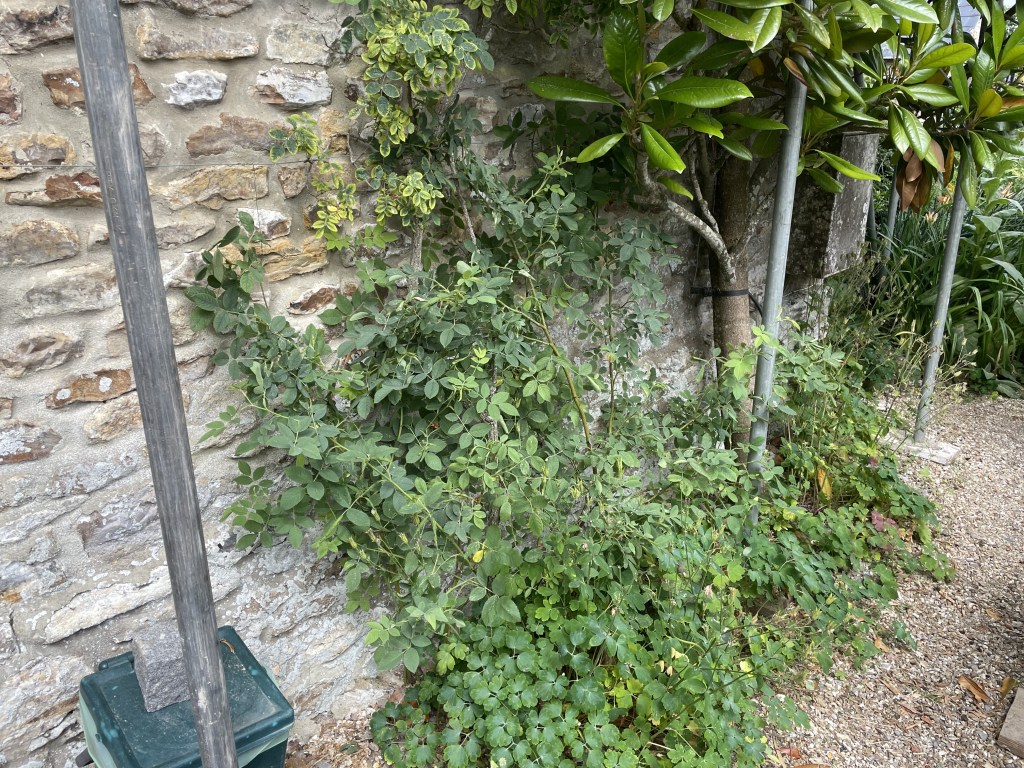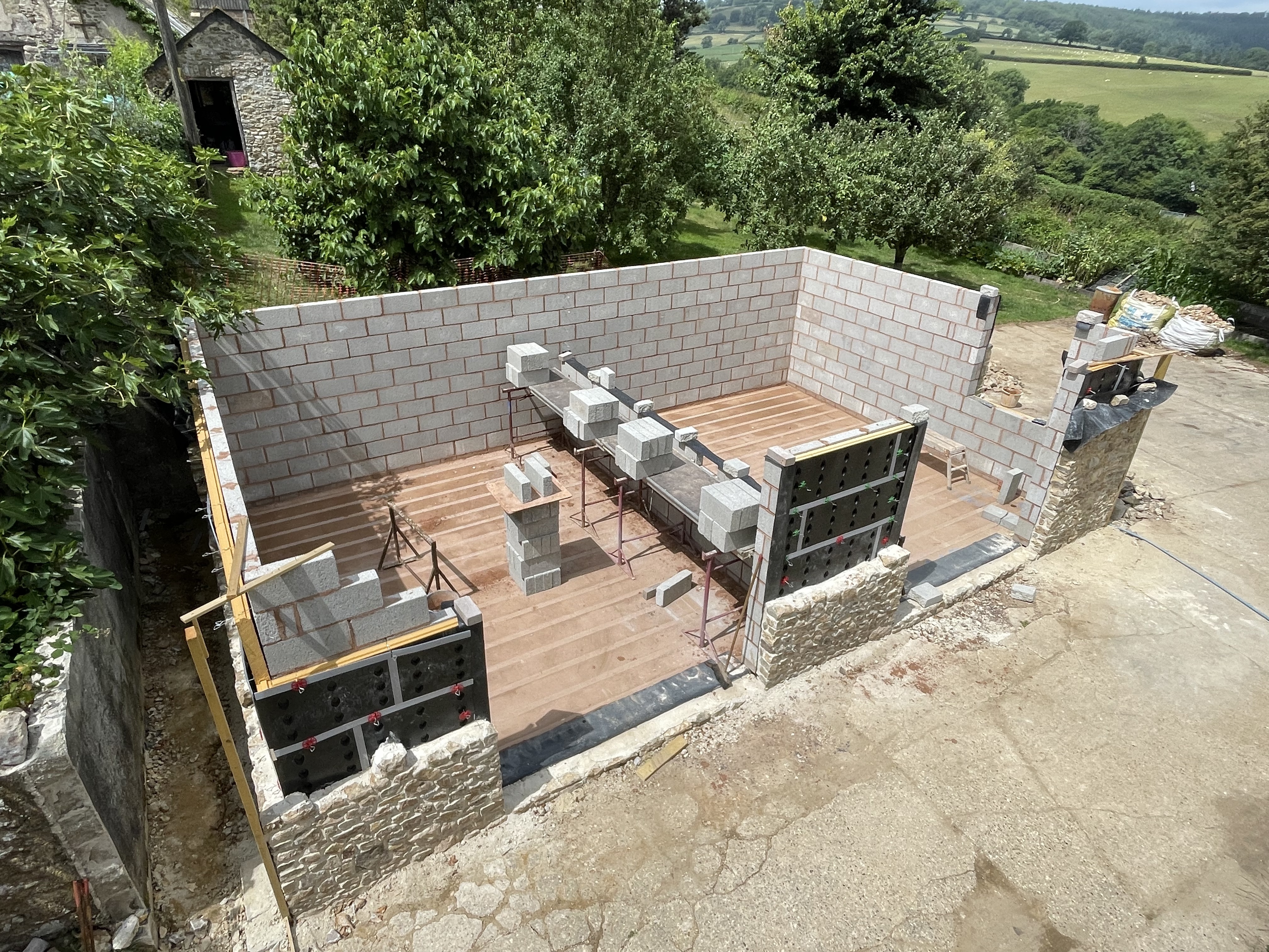 We now have two stonemasons working on our garage building, and they’re making real progress, having completed the back and most of a side wall up to first floor height. The internal wall is going in too – once they’ve finished the ground floor walls, the building should be strong enough to put the first floor joists in, and then build the first floor walls. It’s incredible to see their workmanship – every stone perfectly shaped and slotted in.
