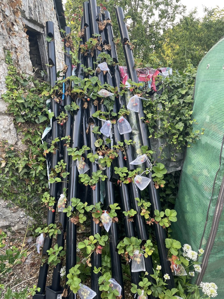 2. Bad luck about the farmhouse roof beams but great to see such progress on all fronts. Your squash arch is an inspiration. In our experience strawberries and birds (and mice and squirrels) do not mix and bagging individual berries looks extraordinarily hard work. Netting seems a more promising option.