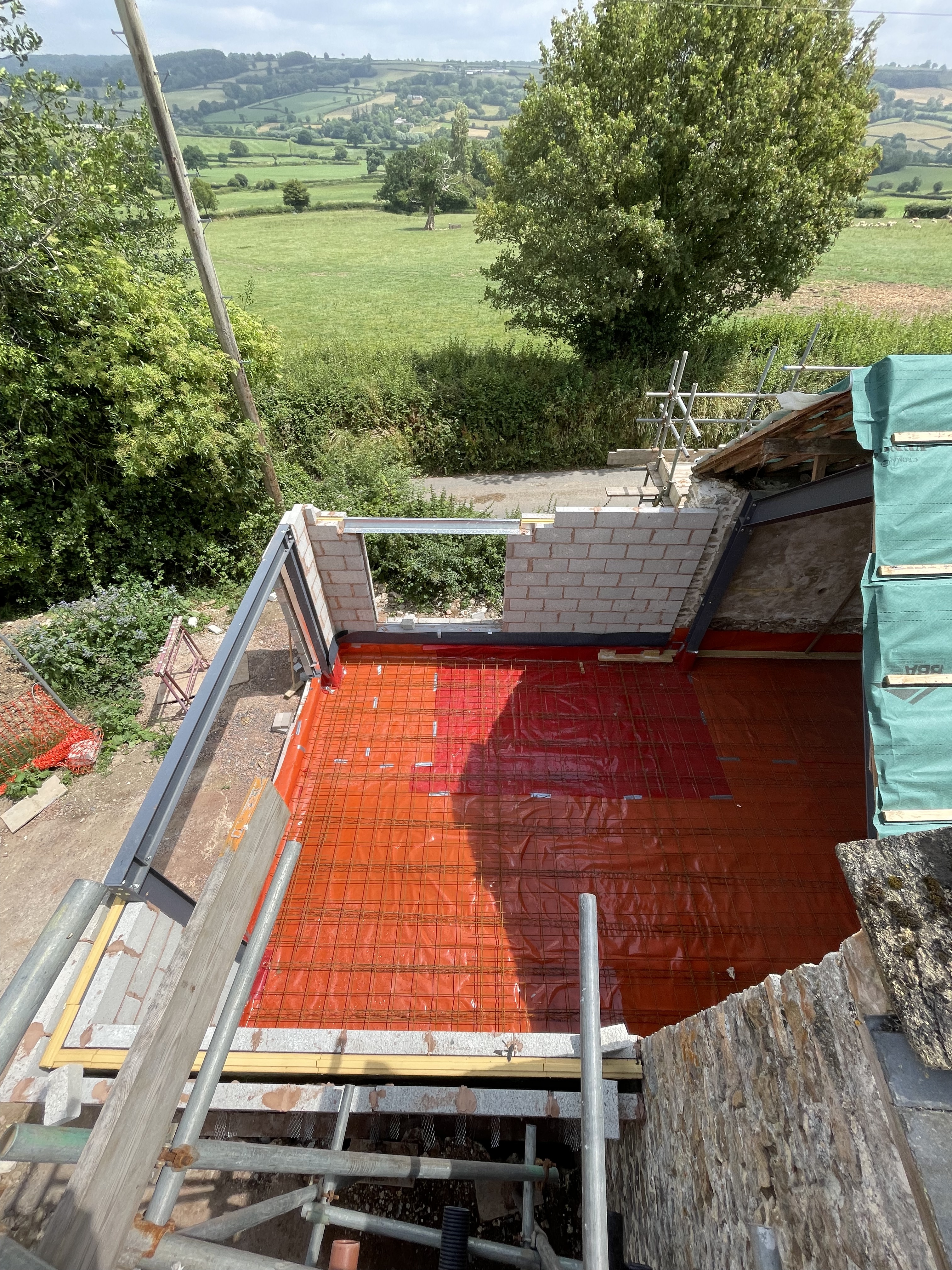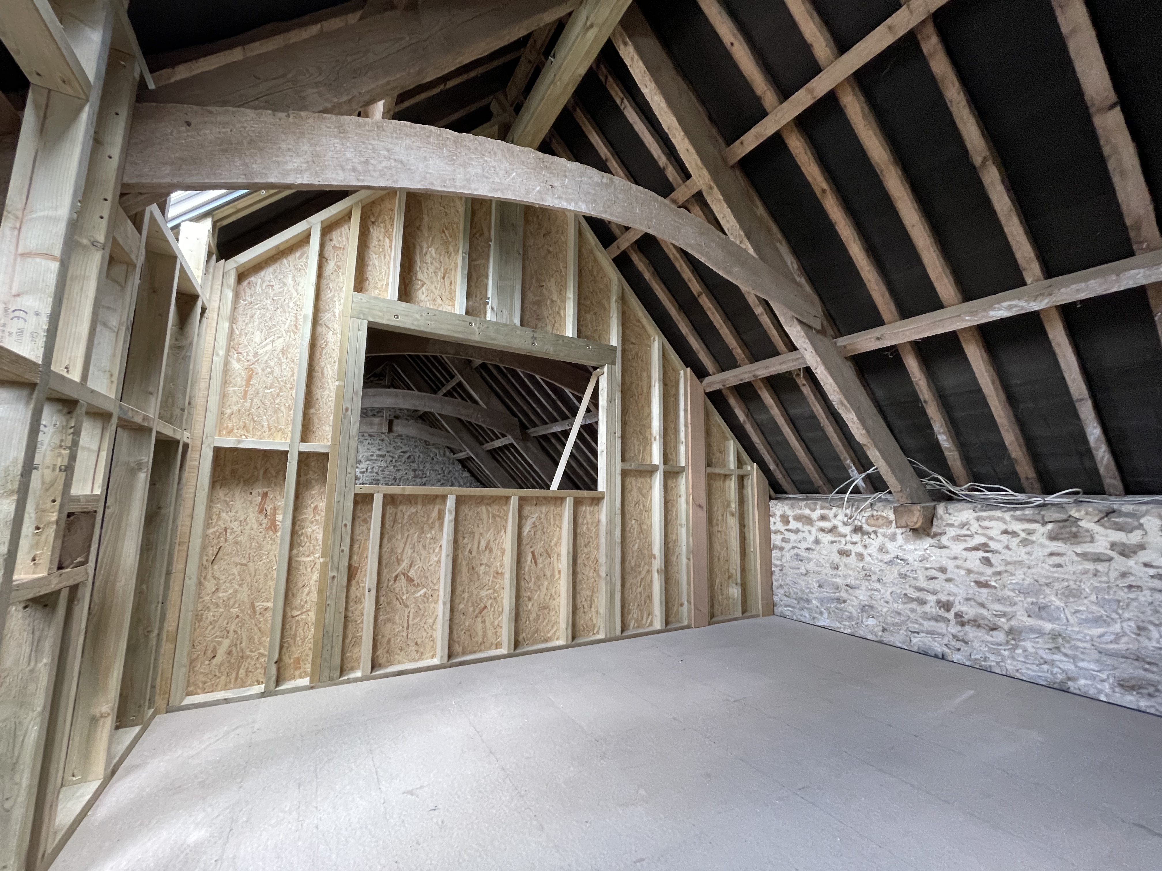 In our new house in the shippon, all the wood shuttering is ready for concreting – which is due this week. The steel lintel has also gone into our window frame – it’s getting easier to visualise what the room will look like now all the walls are in place. And despite working hard on the farmhouse roof, our joiner has found time to finish the left-hand upstairs room in the main barn – the roof tie that cut across the room has now been removed, and the room is taking shape.